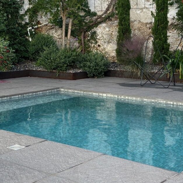 La piscine en raison des règles d’urbanisme est trop petite par rapport avec la surface de la terrasse extérieure en béton gris lissé.