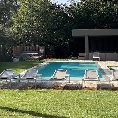 La réalisation du bassin aquatique avec la passerelle en bois exotique, le garde-corps en inox avec des câbles comme un rappel à l’univers de la voile.