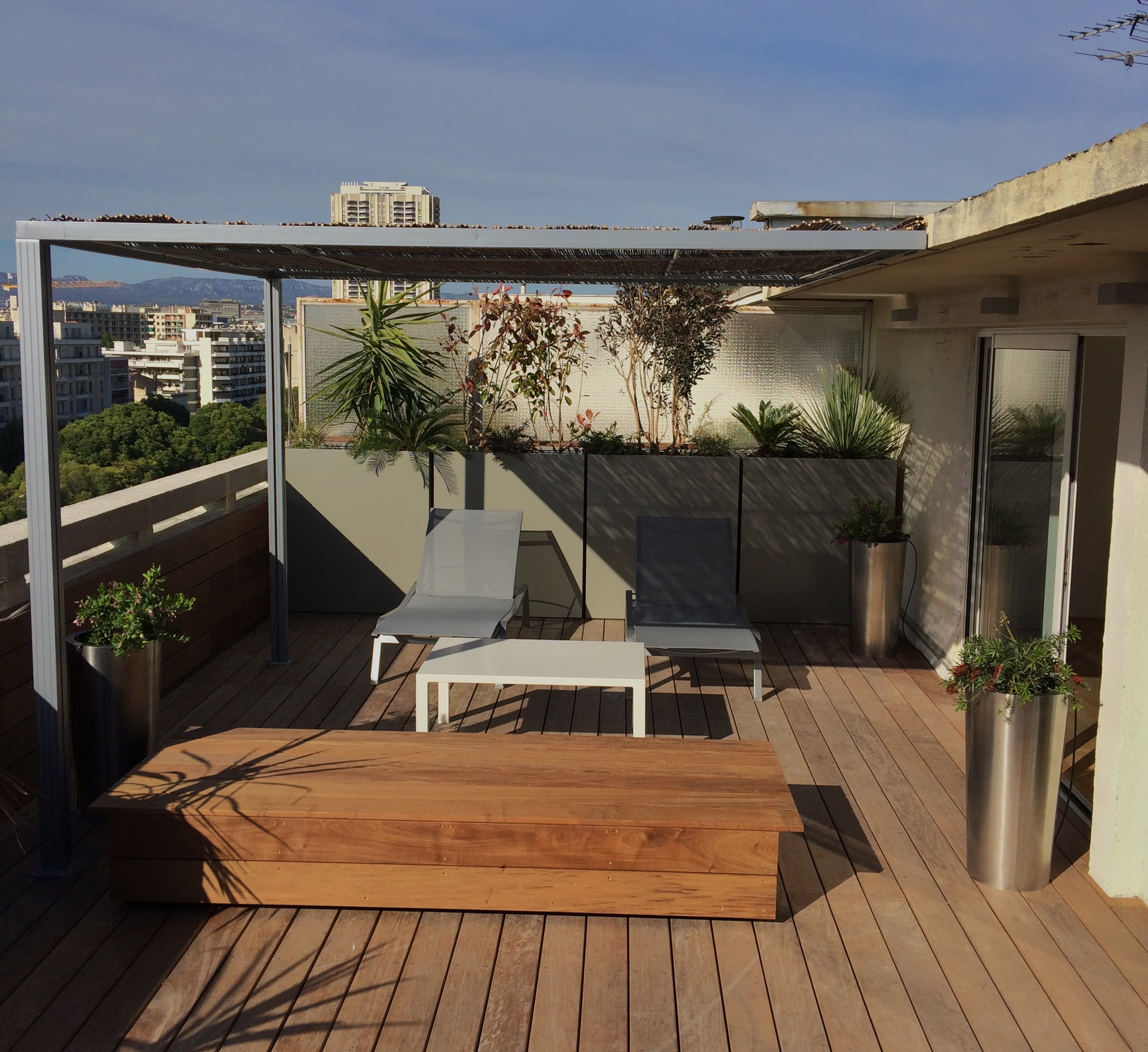 DétailsAménager une terrasse en plein ciel au 12 éme étage d’un immeuble au Prado à Marseille Un pari technique d’acheminer tous les matériaux de cette terrasse sur l’avenue du Prado à Marseille nécessitant l’emploi d’une grue. Nous avons installé une pergola pour se protéger du soleil et de la chaleur, des chaises longues, une table…