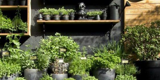 Ce balcon est décoré et aménagé comme une bibliothèque de verdure, des étagères de bois sur un fond gris, des panneaux pour ranger les outils qui deviennent comme des sculptures, une grande table basse, un banc devant.