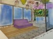 Des bacs en acier sur la gauche plantés de bambous noirs, un grand miroir pour donner l’illusion d’espace, un banc, une table basse.