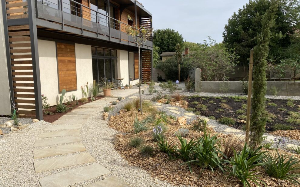 X Réalisation du Jardin sec d’une maison bio climatique à Villeneuve les Avignon. Une maison des années 70 entièrement repensée…