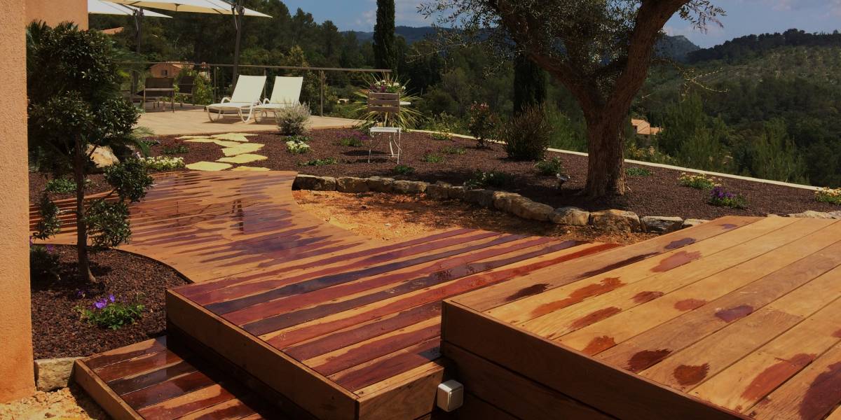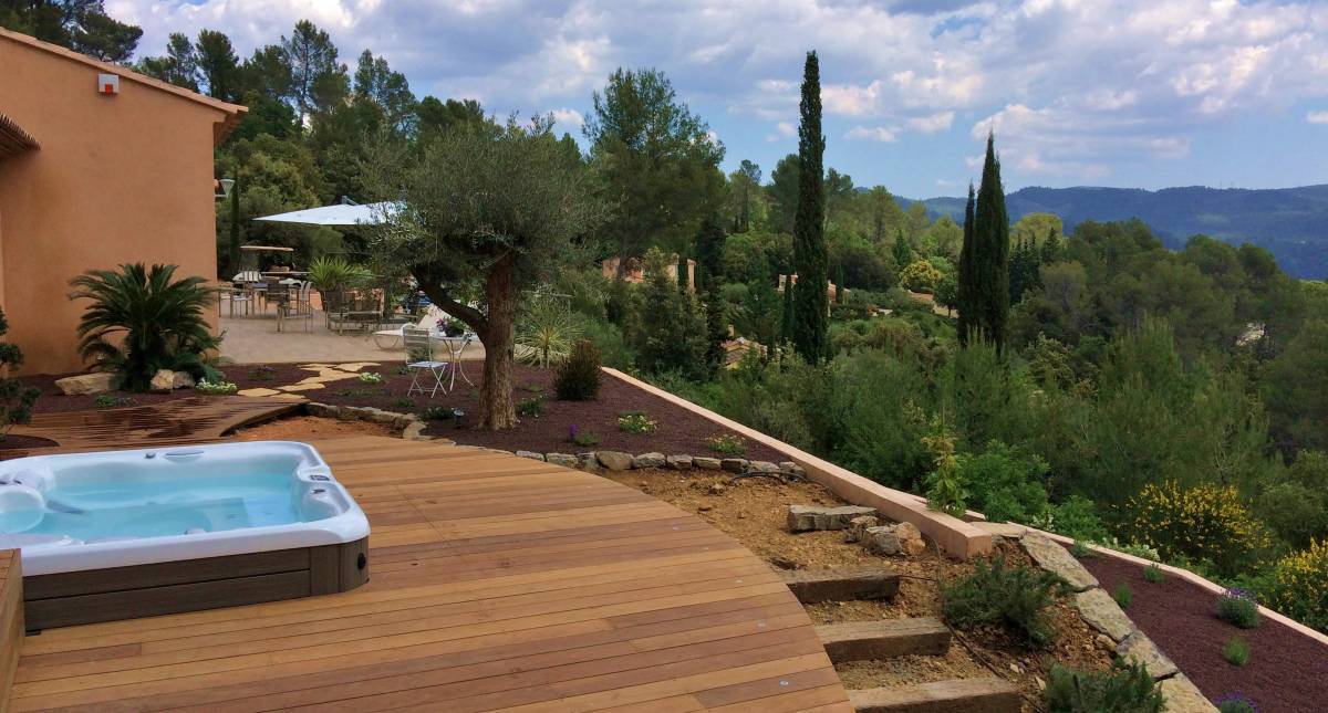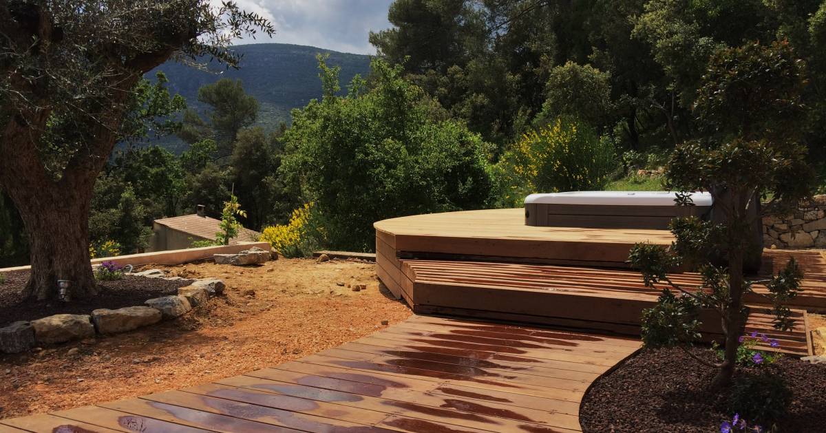 L’utilisation de trois niveaux en bois exotique permet d’atténuer la hauteur du spa et d’optimiser les cheminements :