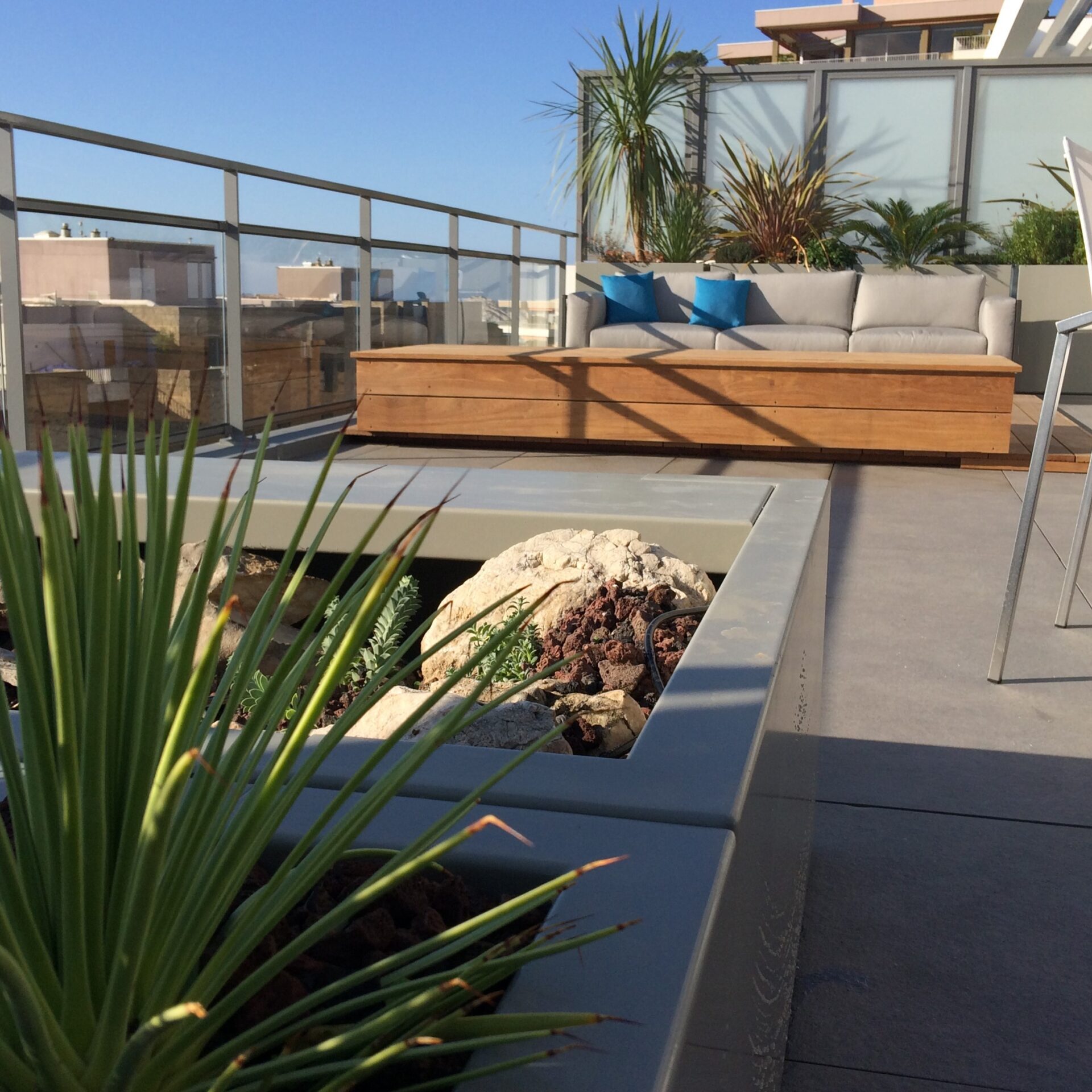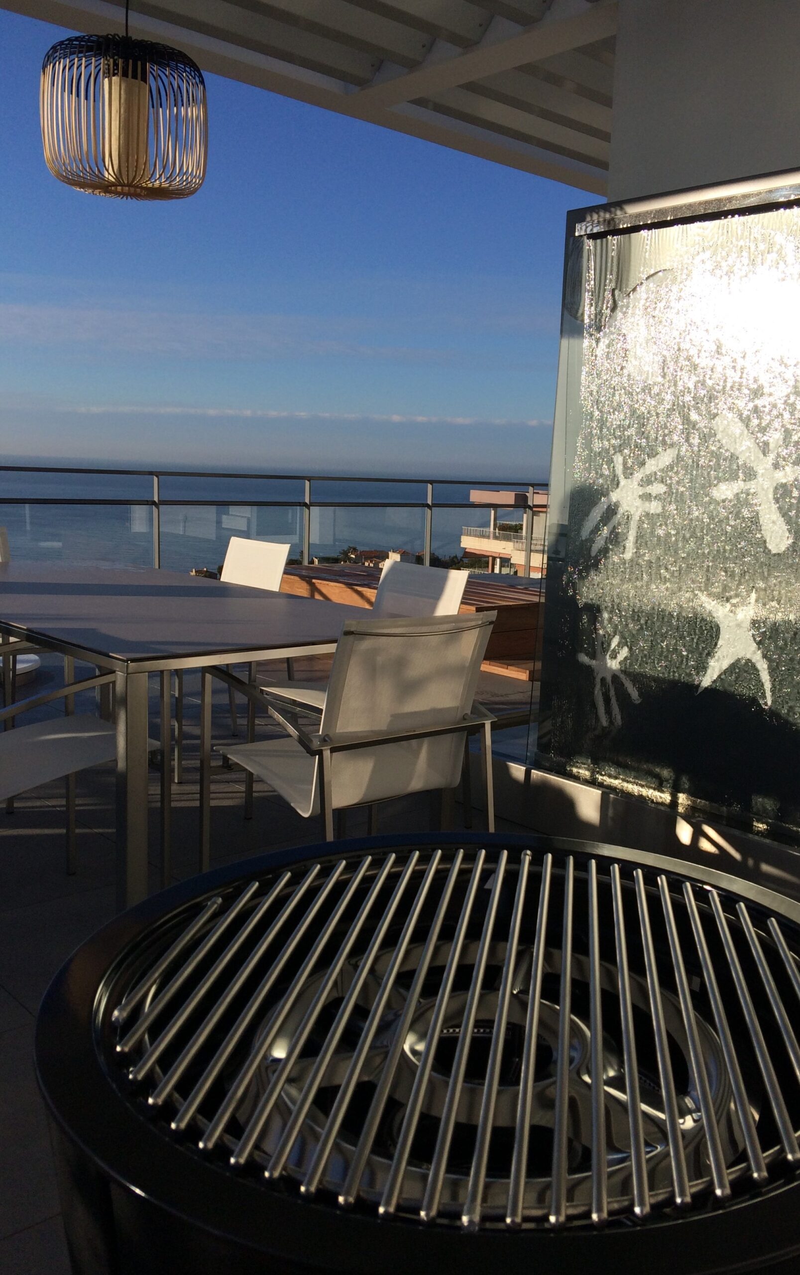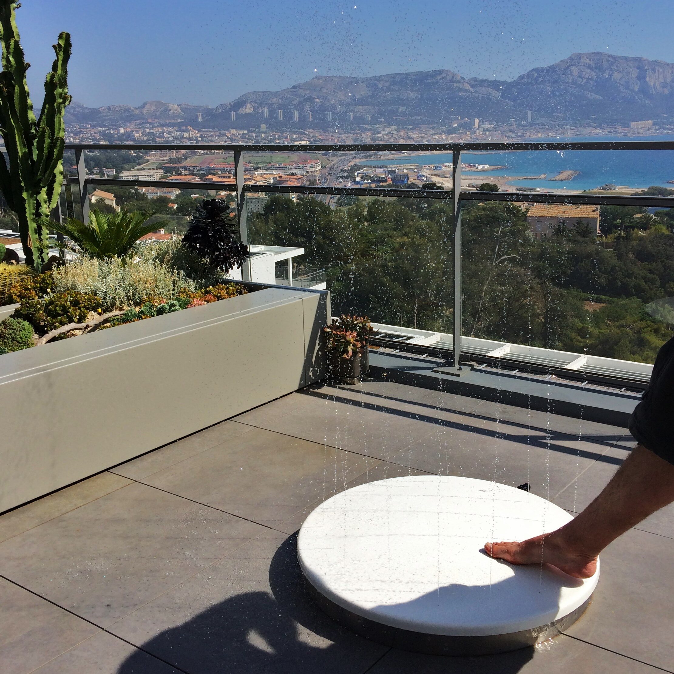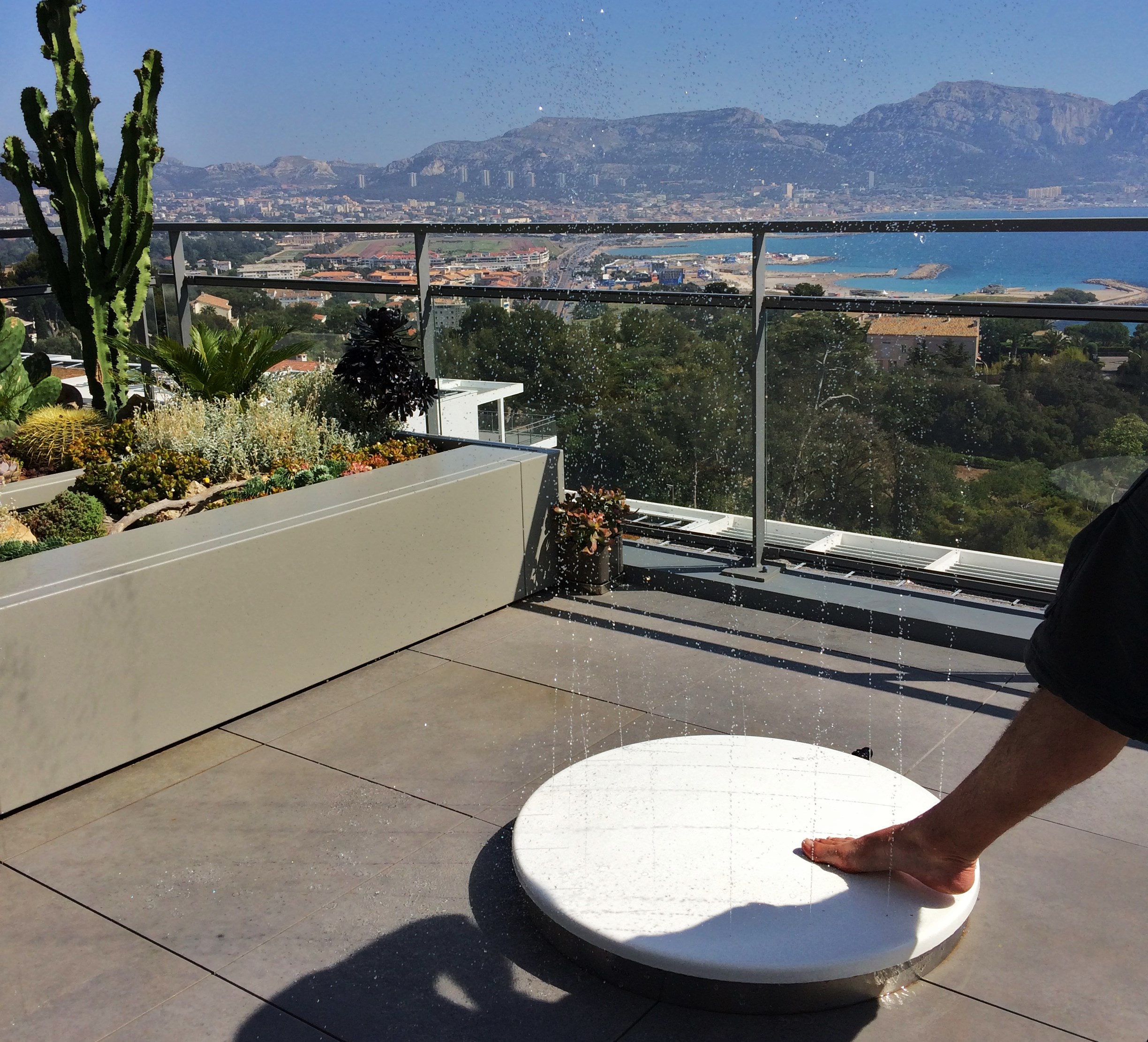 Une approche minimaliste dont chaque élément a fait l’objet d’un design sur mesure, les bacs et jardinières, le mur d’eau, la sélection de mobilier d’extérieur et d’accessoires design en harmonie avec l’architecture du programme immobilier, des couleurs de la mer et du ciel.