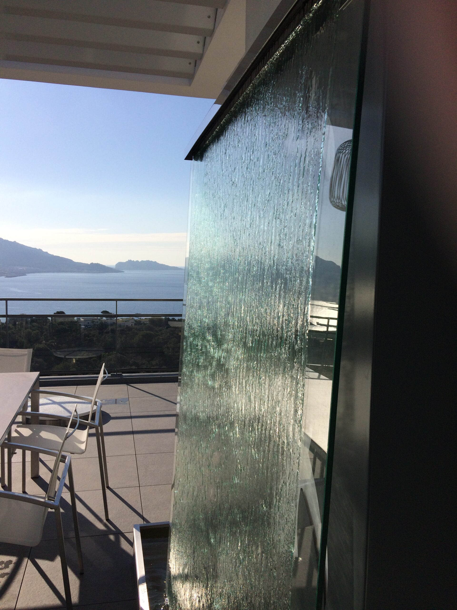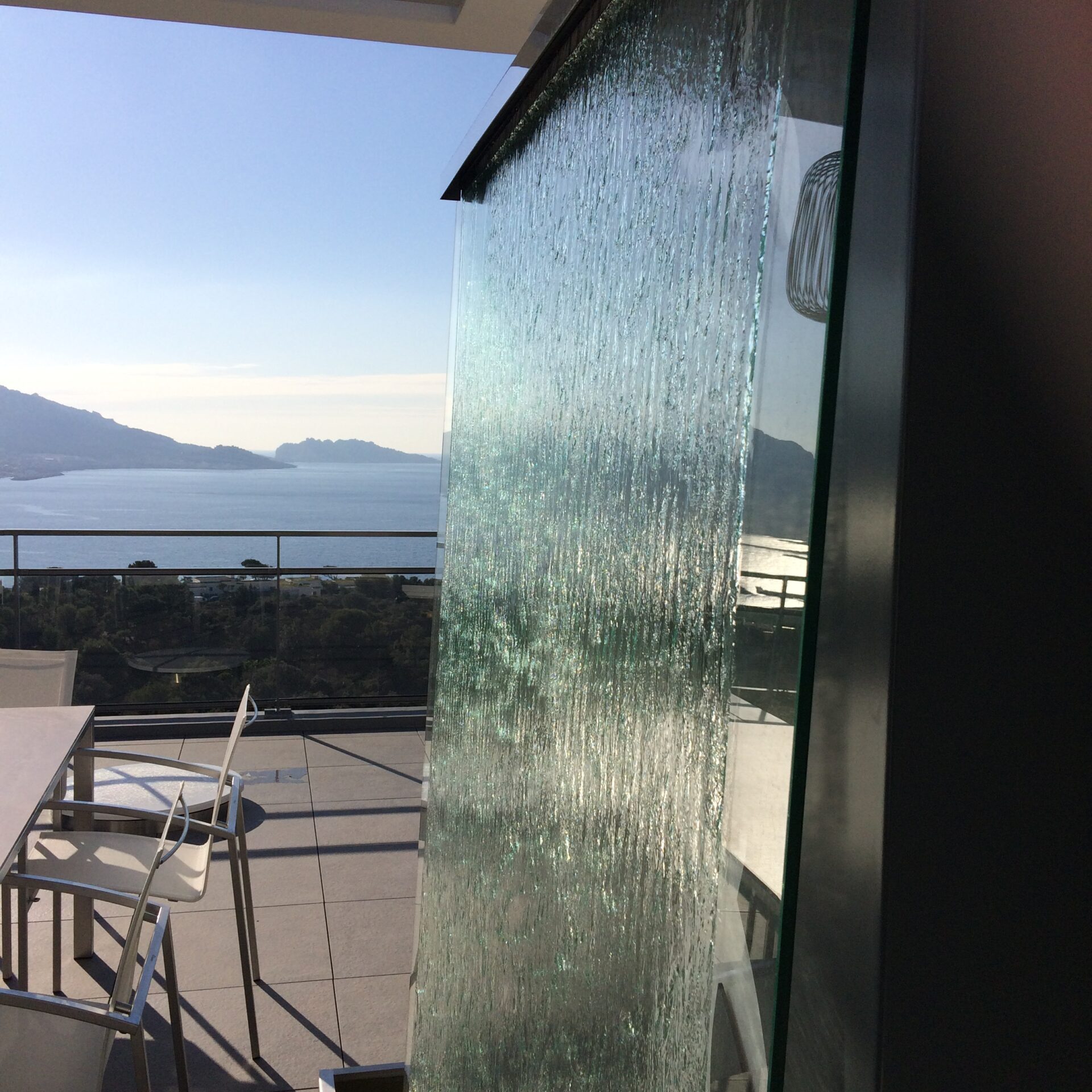 Le mur d’eau inspiré par les motifs de la mer de Matisse dans le prolongement de la cuisine, , en acier et verre dont les graphismes éclairés la nuit tombée sont découpés au laser.