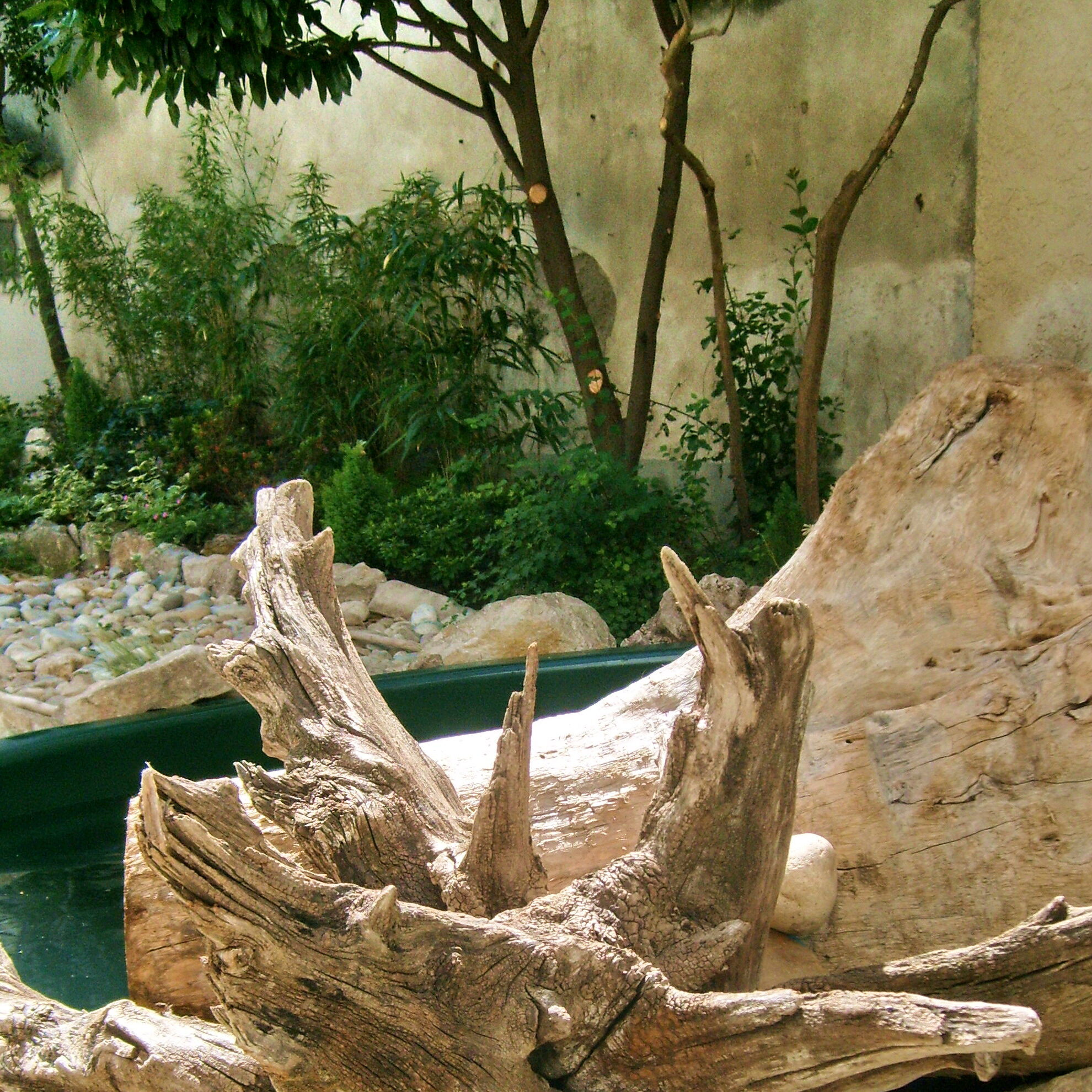 Un gros bois flotté avec sa forme particulière d’animal endormi se transforme en fontaine, le murmure de l’eau masque les bruits de la ville, invite à la détente.