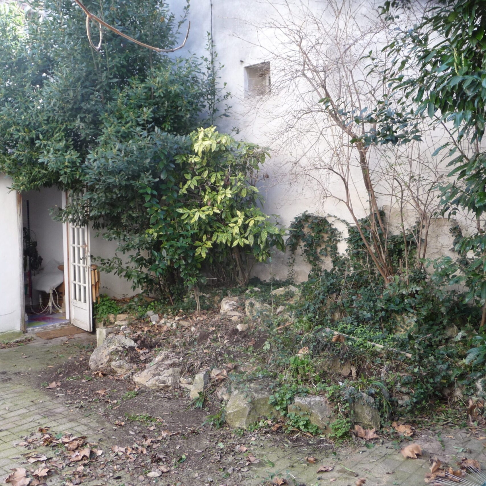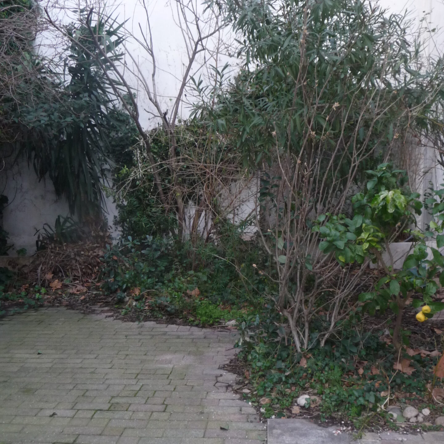 Un petit jardin dans le centre historique d’Avignon, de 40 m2 environ, dans son jus, le sol en pavés autobloquants typique des années 70, une végétation sommaire.