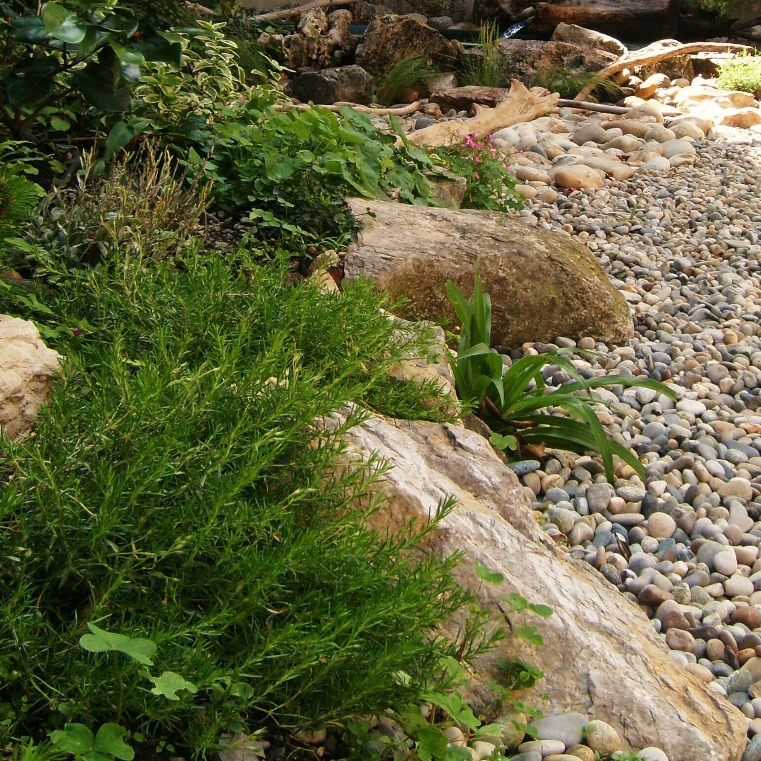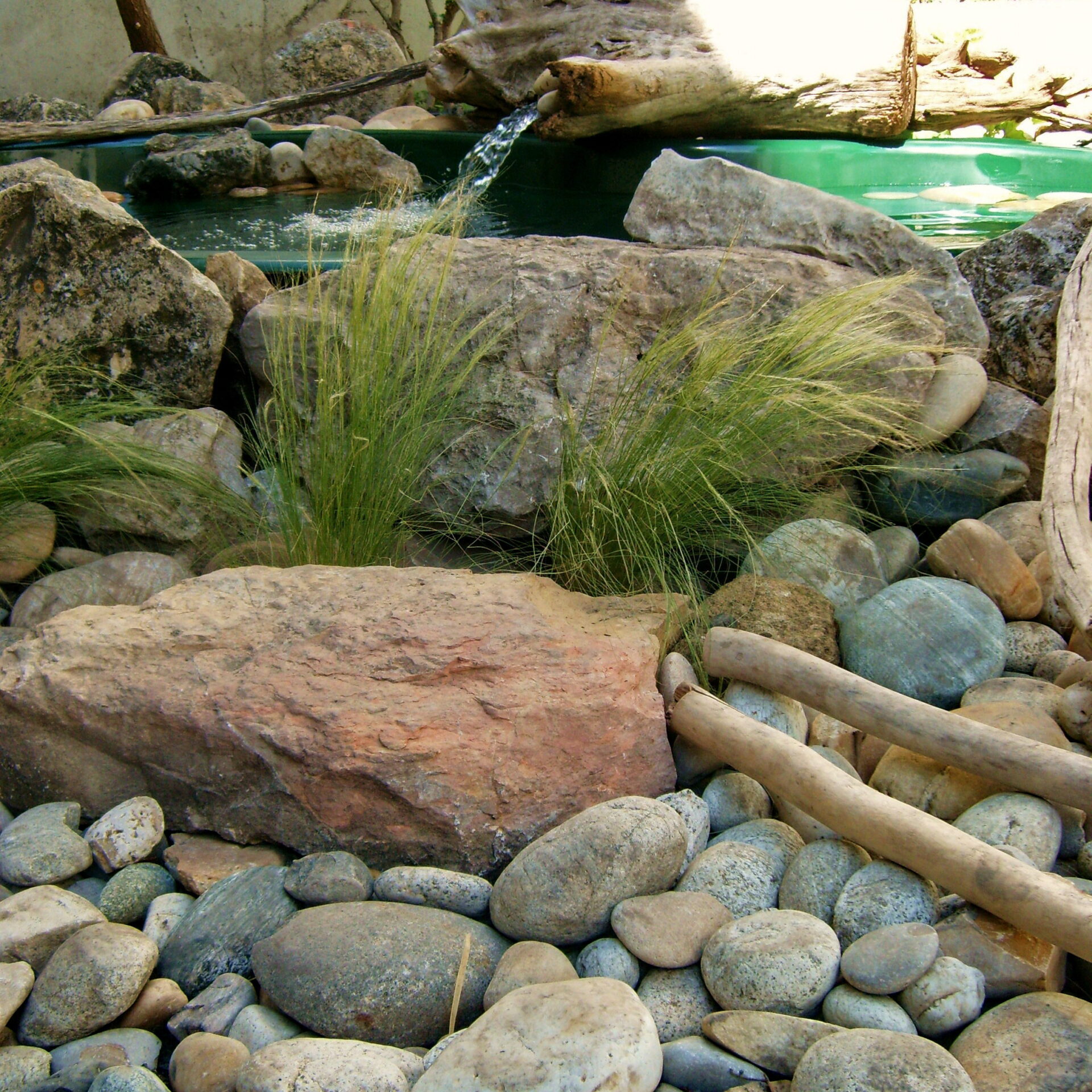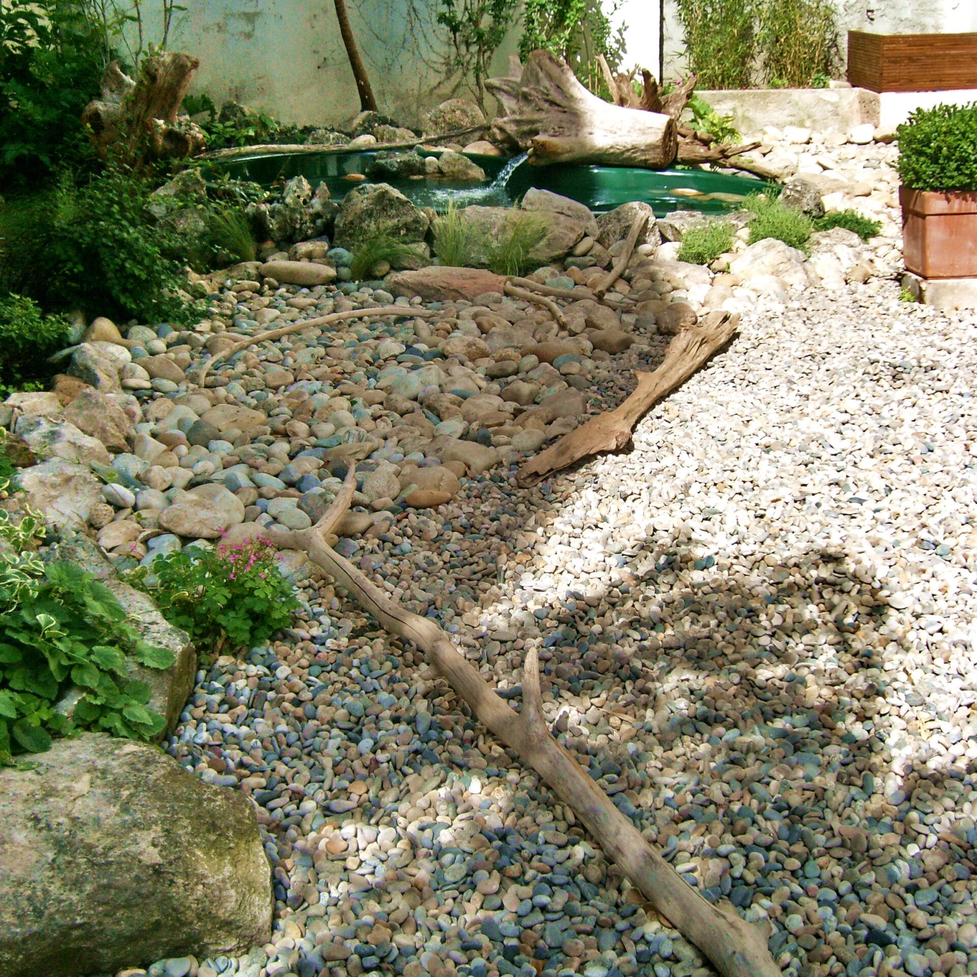 Le décor minéral, des pierres récupérées lors de nos chantiers, patinées par le temps, des bois flottés glanées au bord du Rhône, des galets de la Durance habillent la coque du bassin aquatique, crée ce décor de jardin inspiré par les jardins japonais.