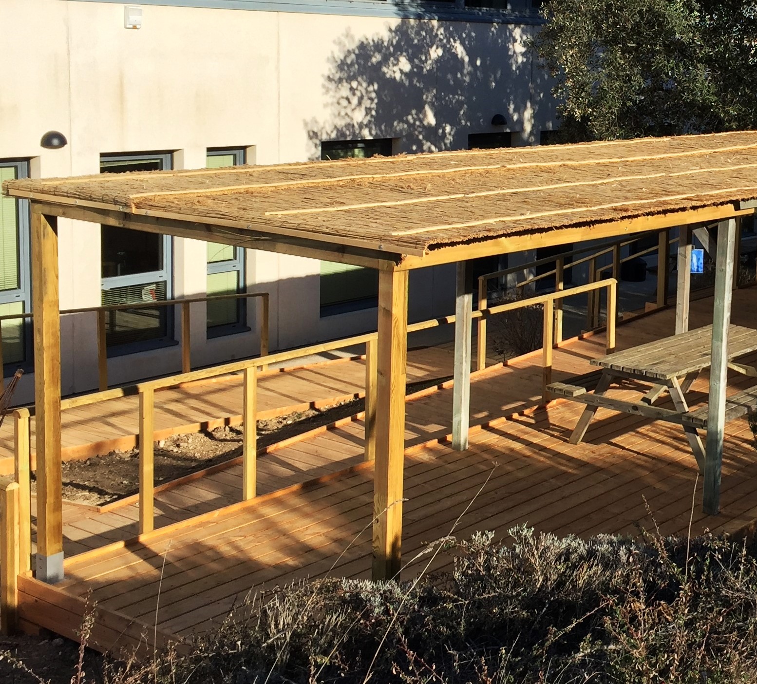 La terrasse repas accessible par une rampe et des escaliers protégée du soleil par une pergola recouverte de natte de Camargue, très isolante.