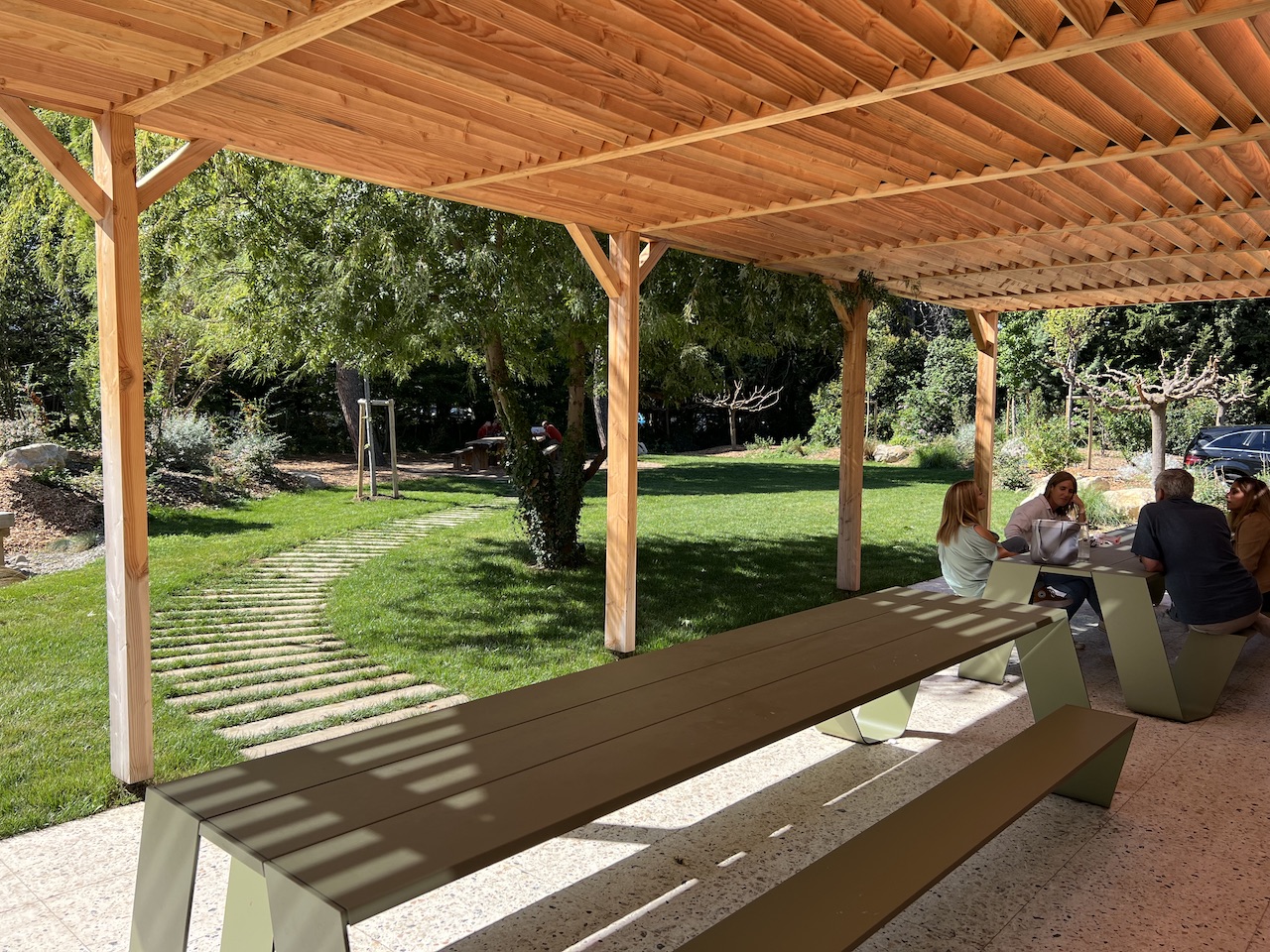 Des espaces de détente et de réception, la grande terrasse sous la pergola, un espace repas en traverses de bois sous les pins, une longue banquette en bois, des fauteuils et bancs installés au cœur du jardin.
