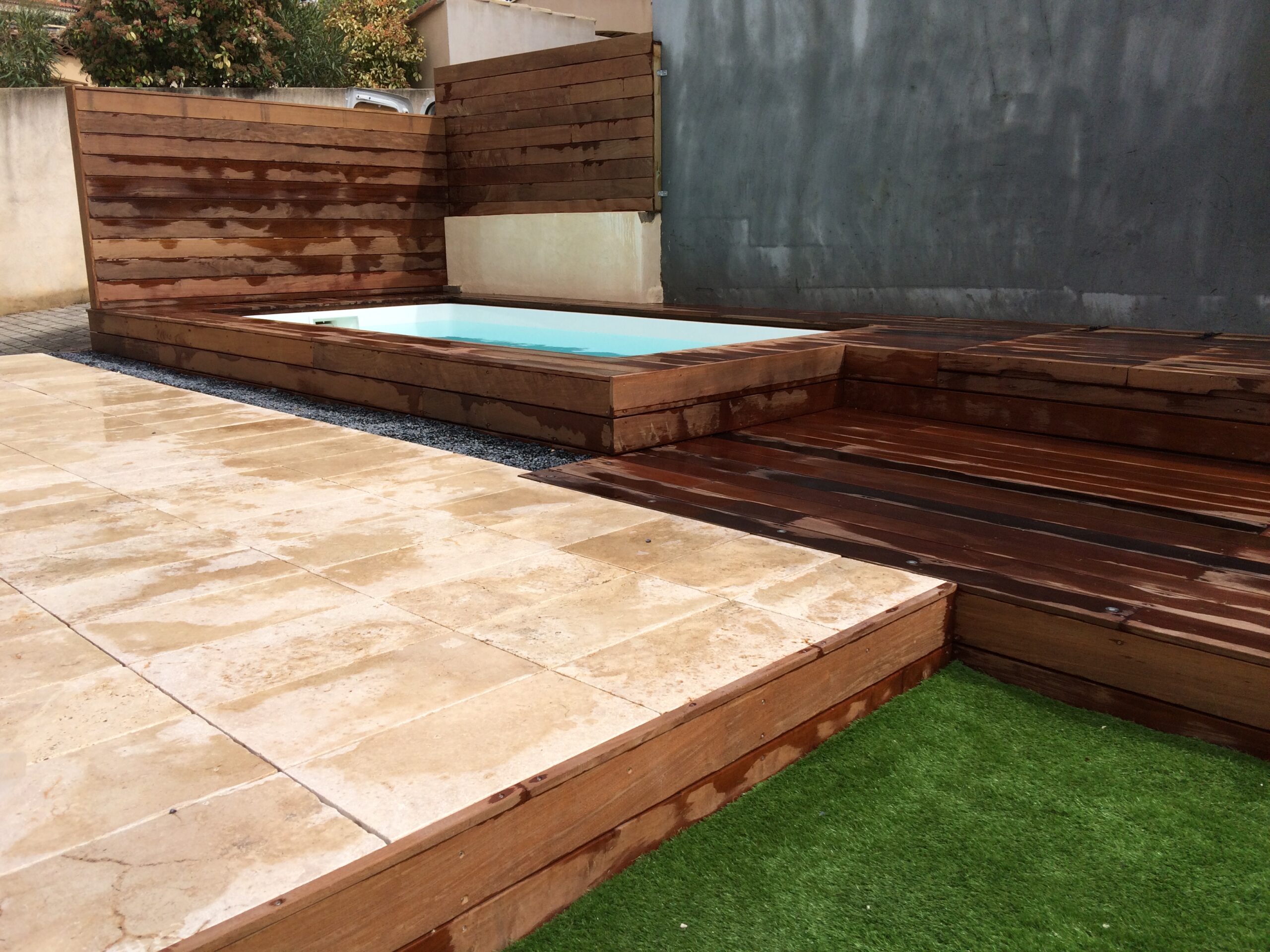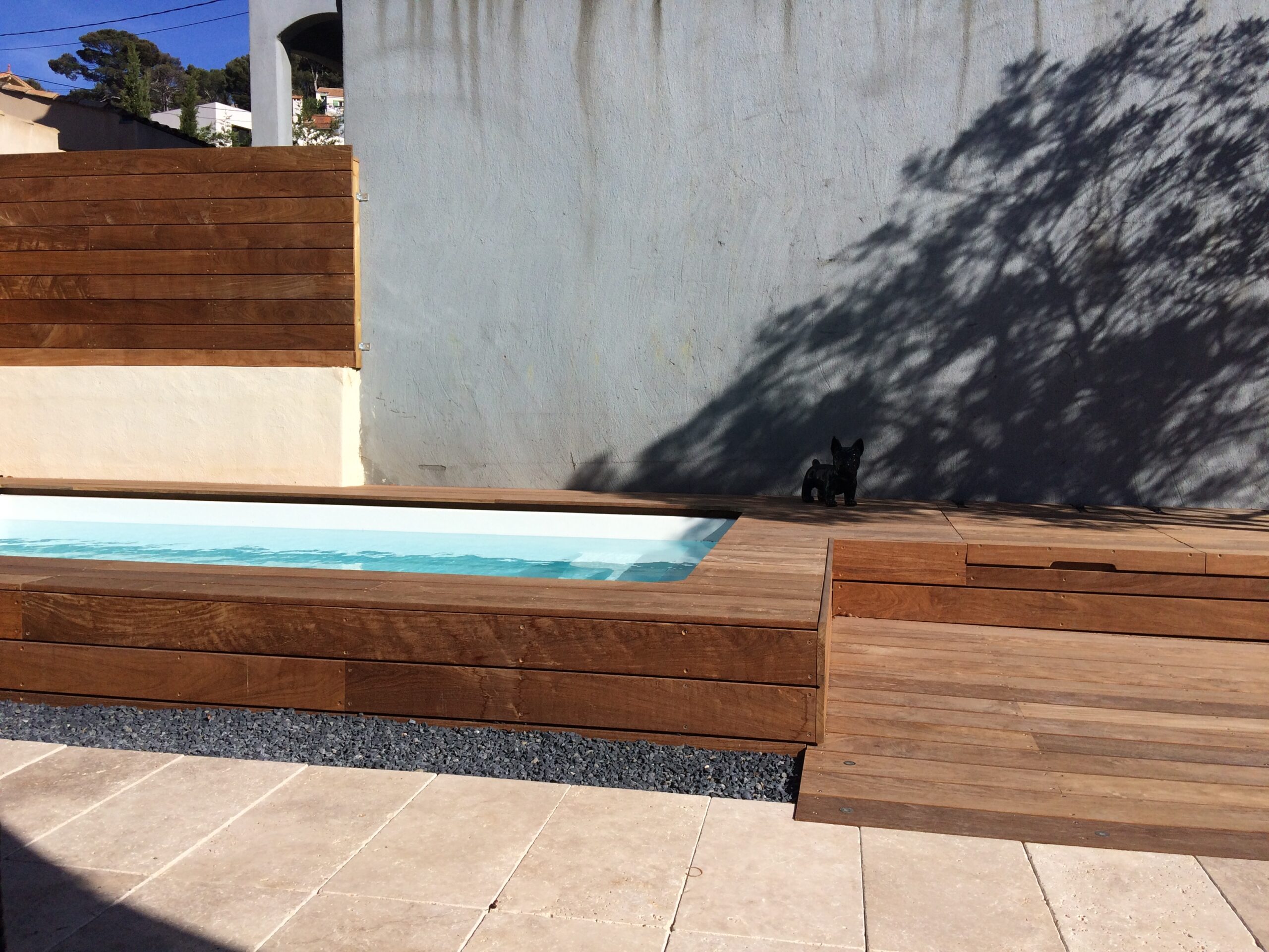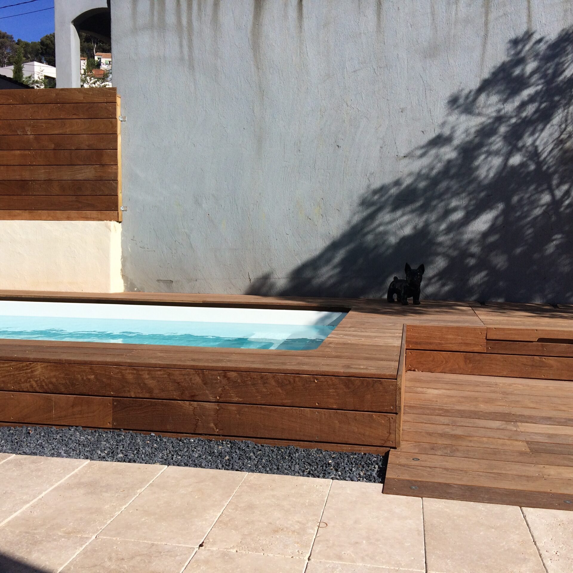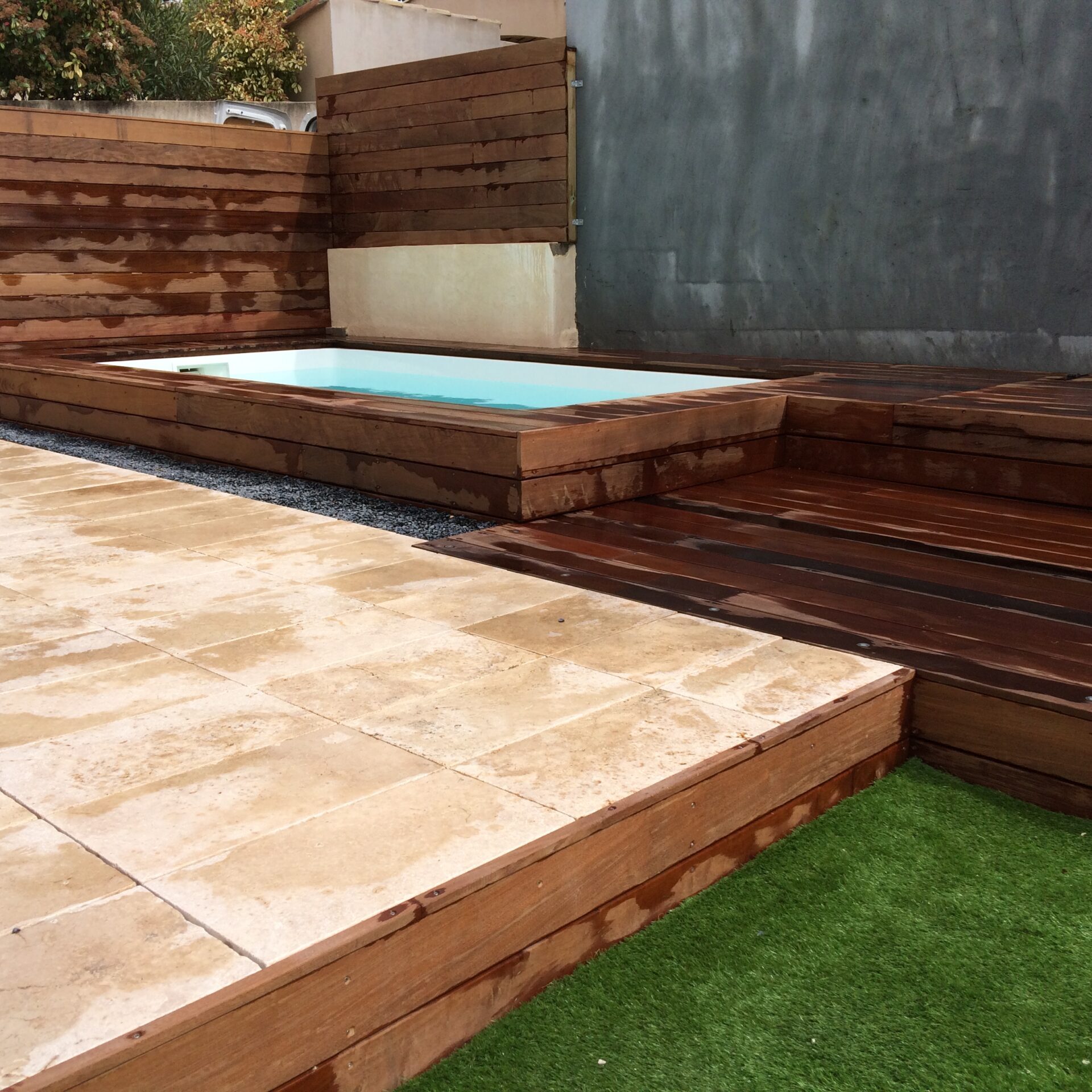 La mini piscine de 400 x 200 cm implantée au plus près du mur de la maison voisine, surélevée de 65 cm protégée des regards par un brise vue en lames de bois exotique.,