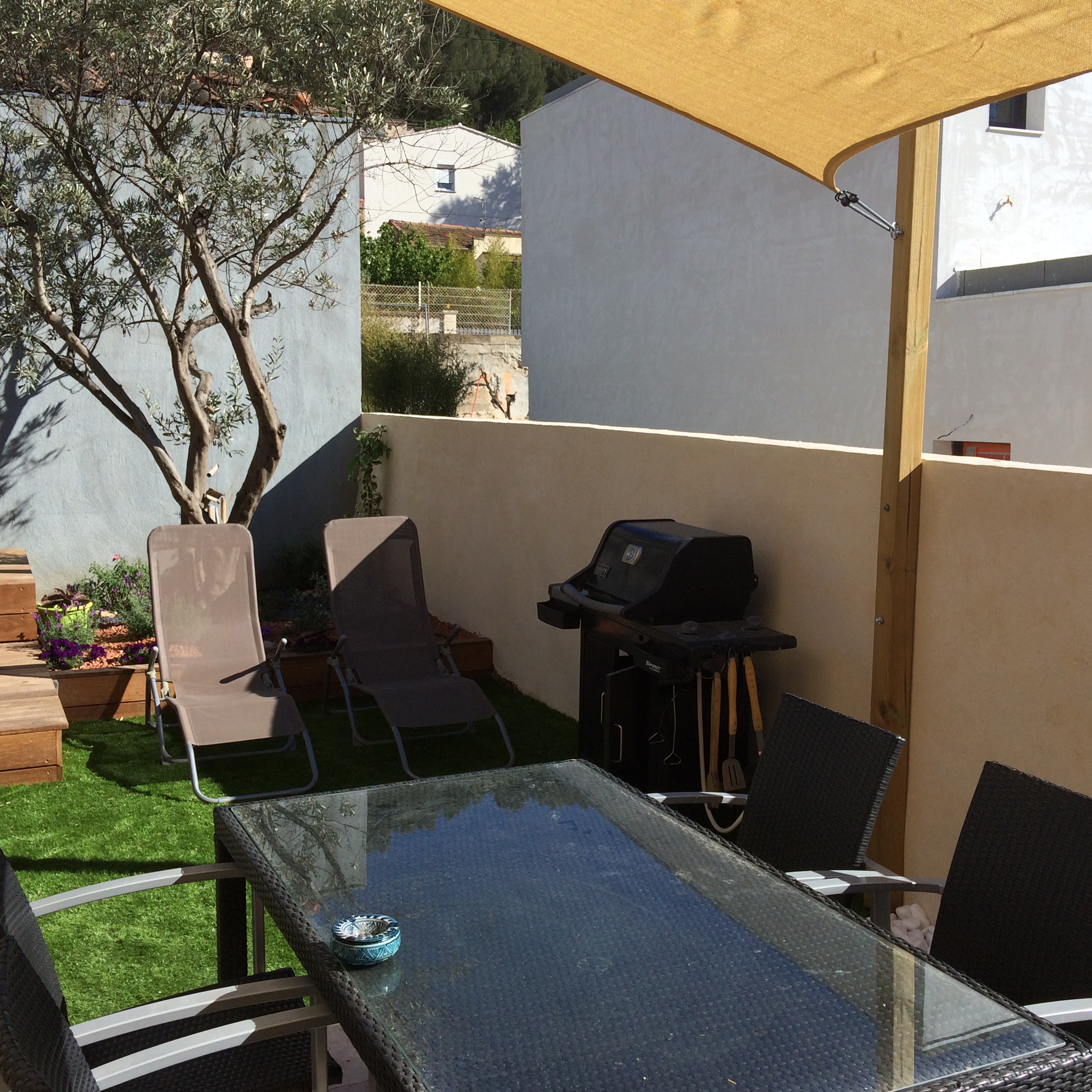 Un espace repas dans l’angle protégé du soleil par une voile d’ombrage, le barbecue…