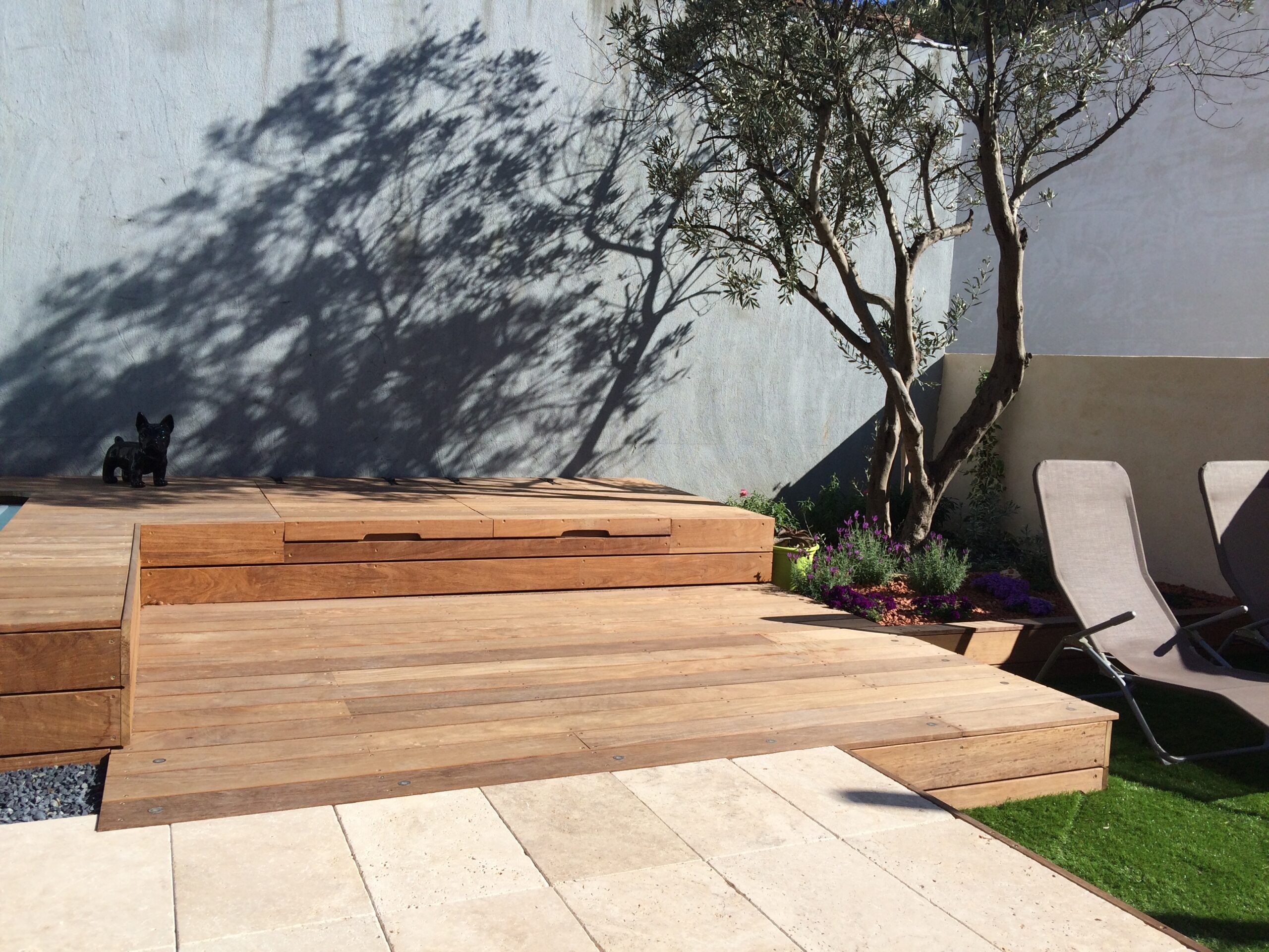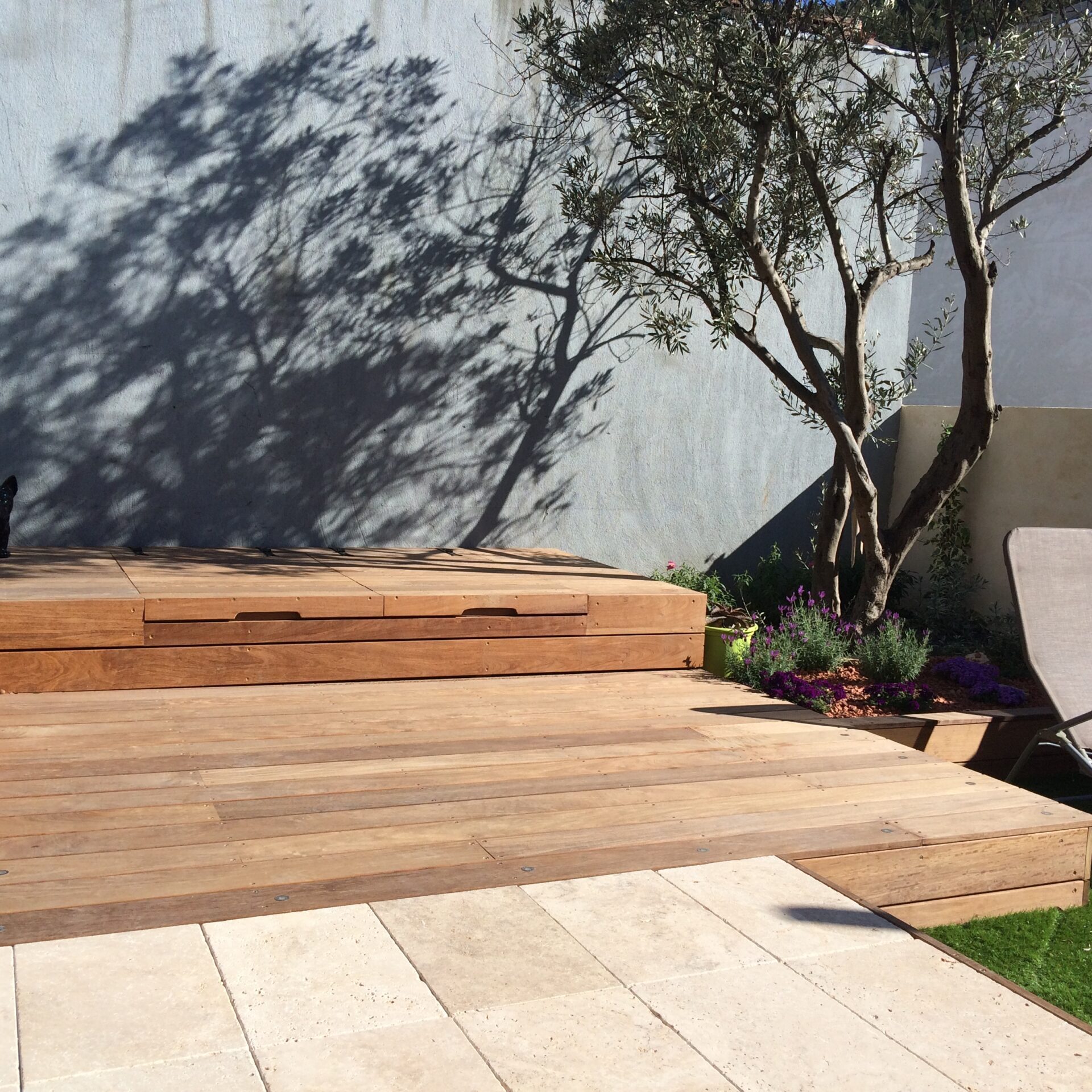 La terrasse solarium en bois de 300 x 300 cm dans le prolongement de la piscine sur la droite, la jardinière de l’olivier.