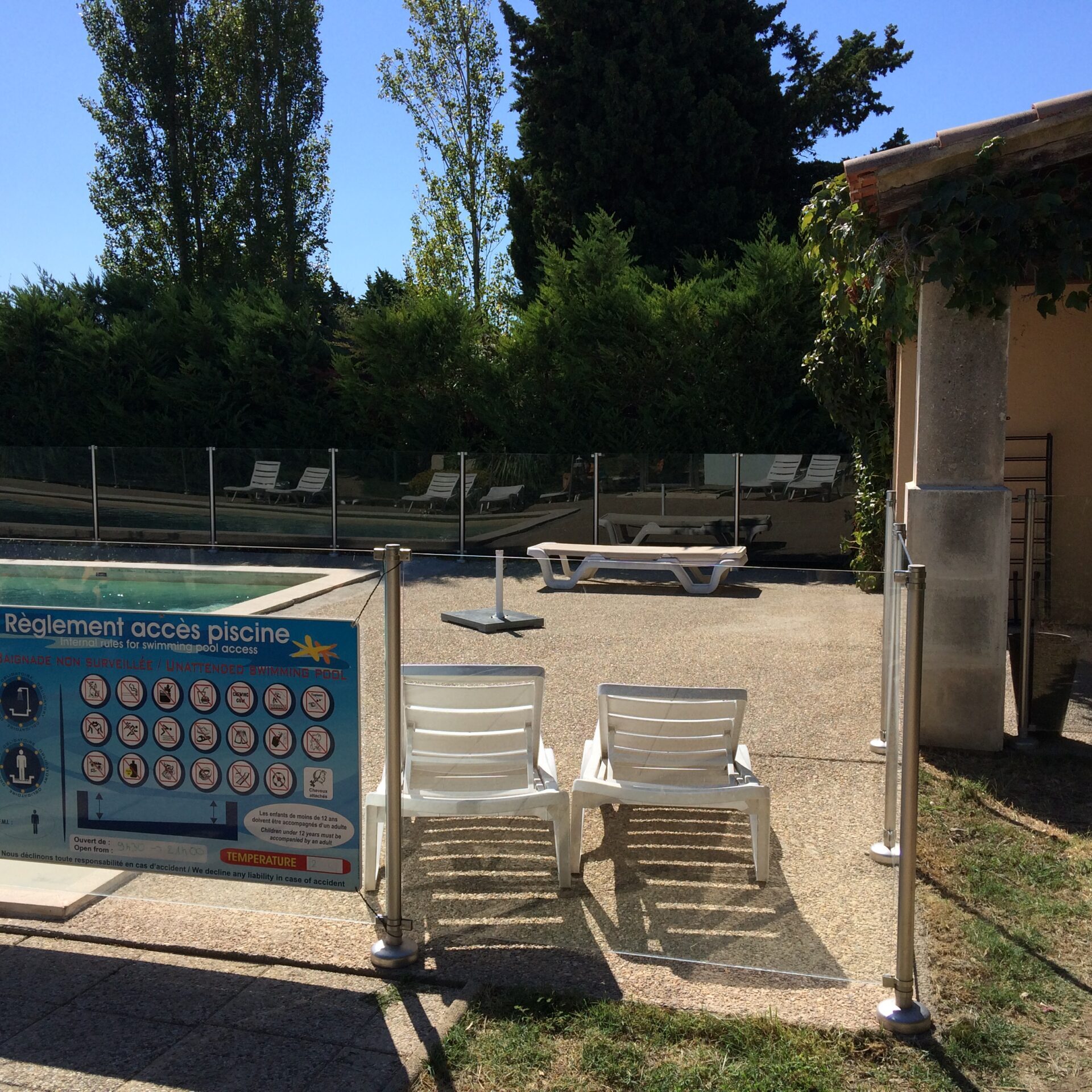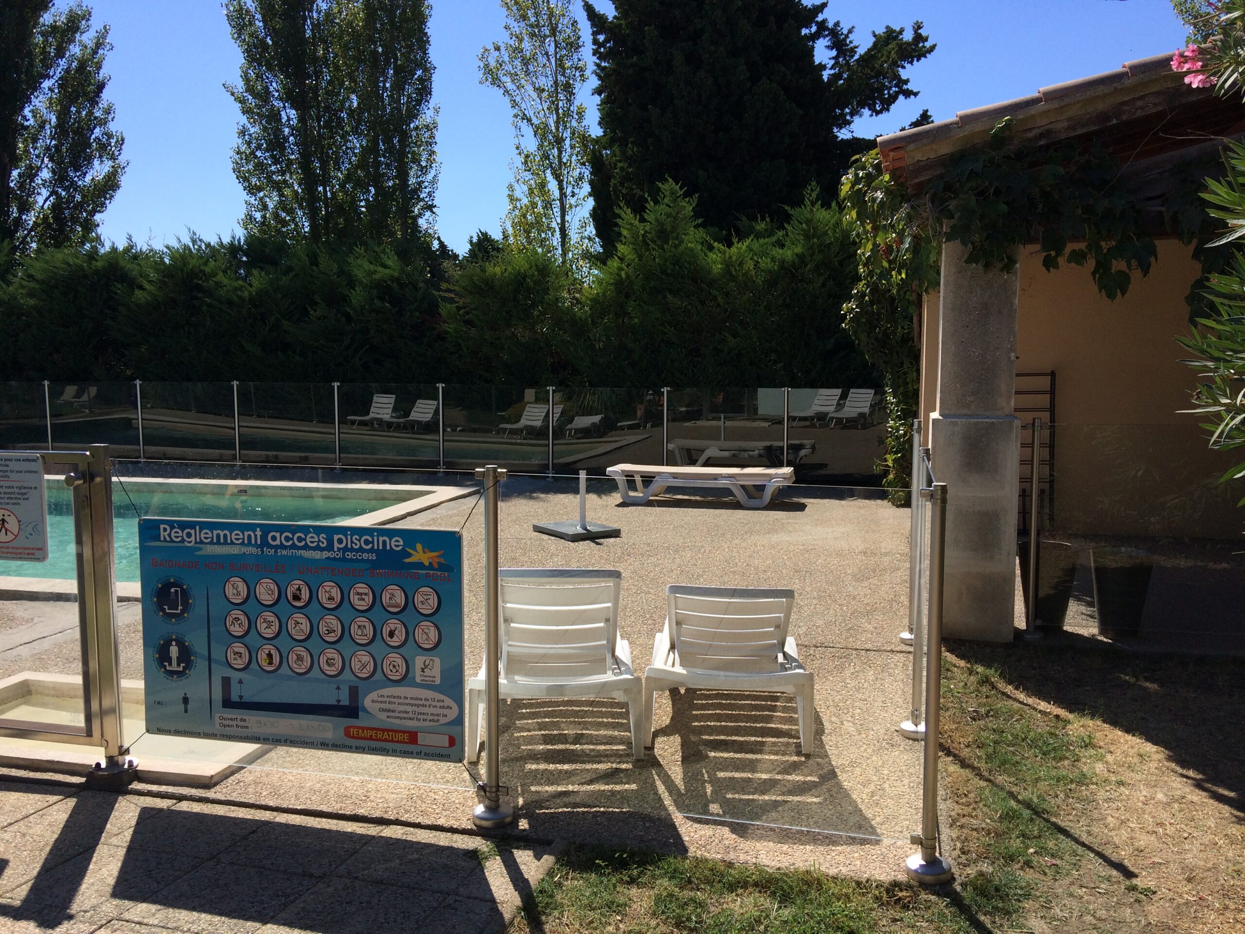 Les plages de la piscine sont en mauvais état, affaissement du dallage et garde-corps en verre, dalles béton des années 80.