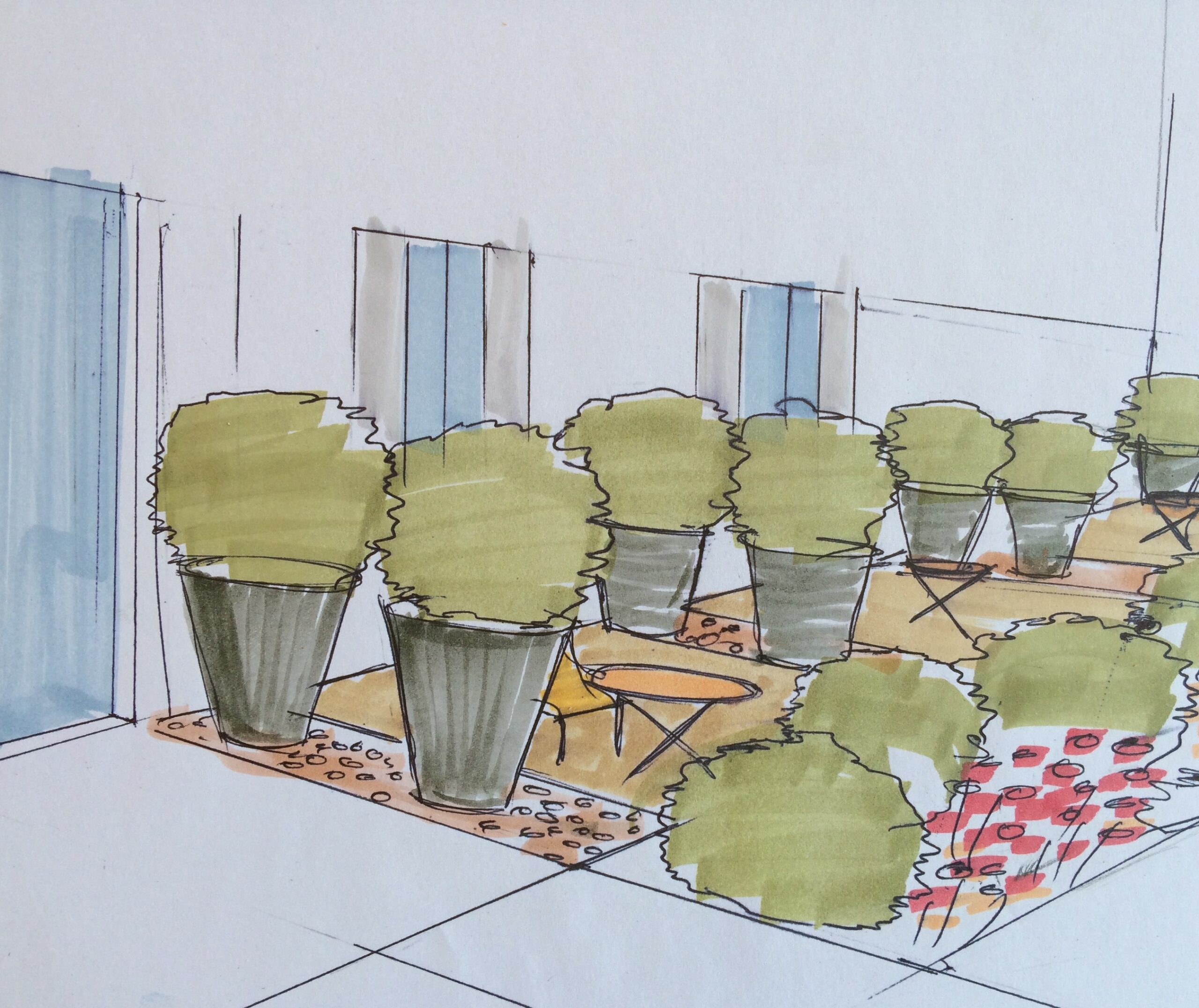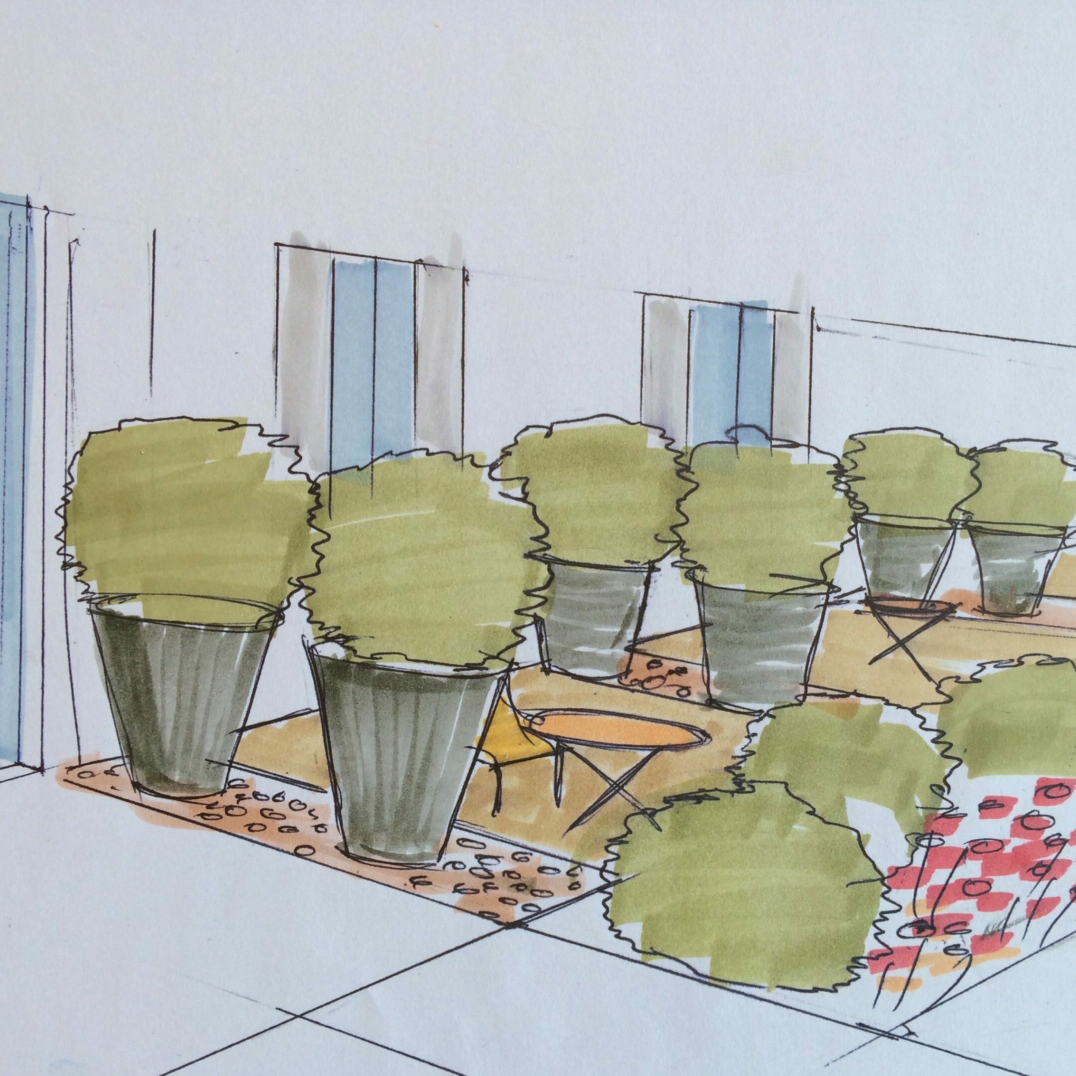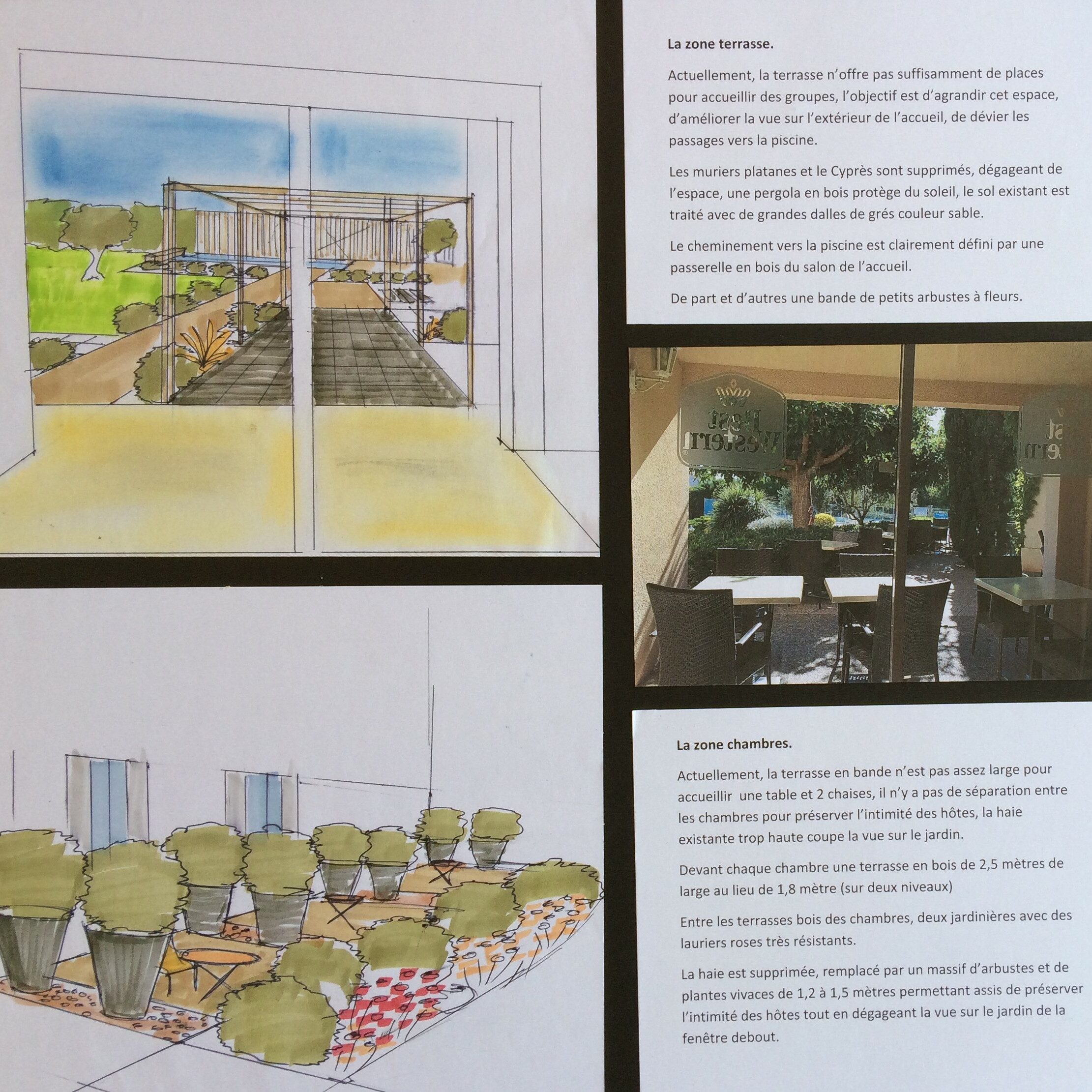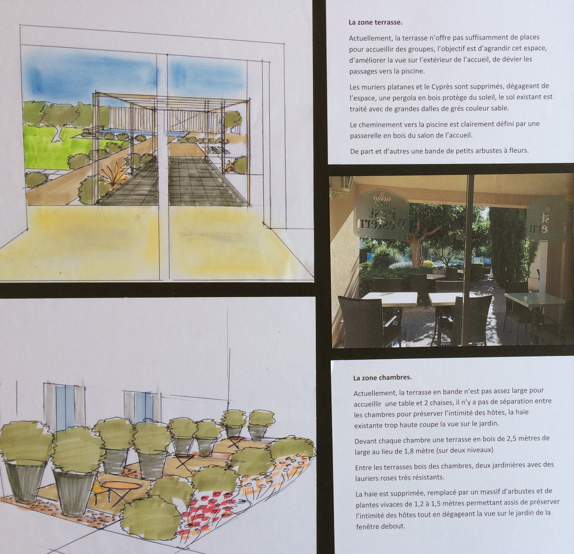 Actuellement, la terrasse en bande n’est pas assez large pour accueillir  une table et 2 chaises, il n’y a pas de séparation entre les chambres pour préserver l’intimité des hôtes, la haie existante trop haute coupe la vue sur le jardin.