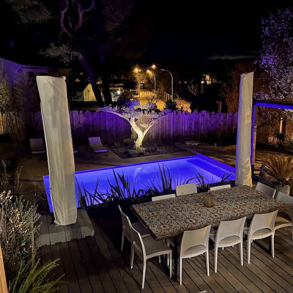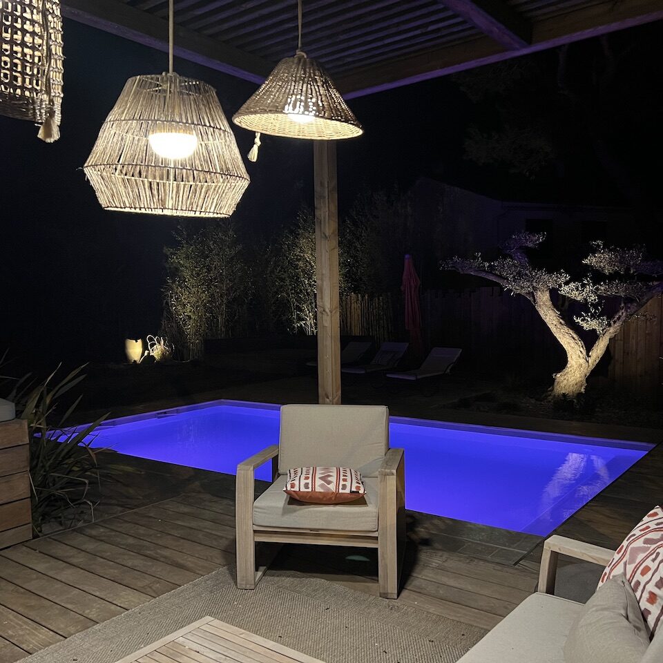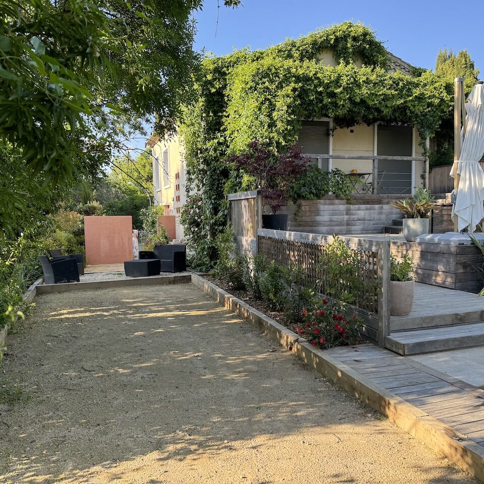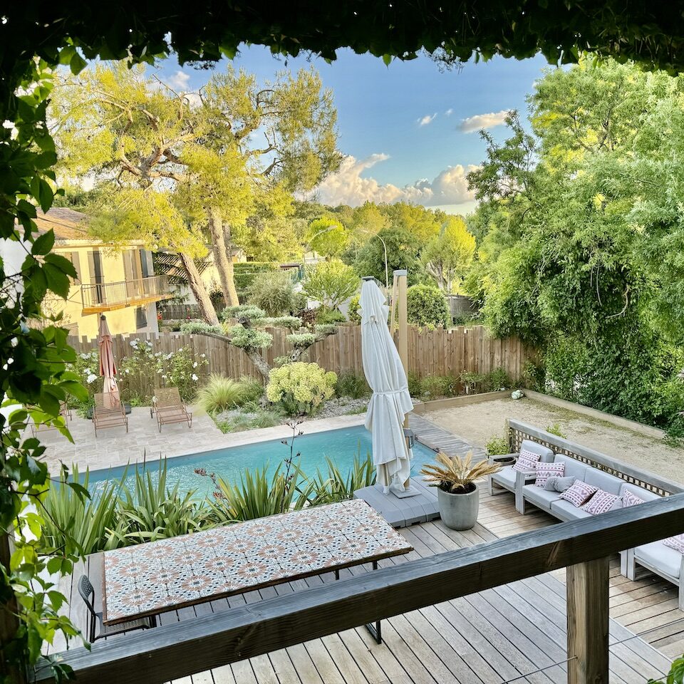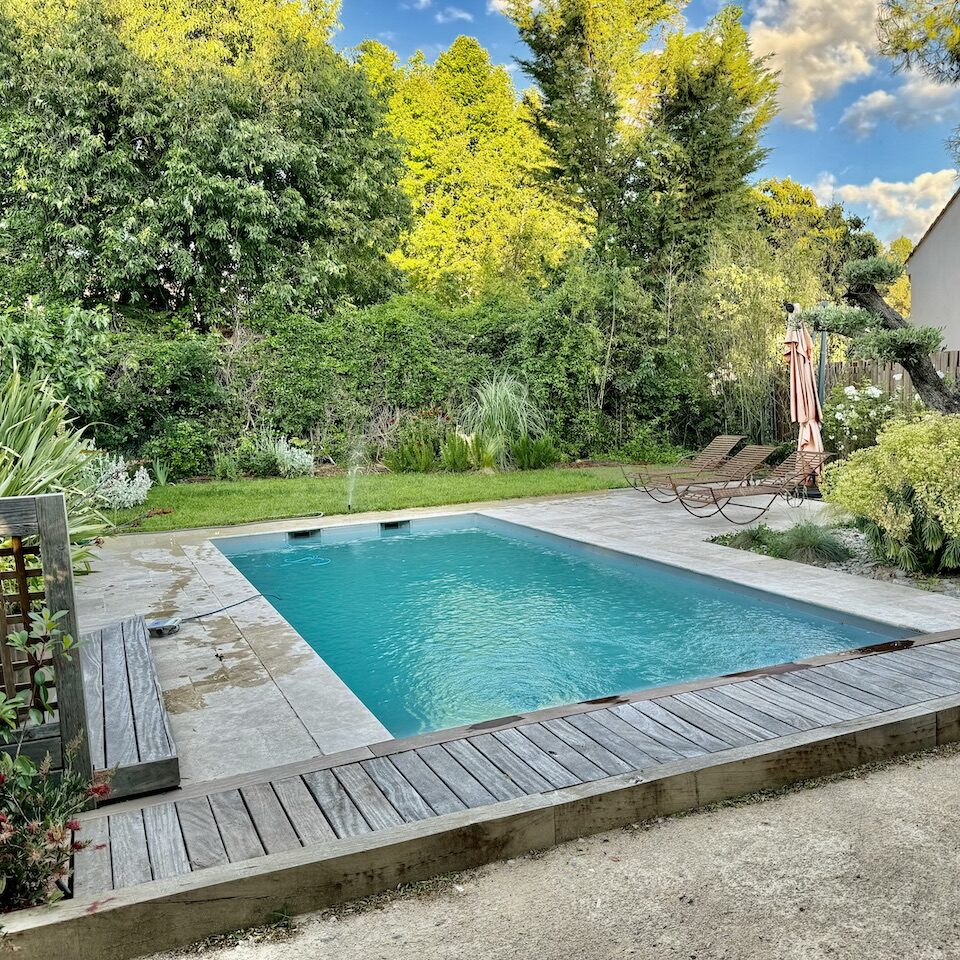 La piscine de 7 x 3 mètres, élément central du jardin, en structure bois enterrée, des plages en travertin et en bois exotique, sur la droite un terrain de boules, sur la gauche, du gazon de type Zoyzia, plus économe en eau…