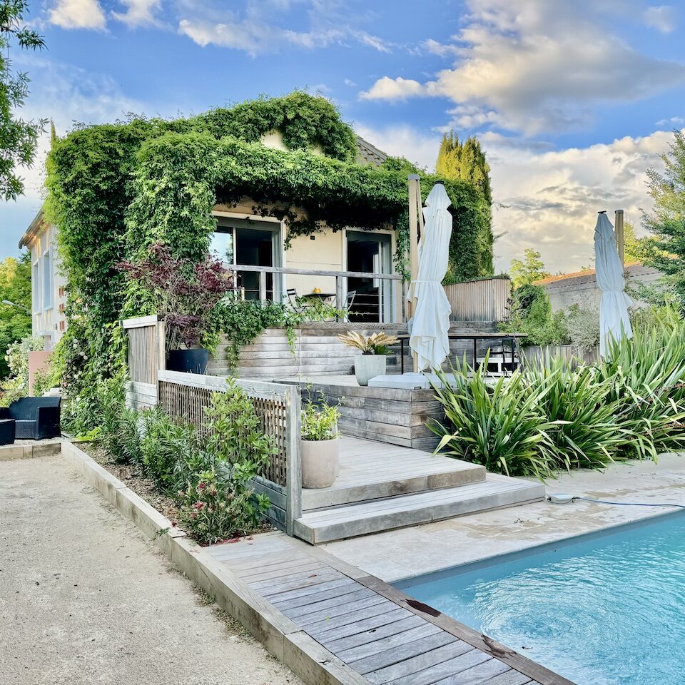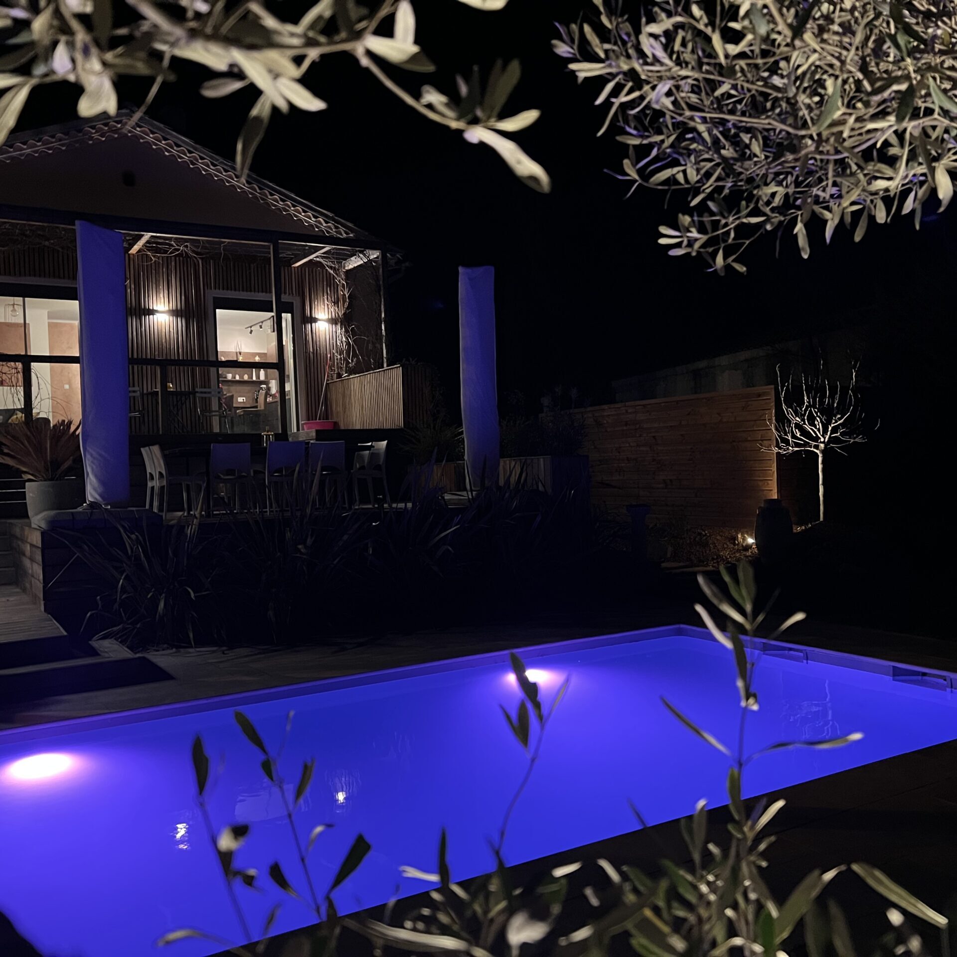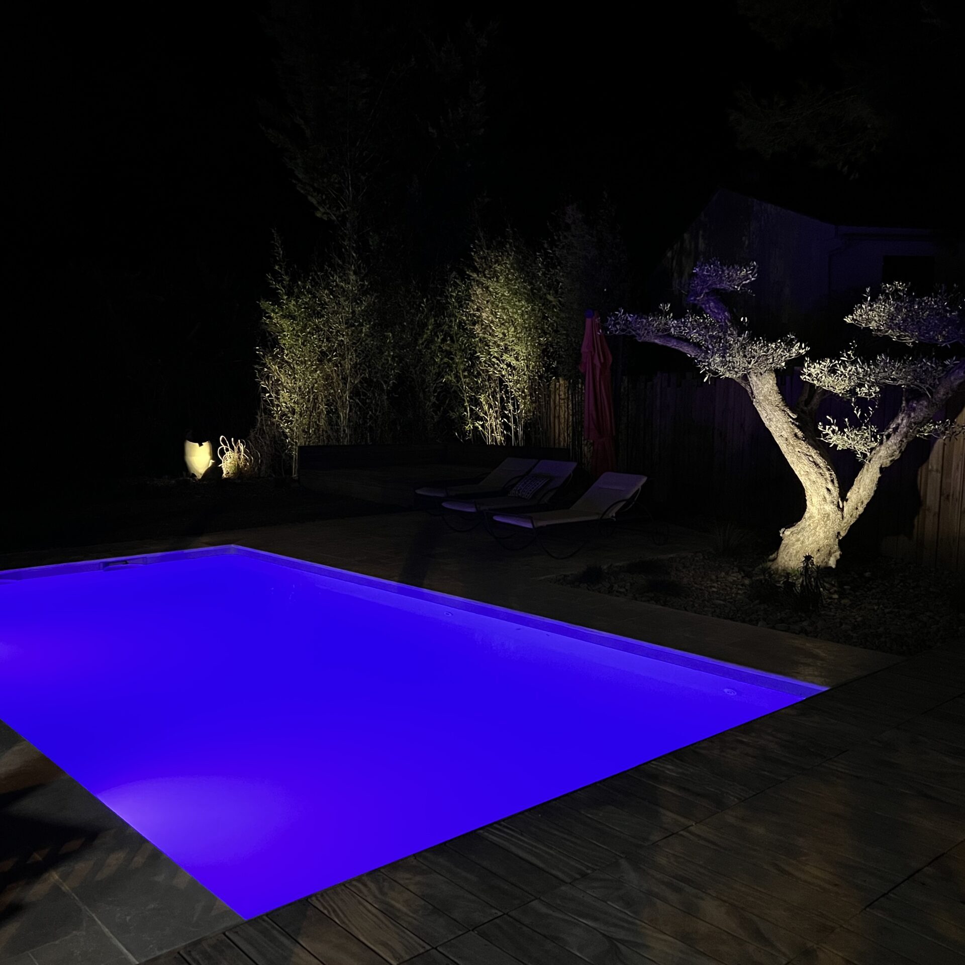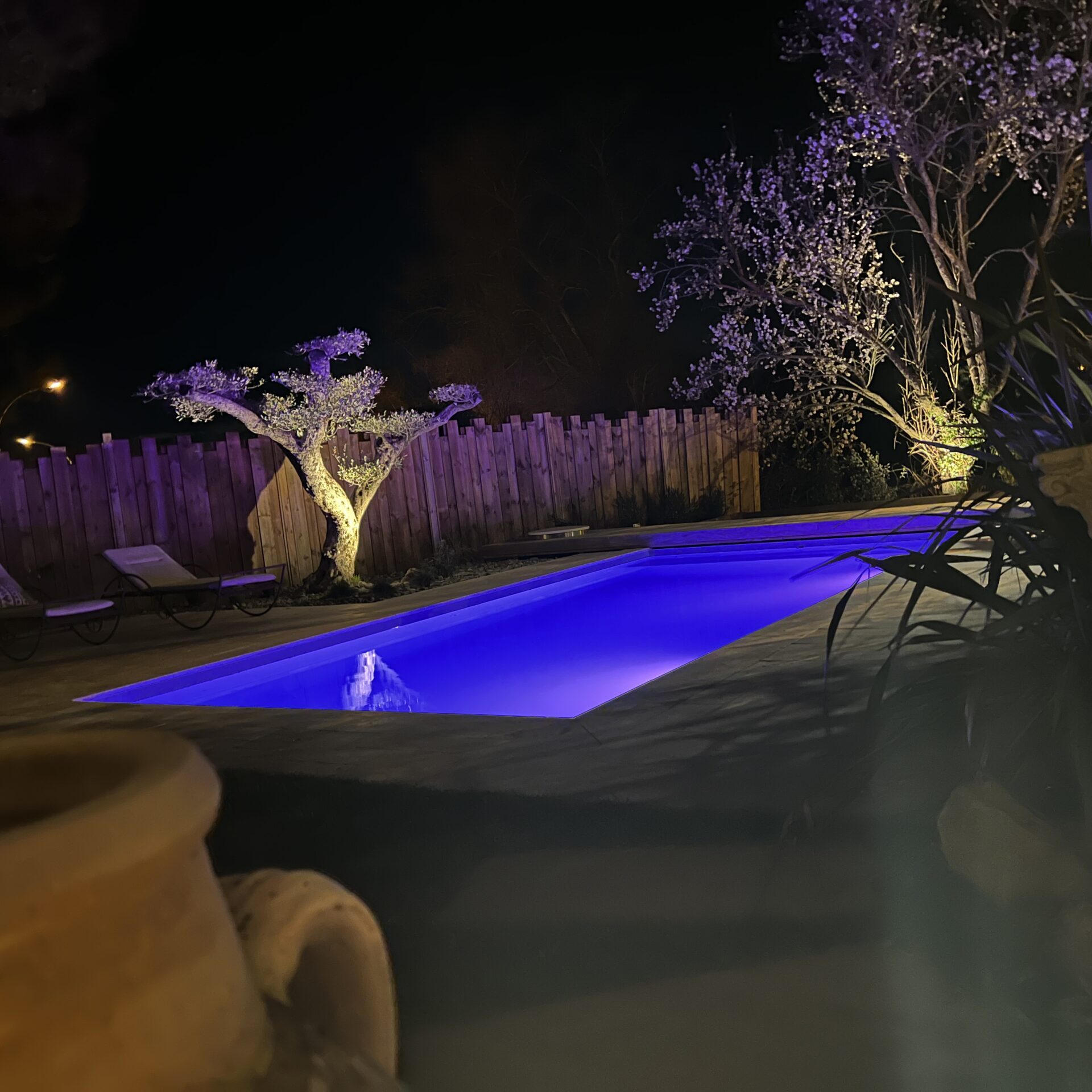 La piscine de 7 x 3 mètres, élément central du jardin, en structure bois enterrée, des plages en travertin et en bois exotique, sur la droite un terrain de boules, sur la gauche, du gazon de type Zoyzia, plus économe en eau…