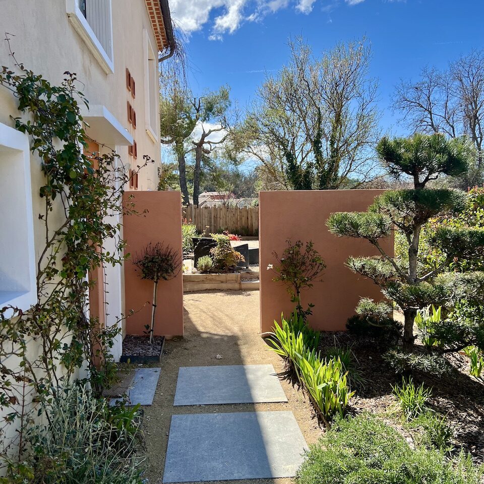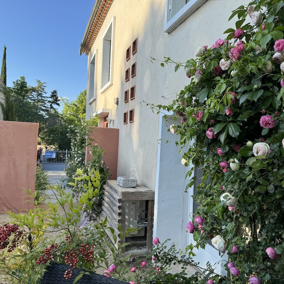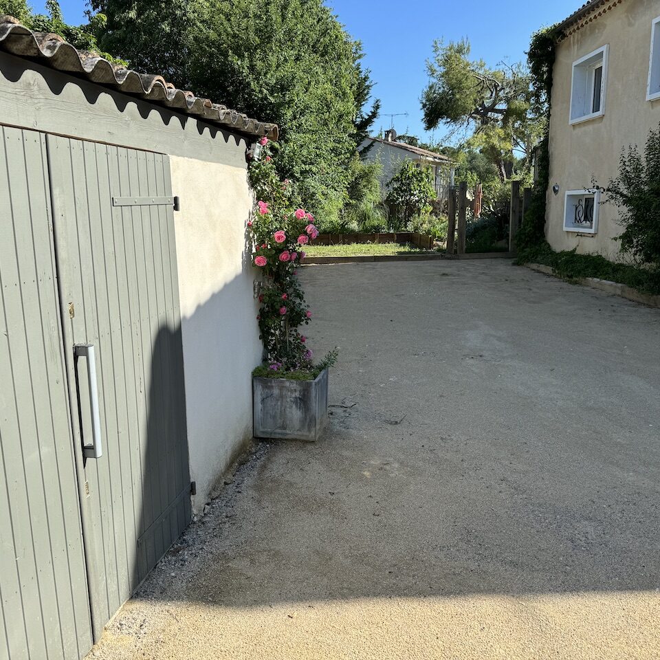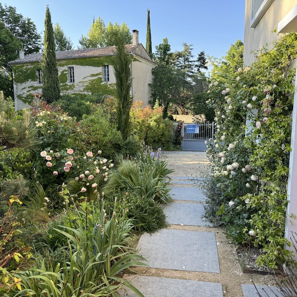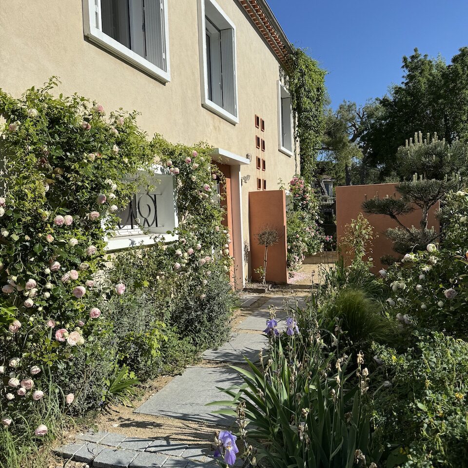 Des entrées, vers un studio indépendant, du parking vers le jardin, un cheminement très fleuri, des rosiers anciens, des massifs masquent les vues sur le voisinage.
