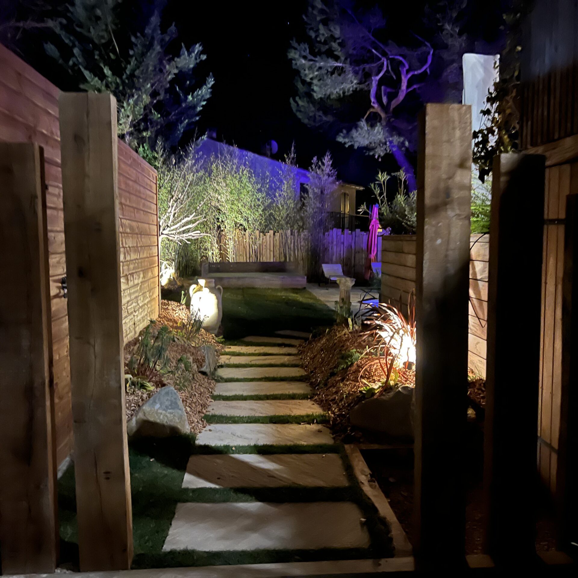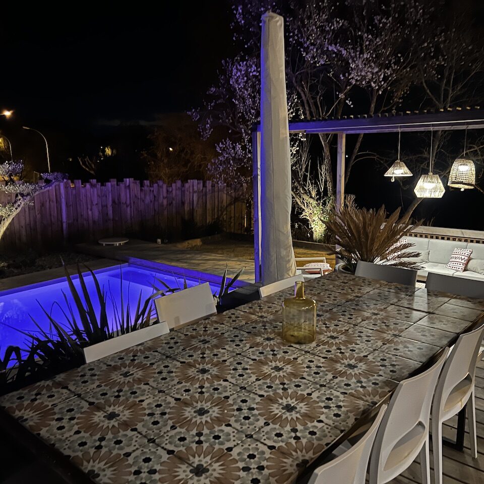Du séjour, 4 niveaux ont été créés, une première terrasse au niveau du salon, des escaliers vers la deuxième terrasse repas, puis l’espace salon avec une pergola, et enfin, la piscine.