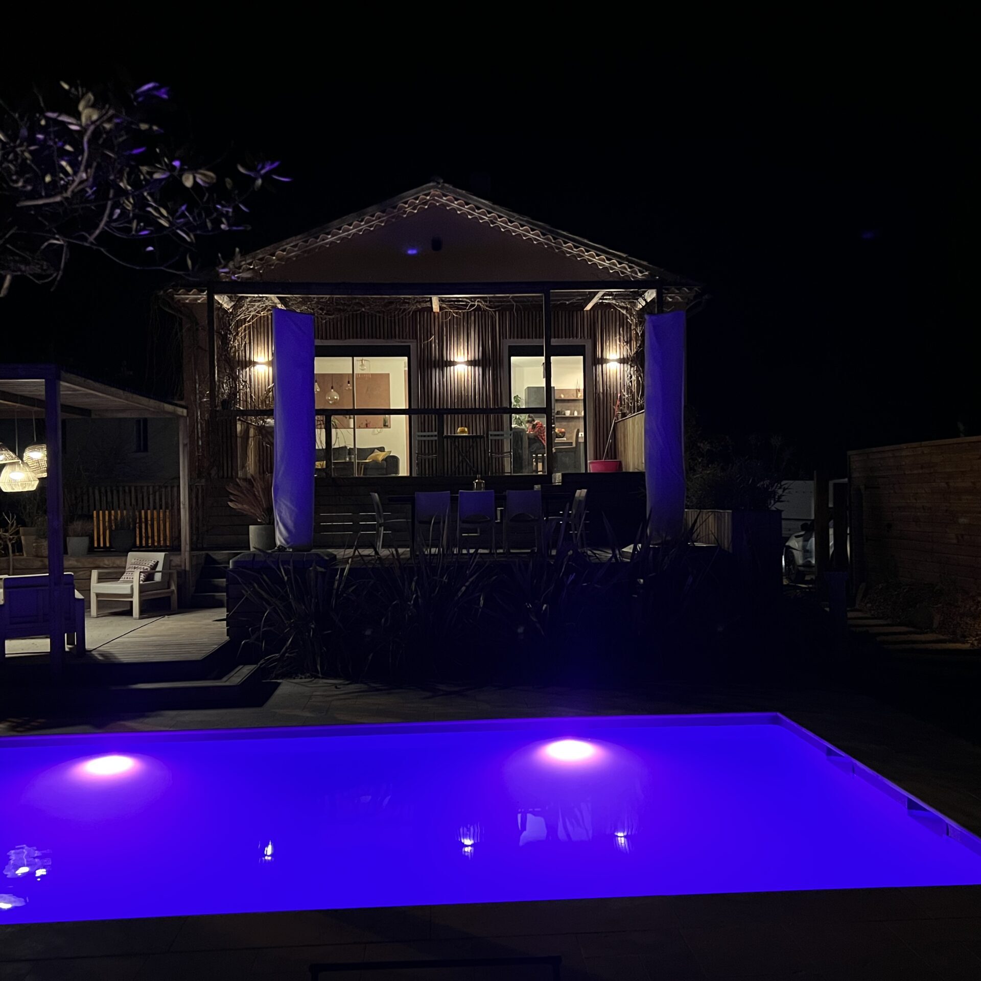 Ls structure de cet ouvrage sur pilotis offre dessous un grand volume de rangement, accueille le système de filtration de la piscine.