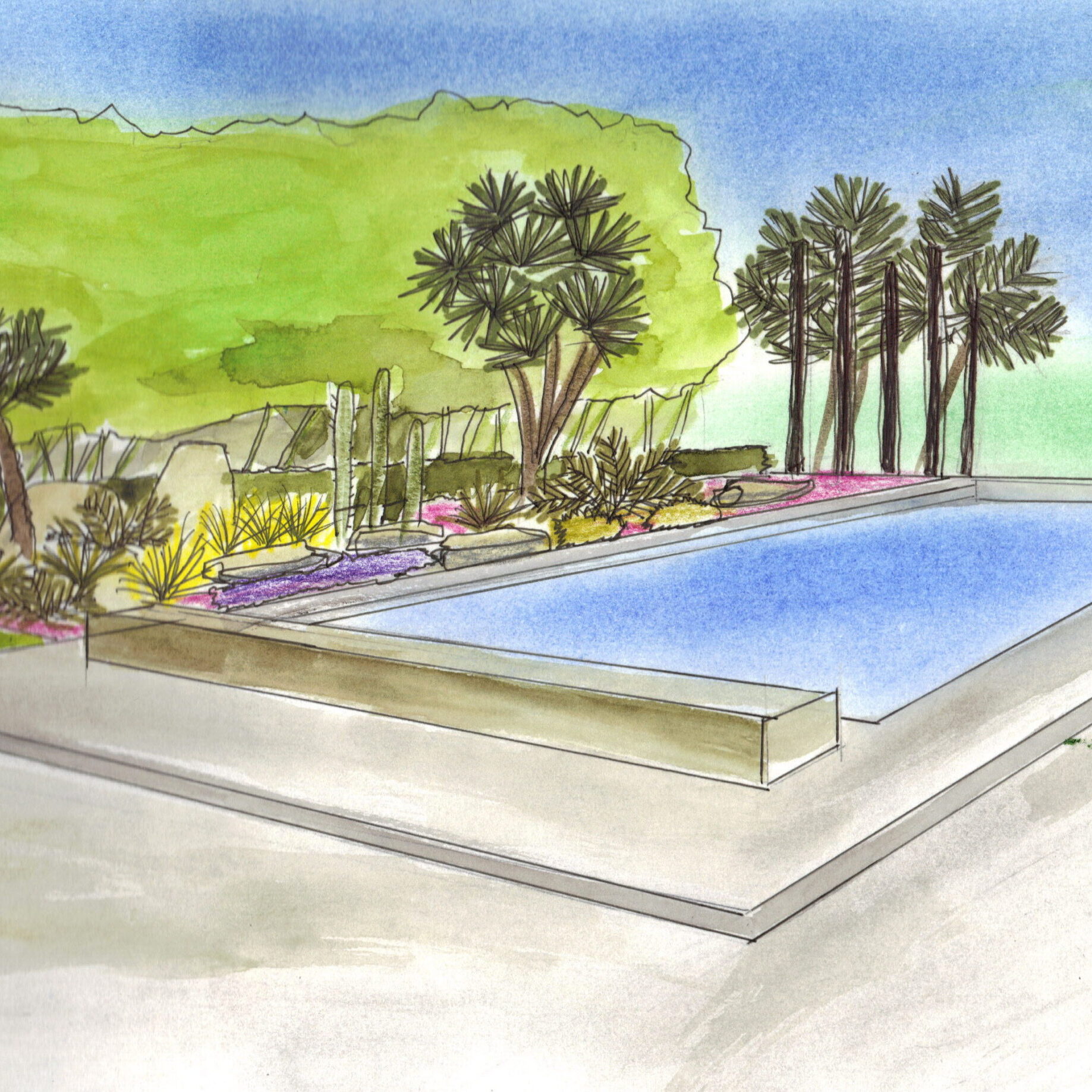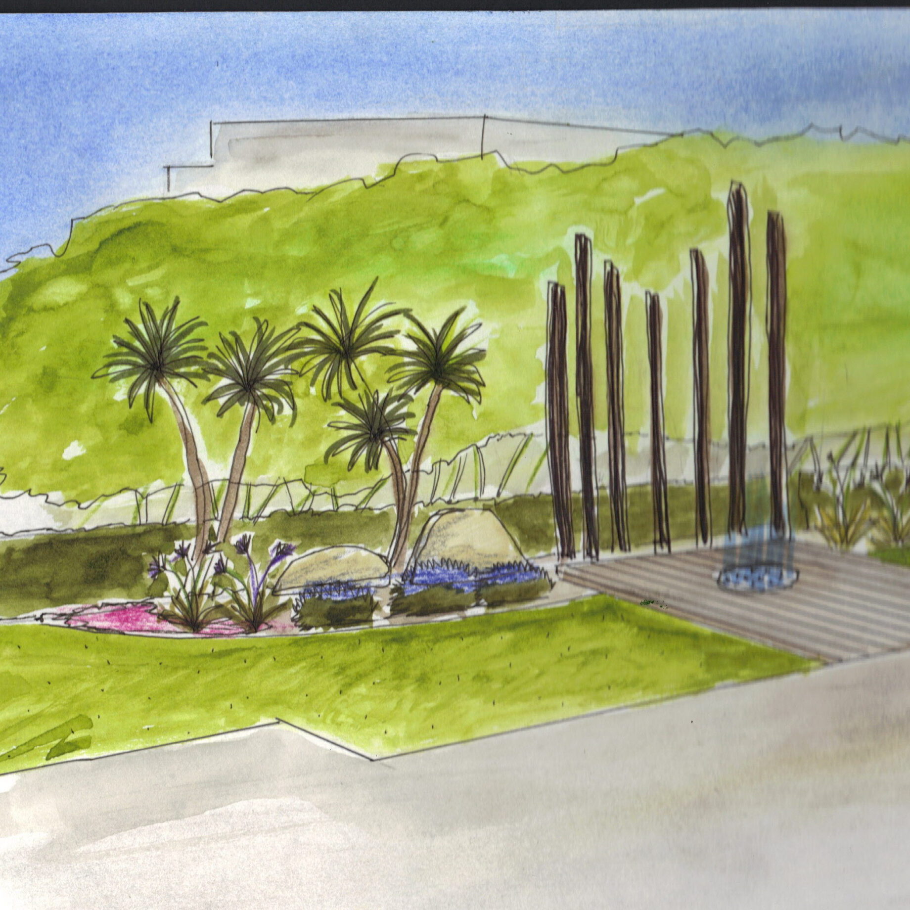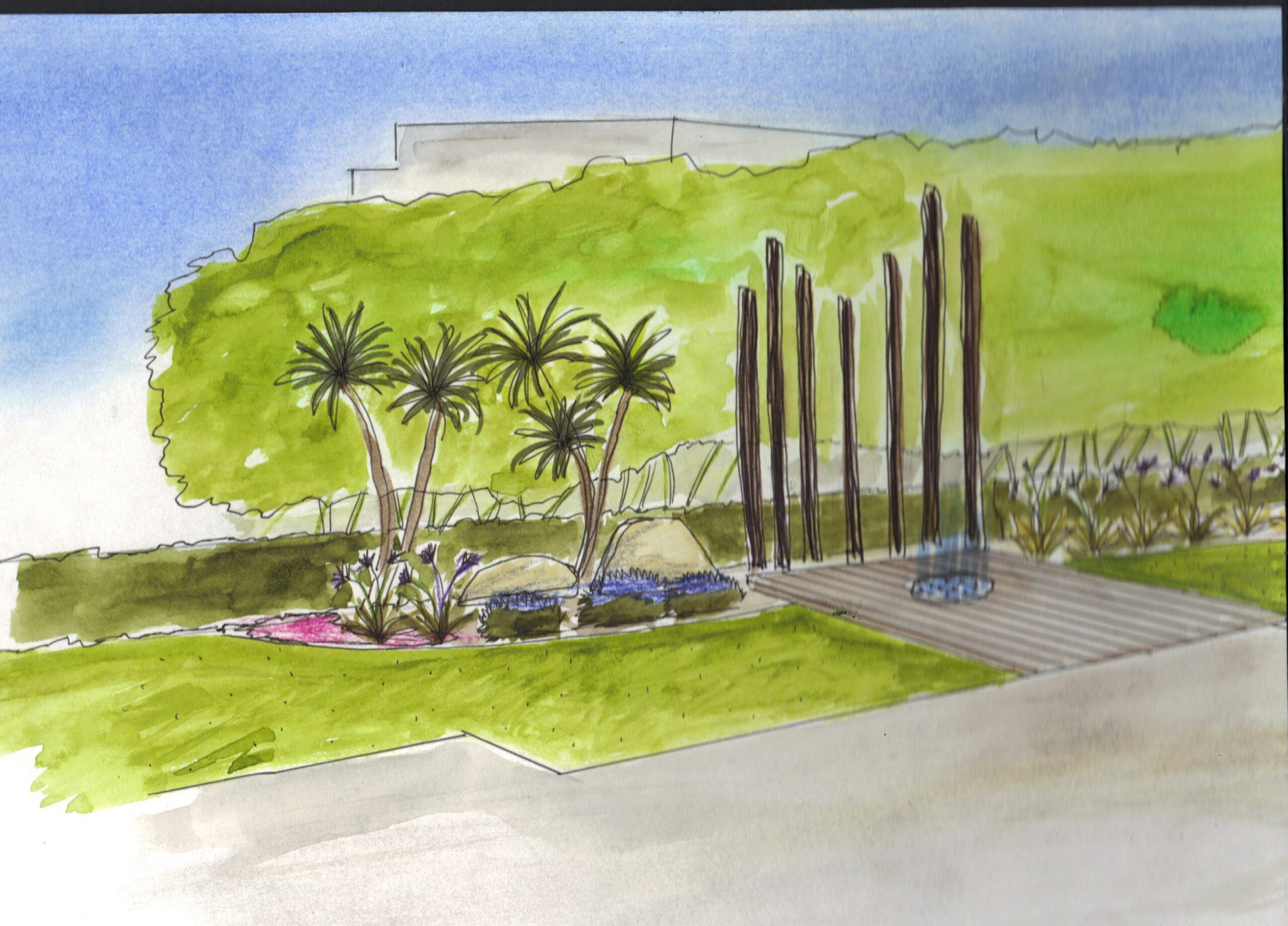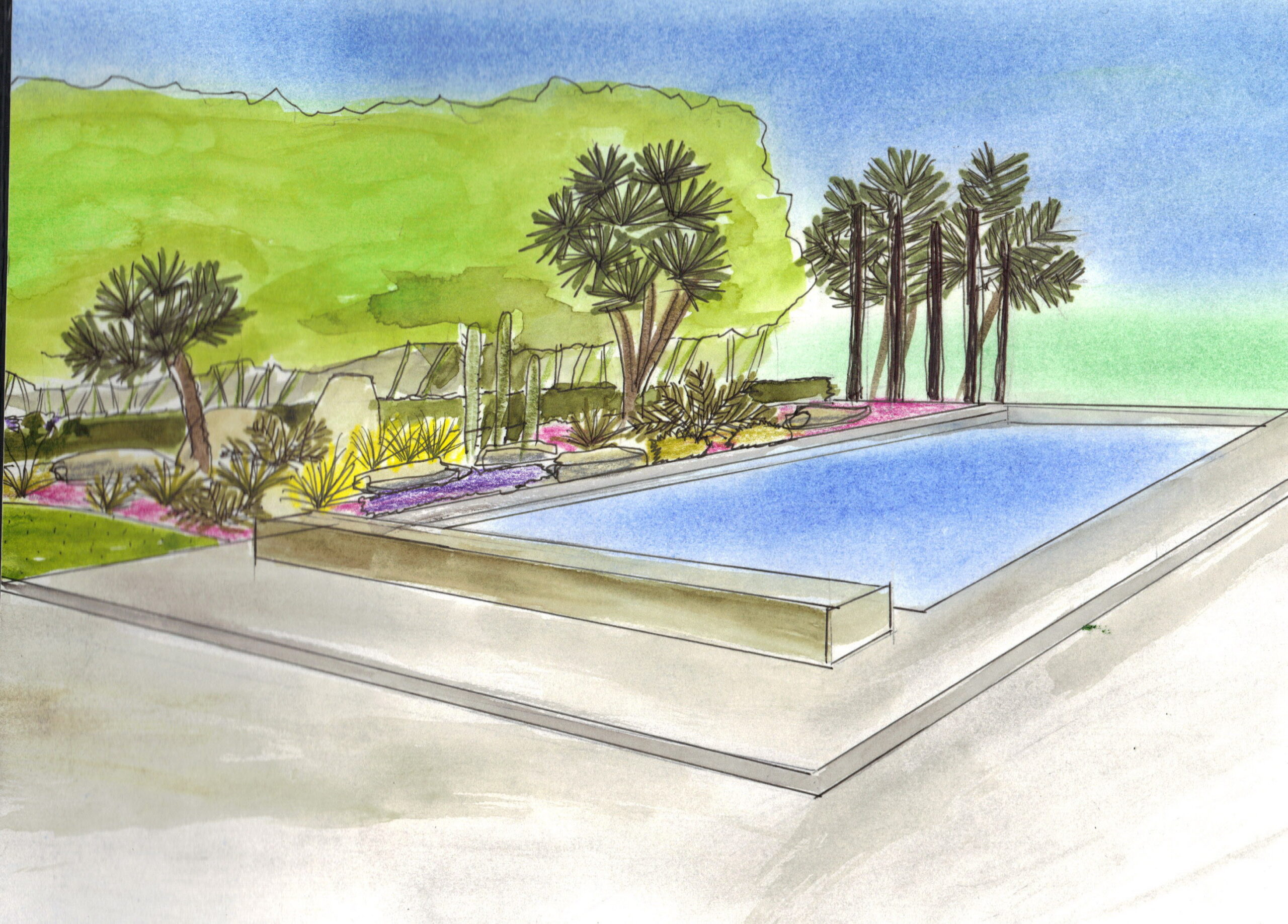 Un projet d’aménagement d’un jardin paysager d’une maison contemporaine, des toits terrasse, des espaces intérieurs ouverts sur le paysage de la plaine, la mer, le Canigou, des vis-à-vis importants à traiter au niveau de la piscine.