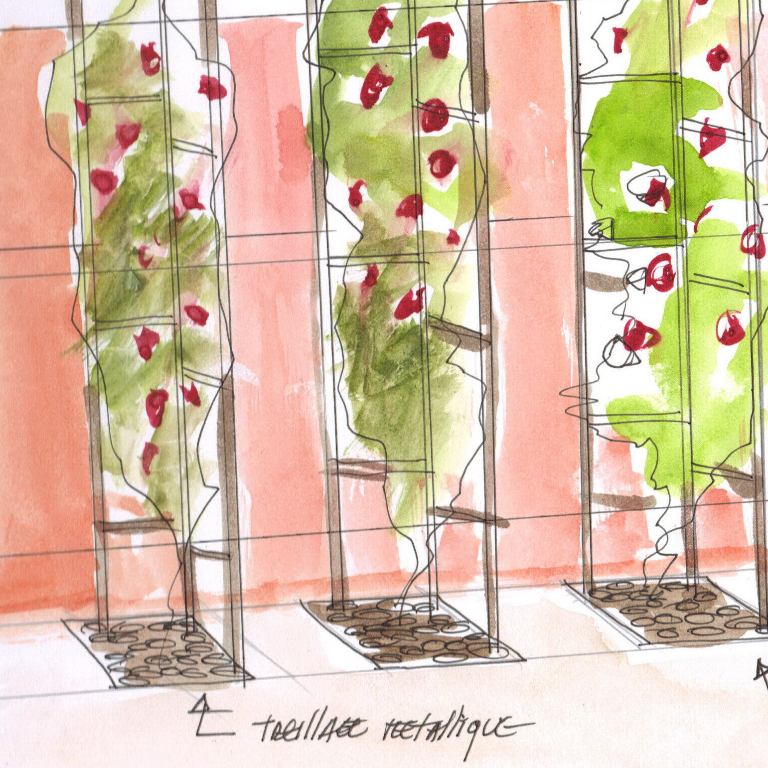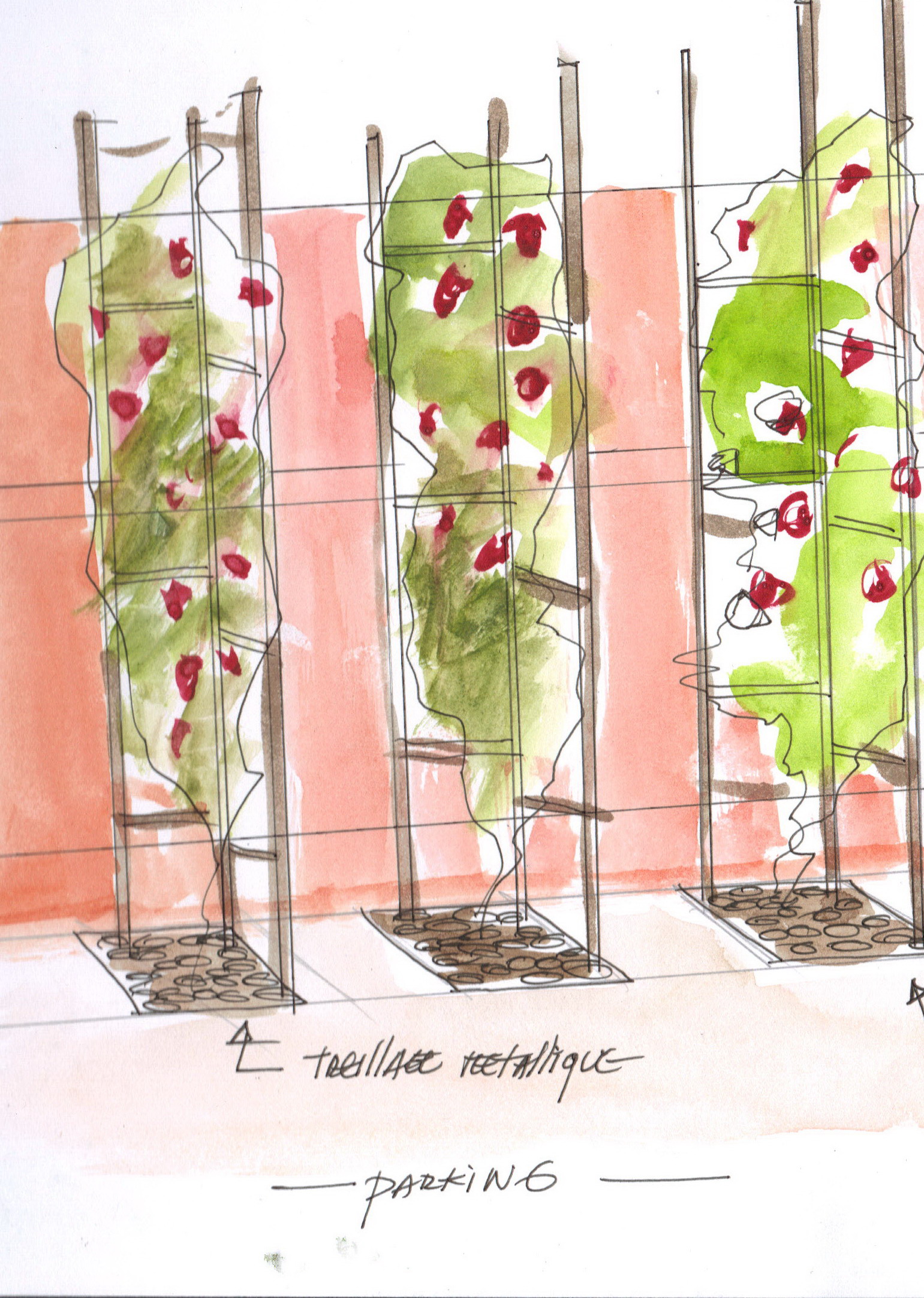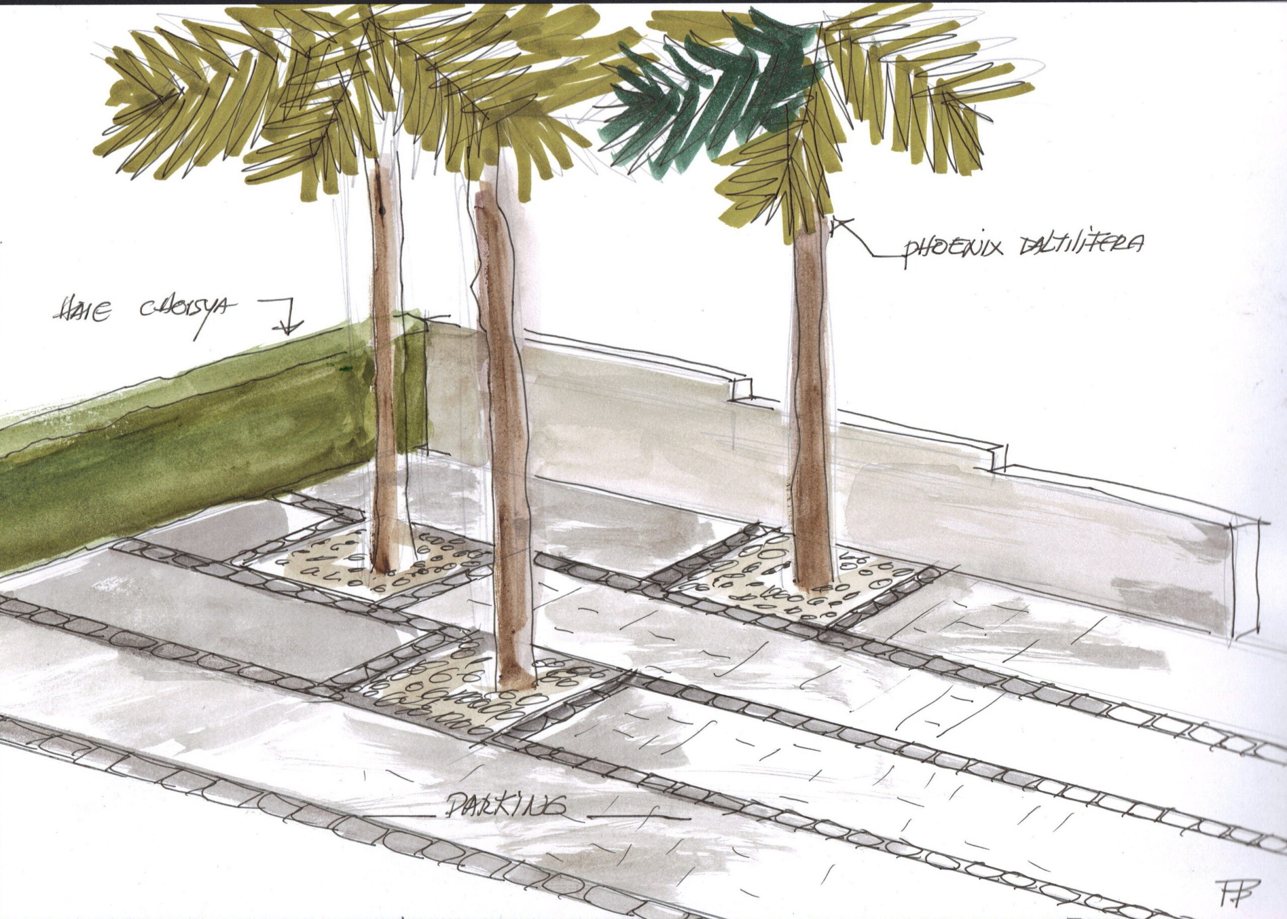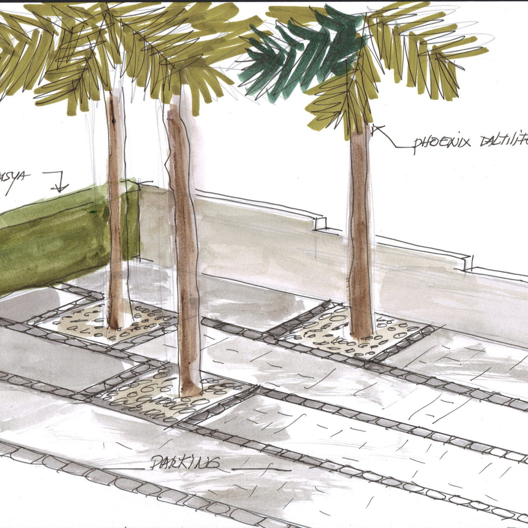 tout à la fois un espace de jeux pour les enfants, un parking en pavés de granit avec des lignes et des carrés de paves anthracite, trois palmiers, une haie d’oranger du Mexique, des colonnes végétales en treillages métal pour habiller le mur de la piscine.