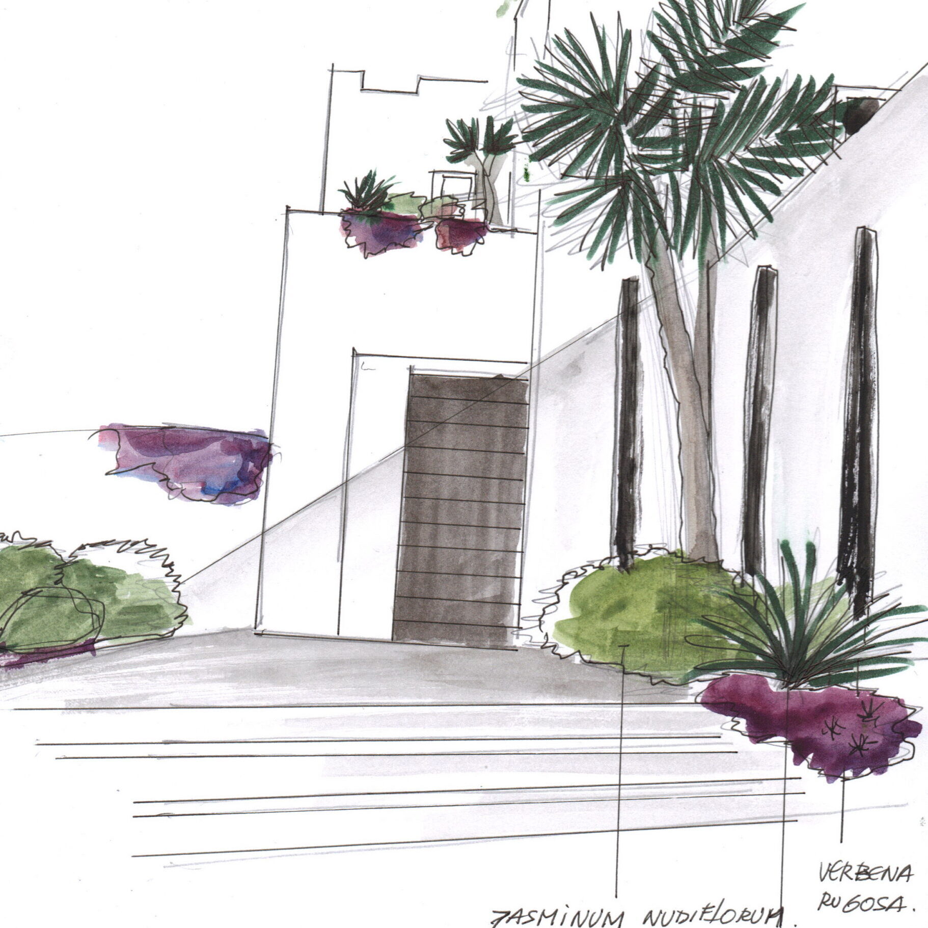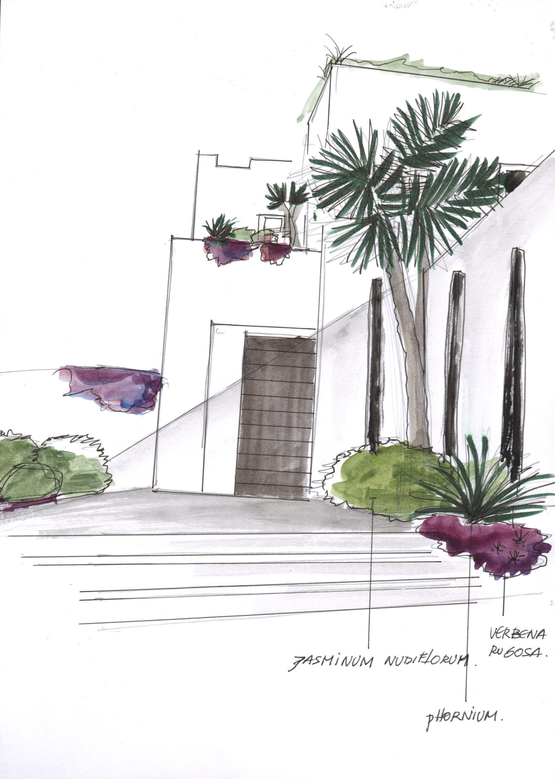 La sélection des plantes a été effectuée en tenant compte de la faible ressource en eau, d’un climat très chaud l’été, pour mettre en valeur l’architecture, apporter de la légèreté, de la couleur.