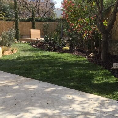 Une surface de gazon de type Zoyzia Nodiflora devant la terrasse, une espèce à croissante lente, nécessitant un à deux arrosages par semaine en période estivale.