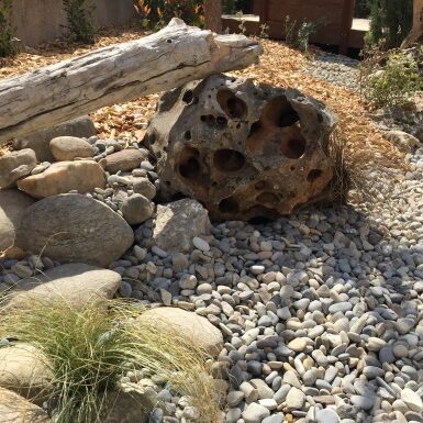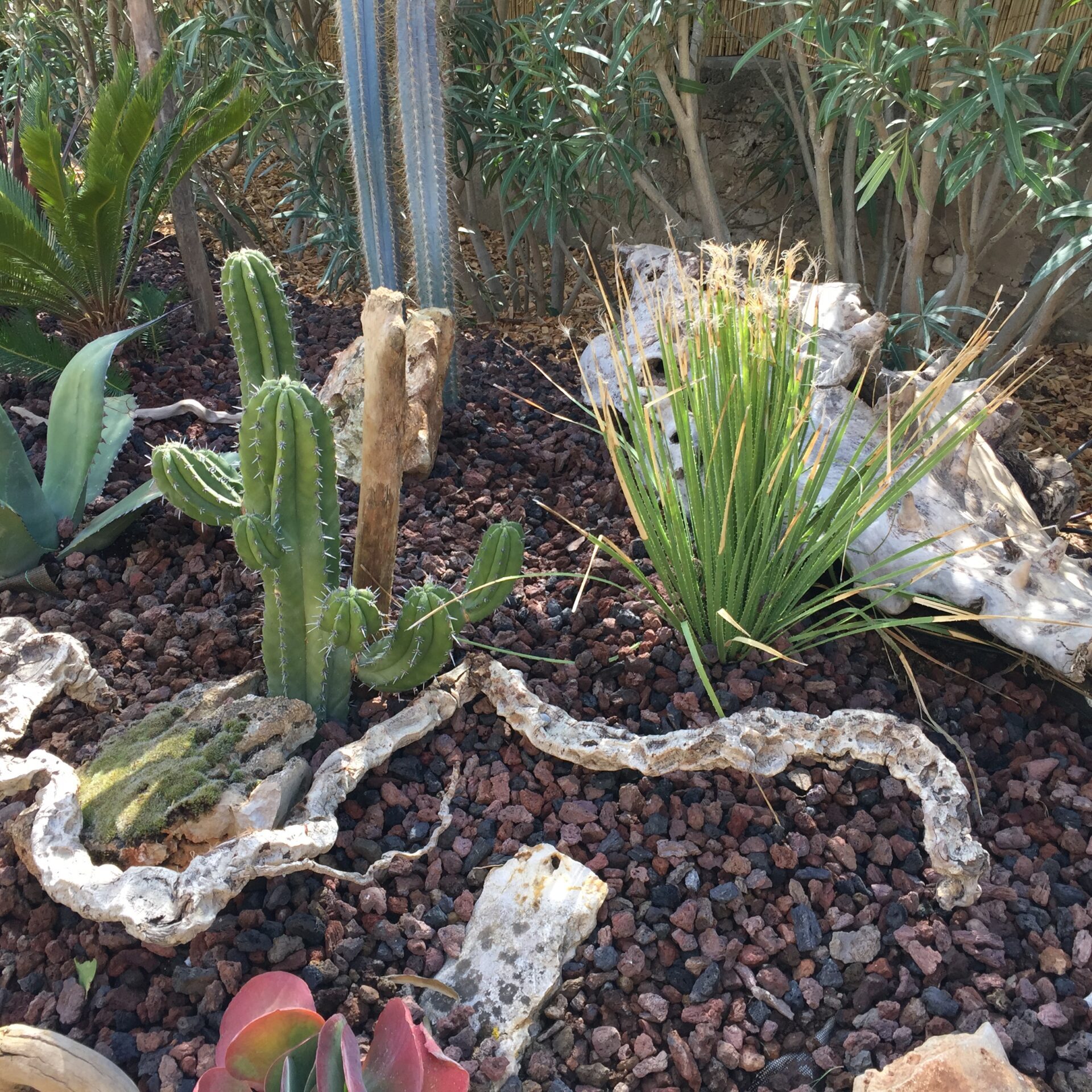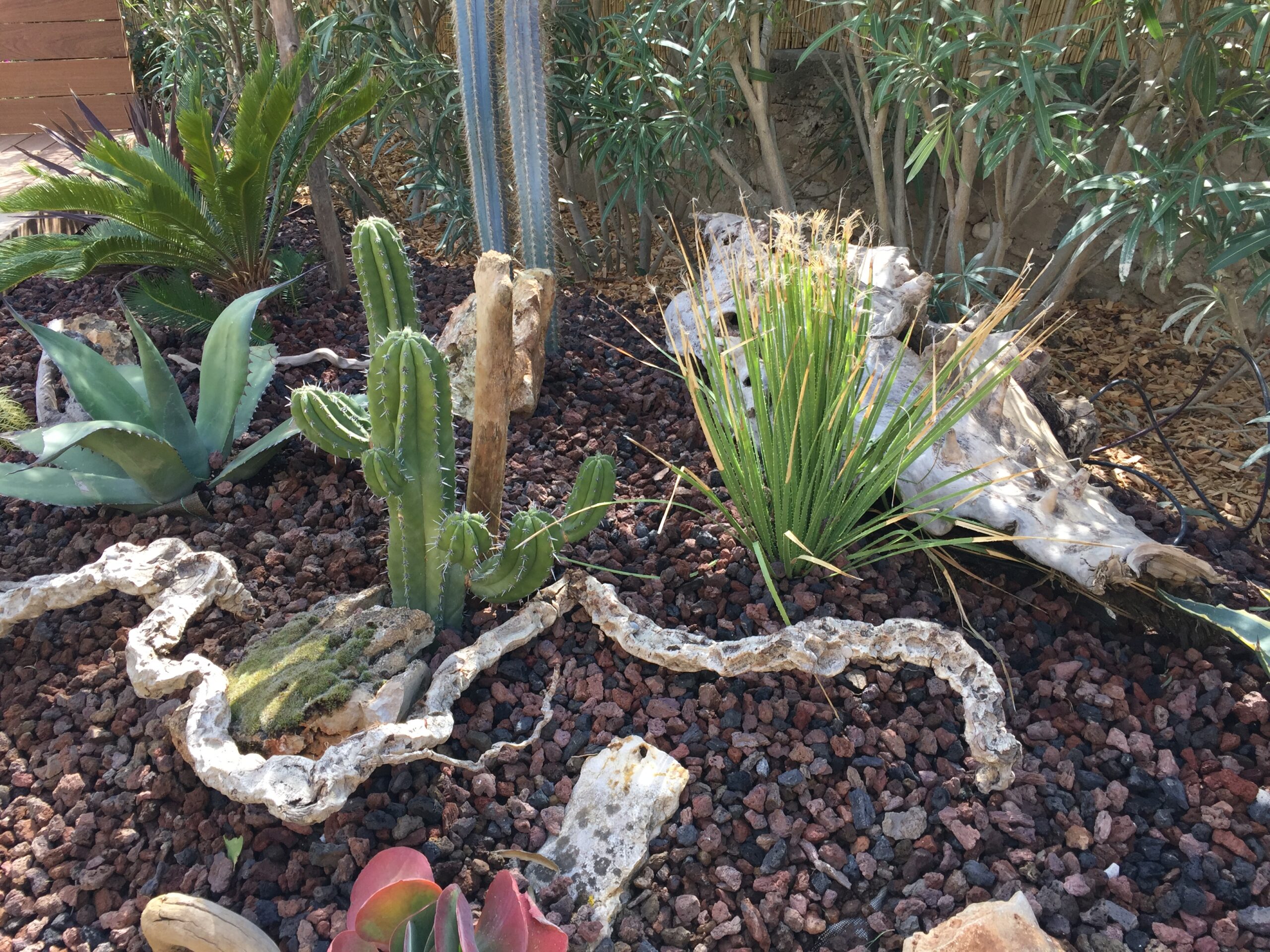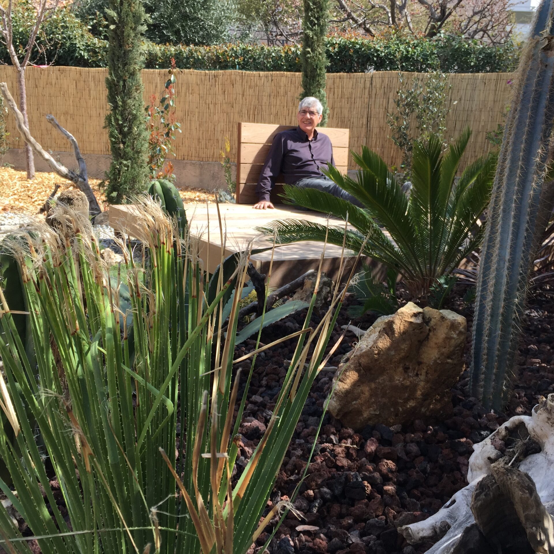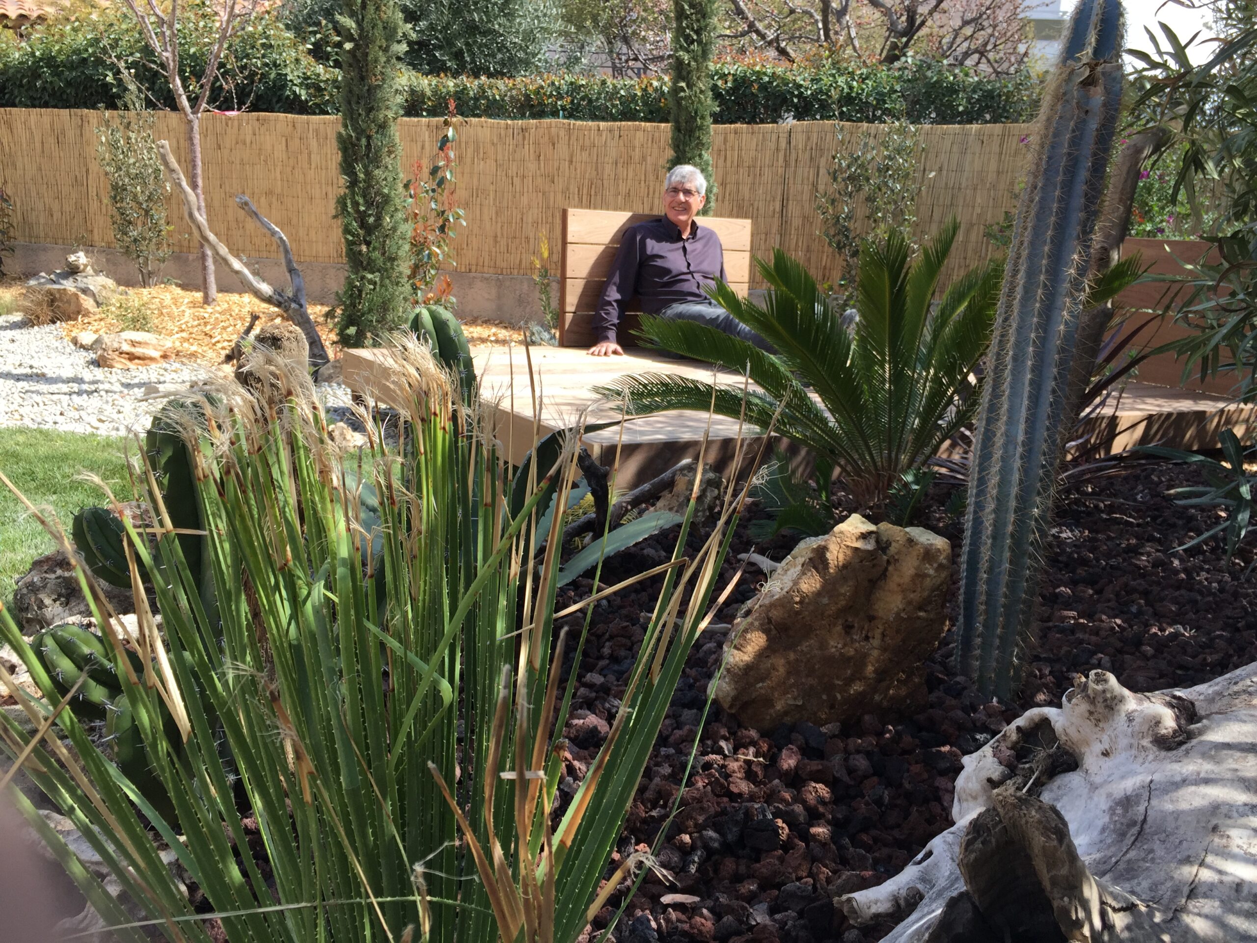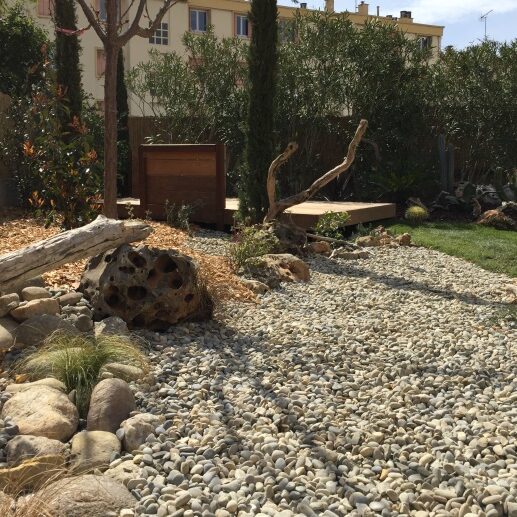 Le jardin sec, un décor minéral de roches et galets, des bois flottés, un ponton surélevé avec des dossiers pour se reposer, seul, à deux, derrière des cyprès (Cupressus Sempervirens Stricta) très fins, judicieusement positionnés cache les vis à vis des fenêtres de la maison voisine.