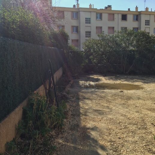 Le bassin de l’espace piscine occupe l’essentiel de la place, la végétalisation se trouve limitée, la façade de l’immeuble est partiellement occulté par un treillage métallique sur laquelle pousseront des plantes grimpantes et au fond une jardinière de végétaux exotiques, Yucca Rostrata, Chamaerops, Dassylirion, Draceana multi-tronc..