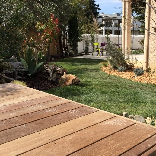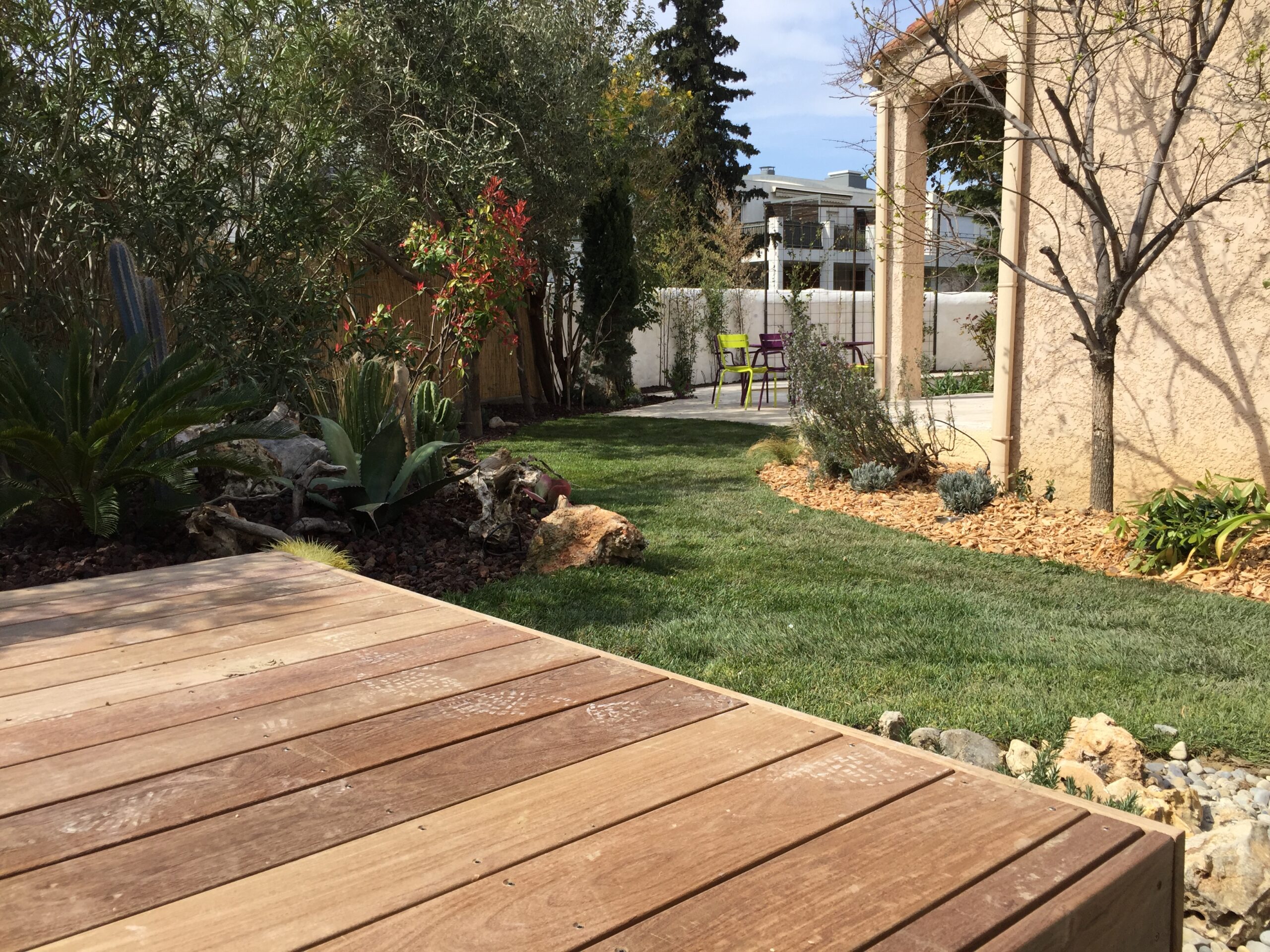 Un jardin structuré en 4 zones, le jardin sec, le gazon, la terrasse repas  l’espace piscine.