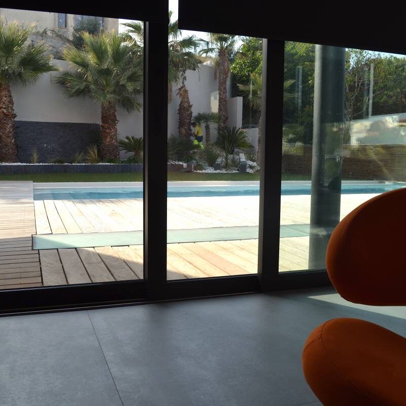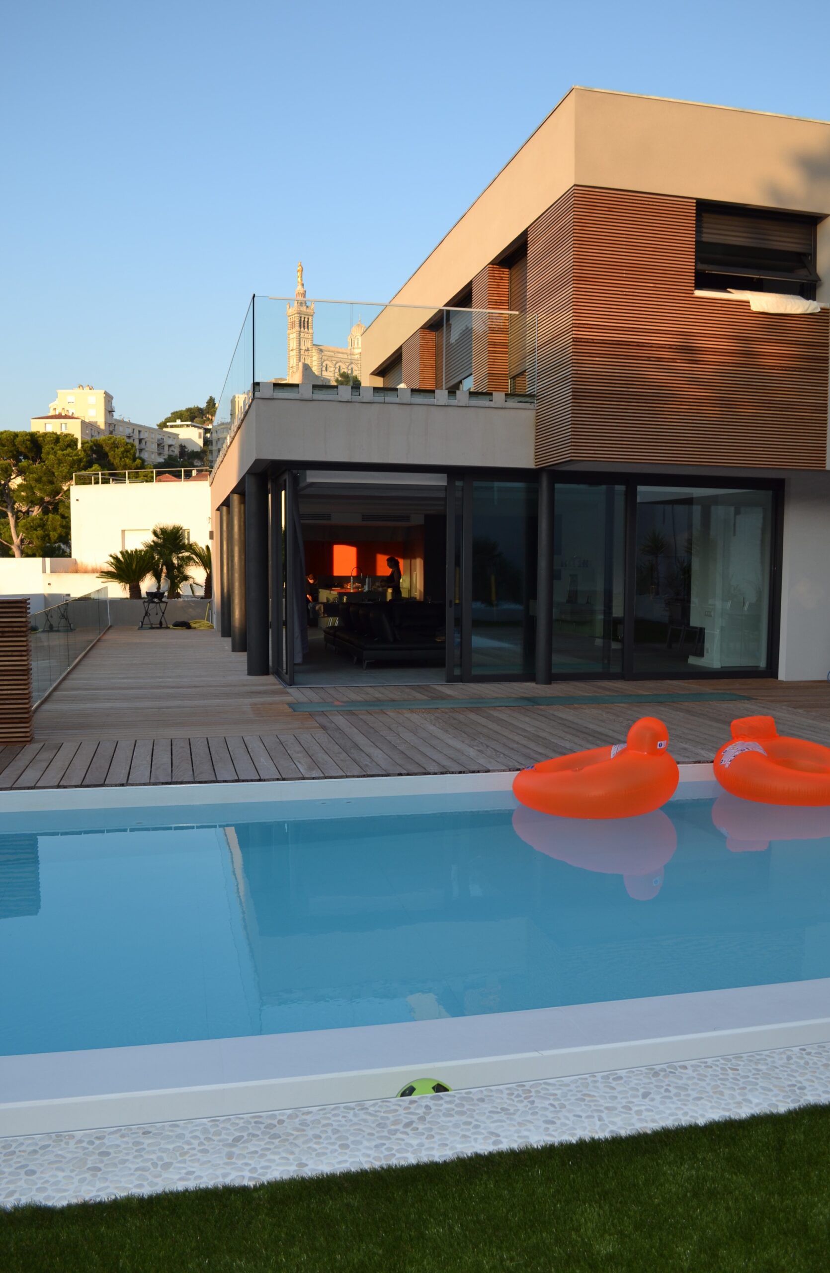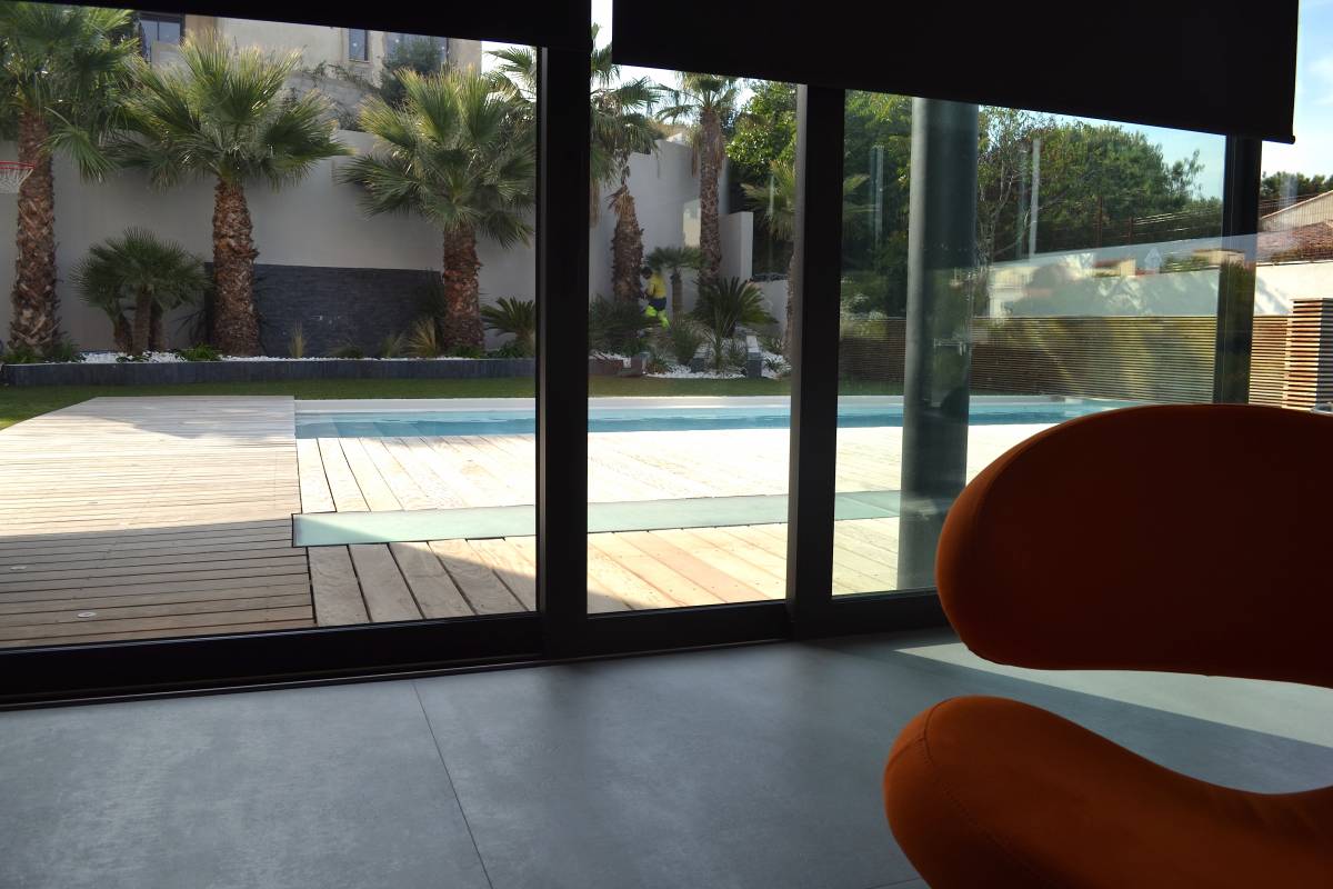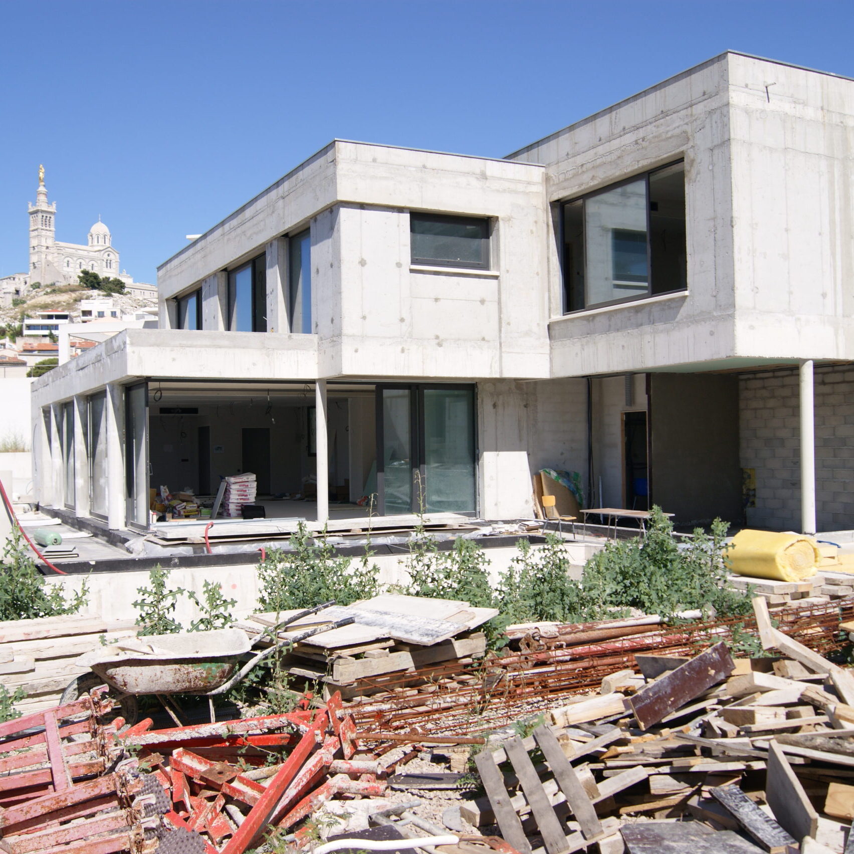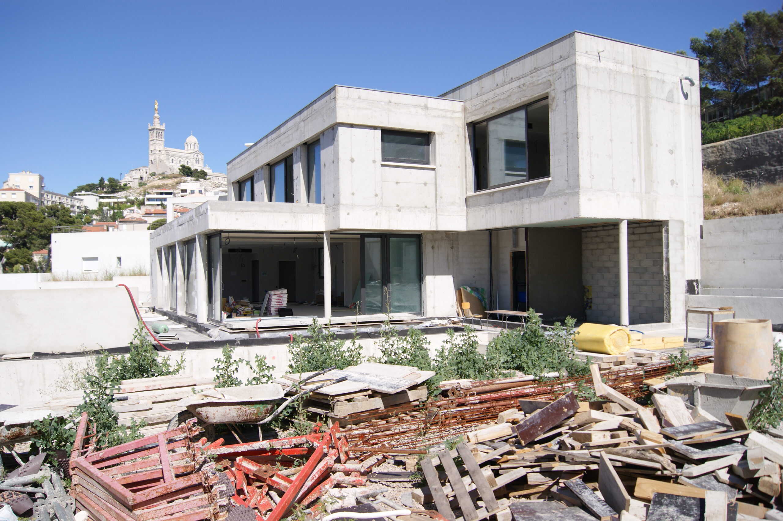 Une maison contemporaine bénéficiant d’une vue sur la mer, qui a fait l’objet pour son implantation de terrassement important, de construction de murs en béton élevée, notamment sur la zone piscine.