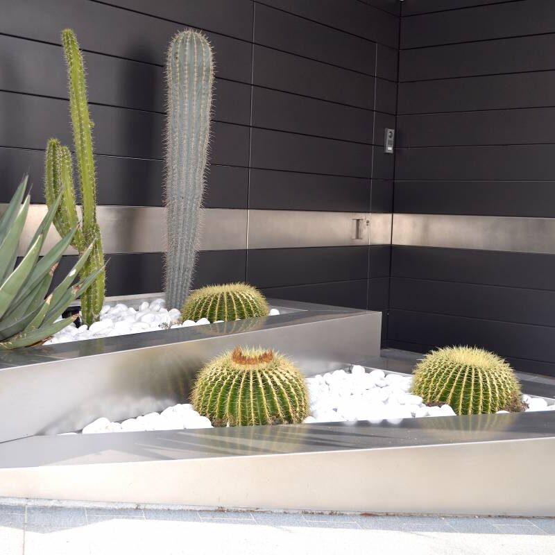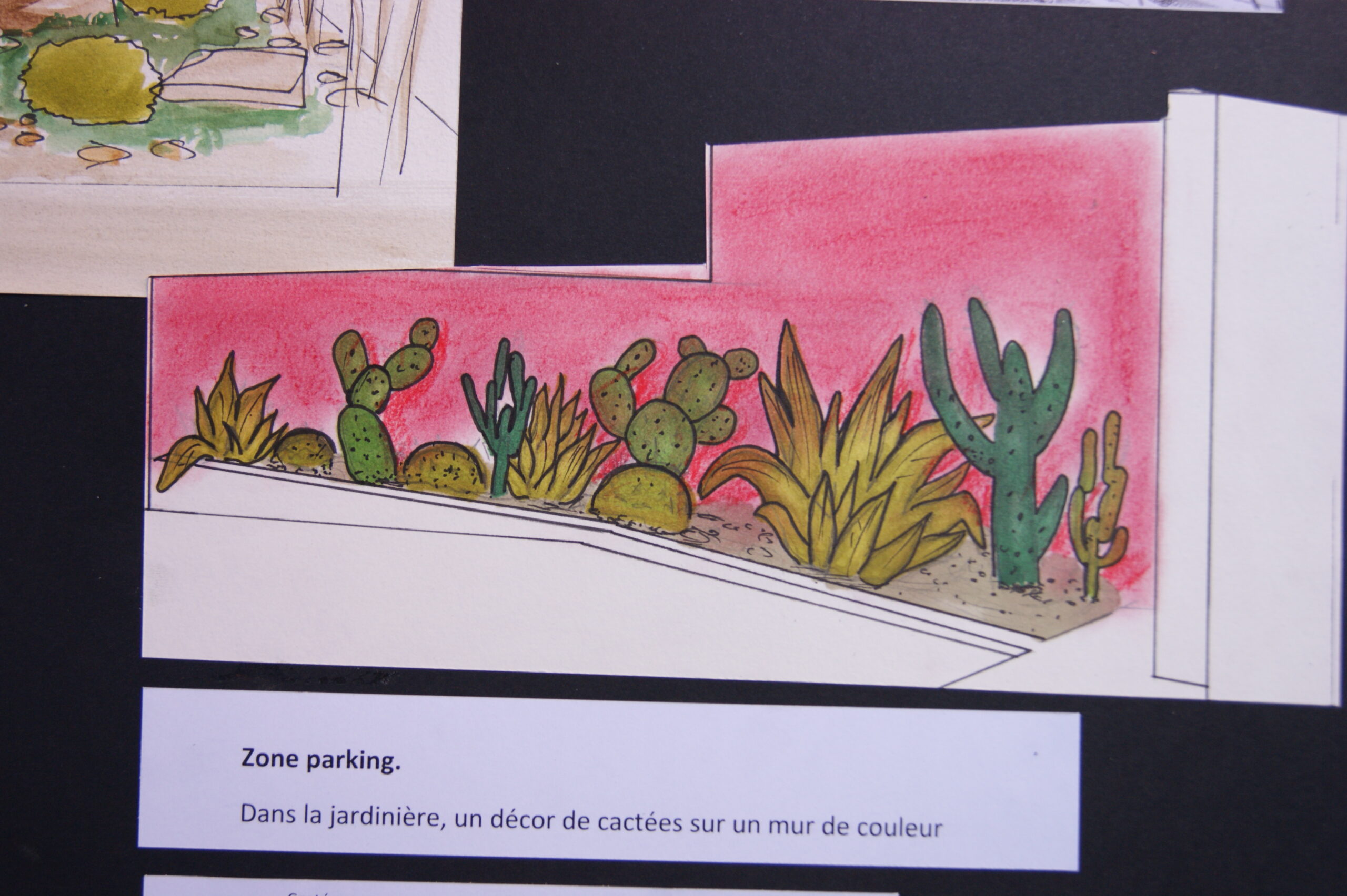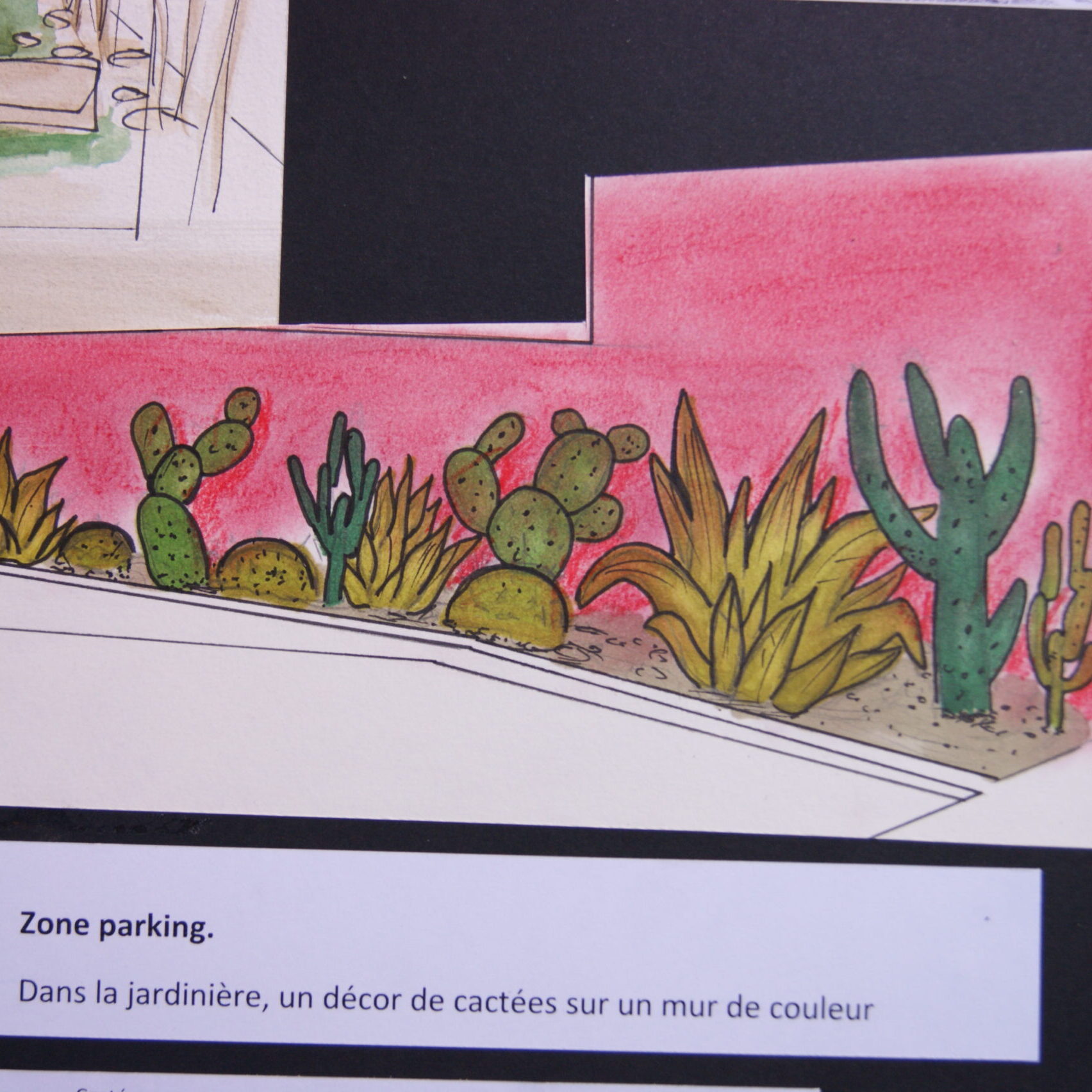 Dans la jardinière, un décor de cactées sur un mur de couleur