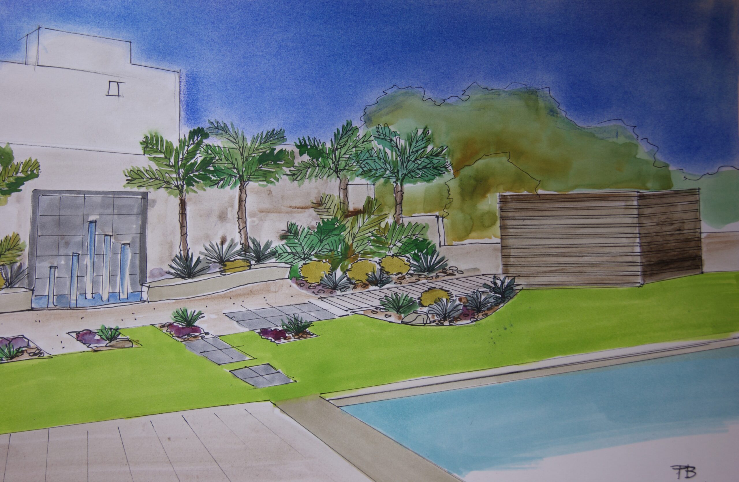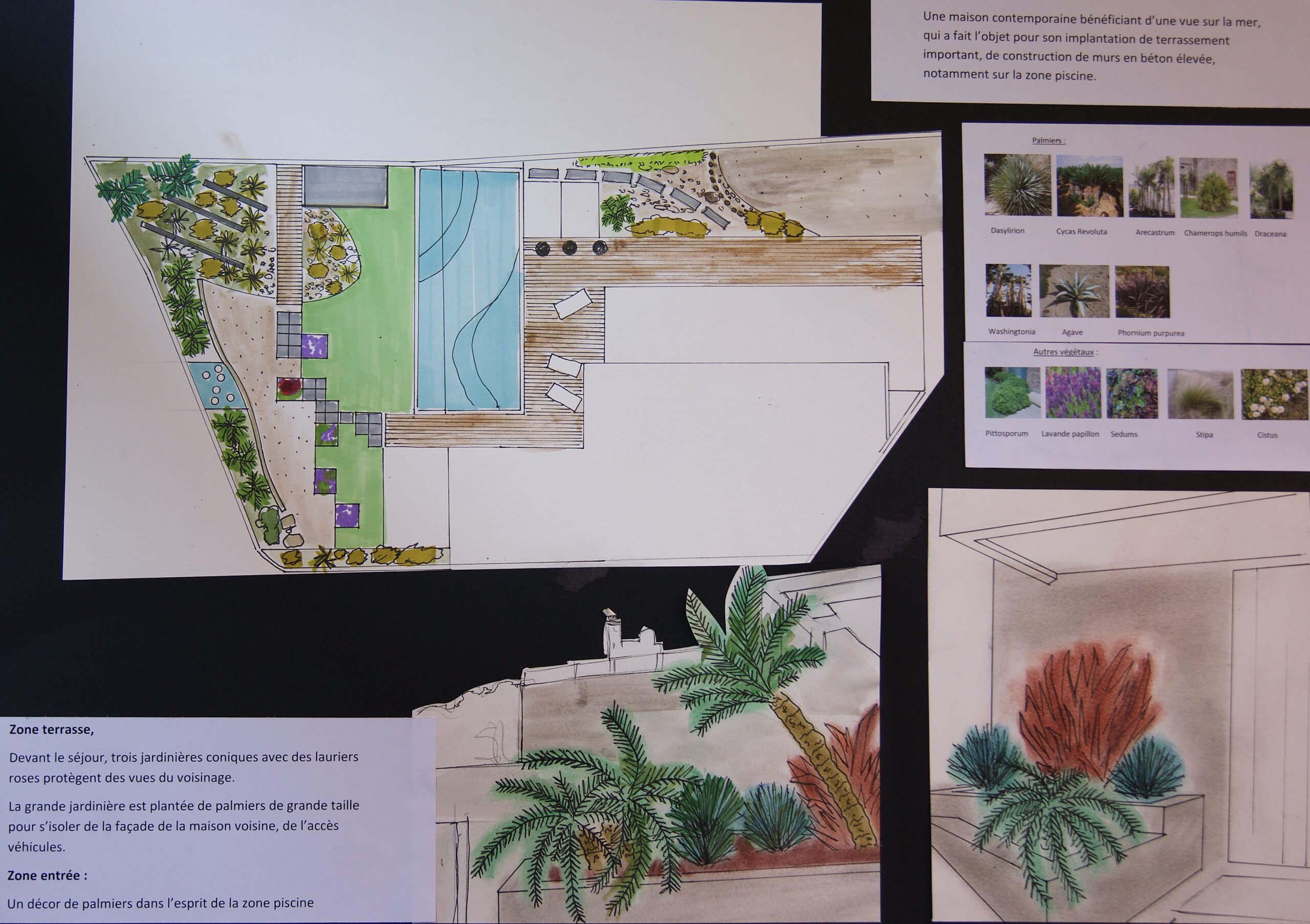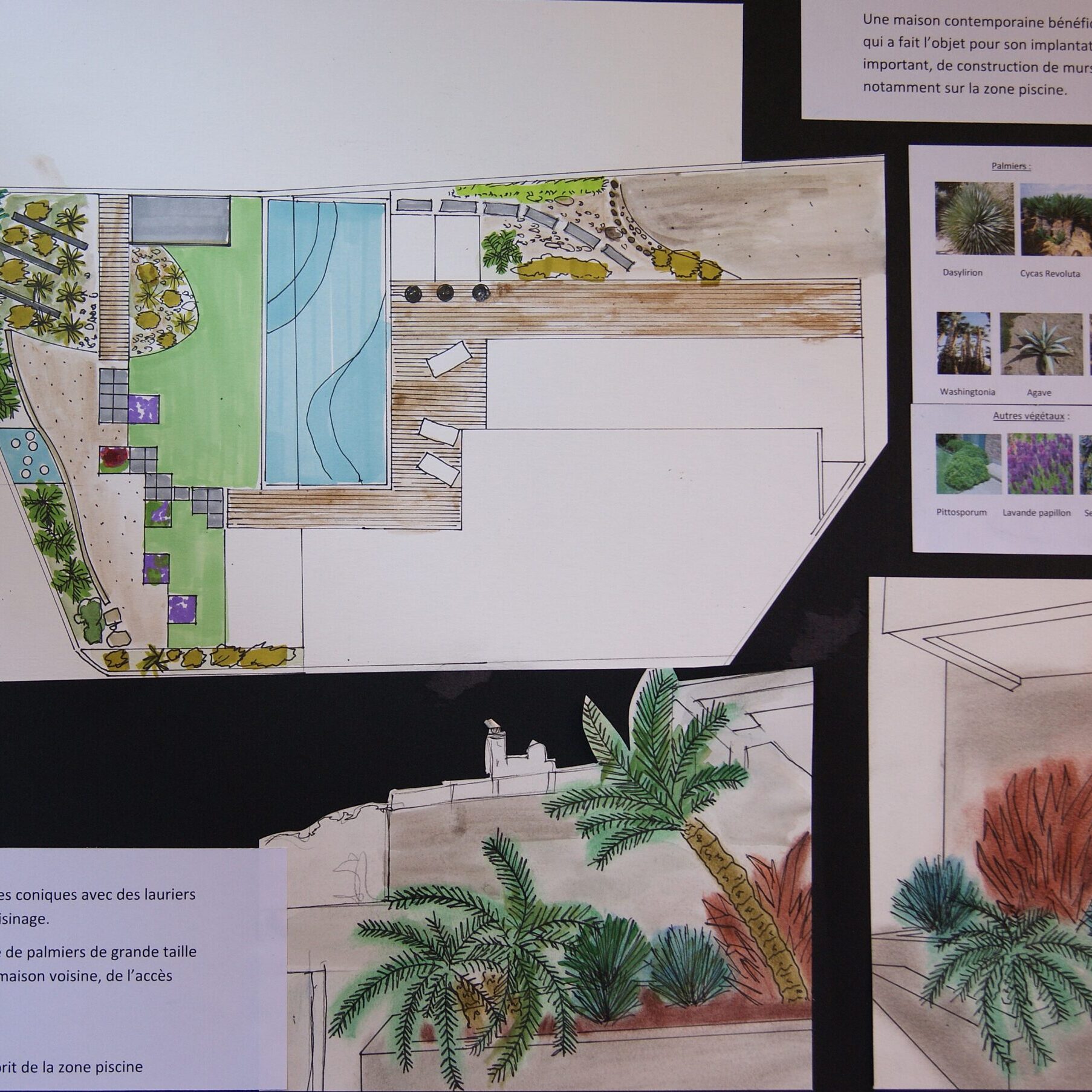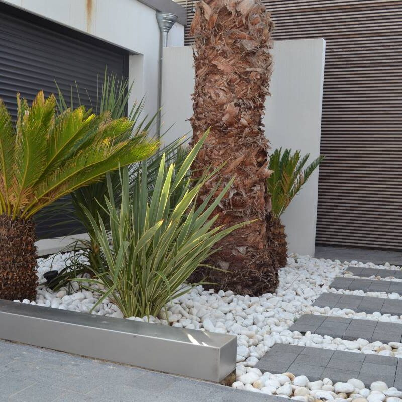 Une ambiance « jungle » à droite, avec sa végétation très dense, des palmiers, des Pittosporum boule, des Cycas…   le graphisme des murets dans le sens de la perspective, un décor de roches et galets.