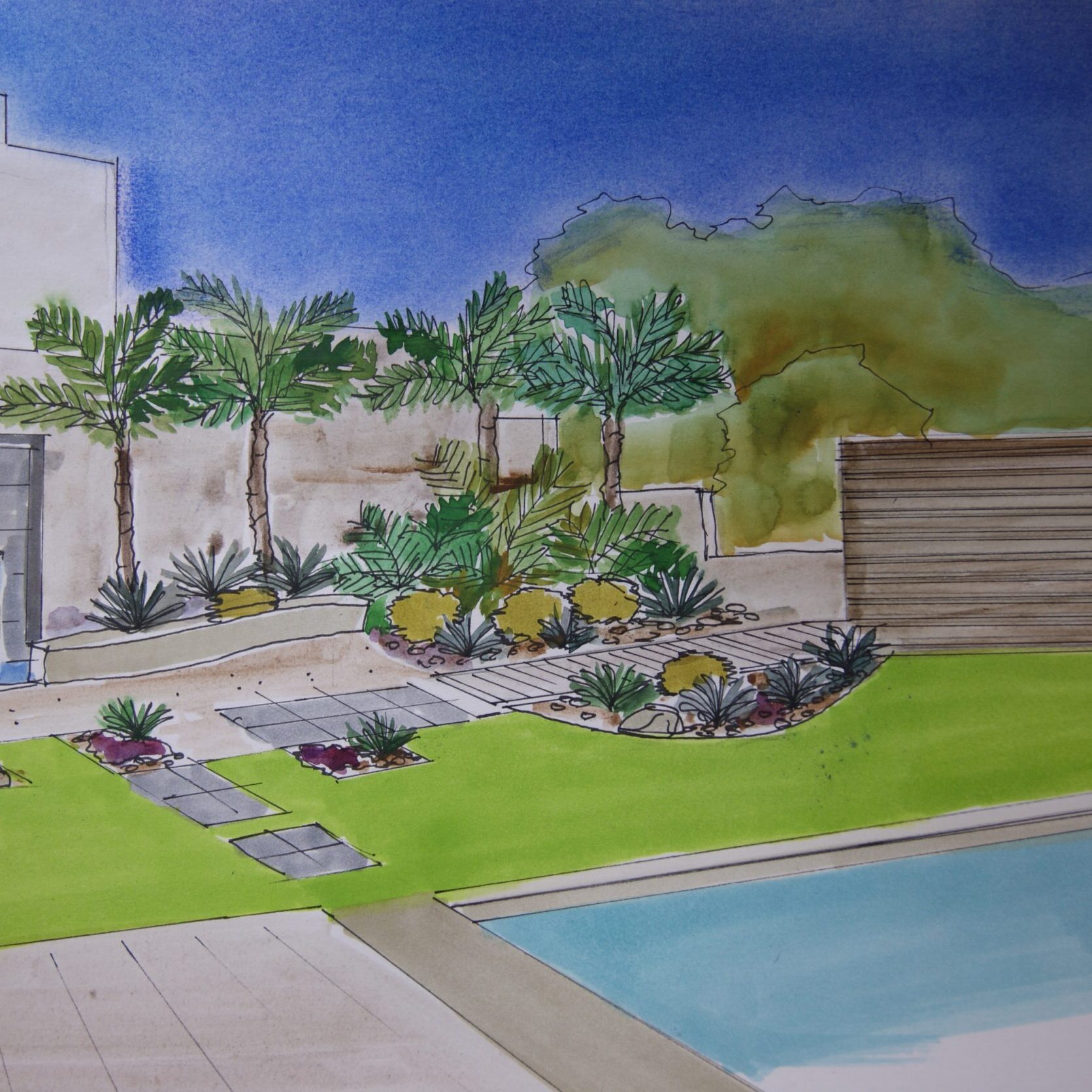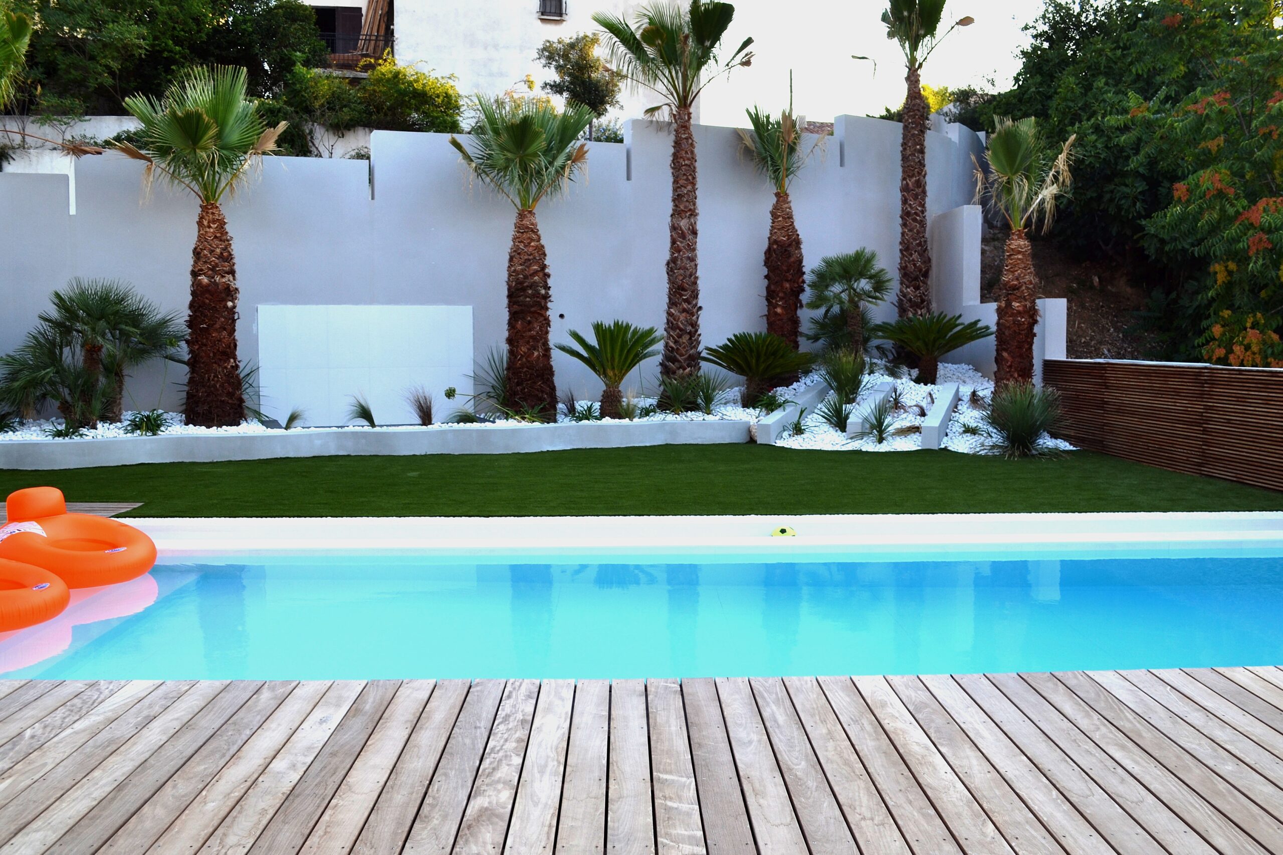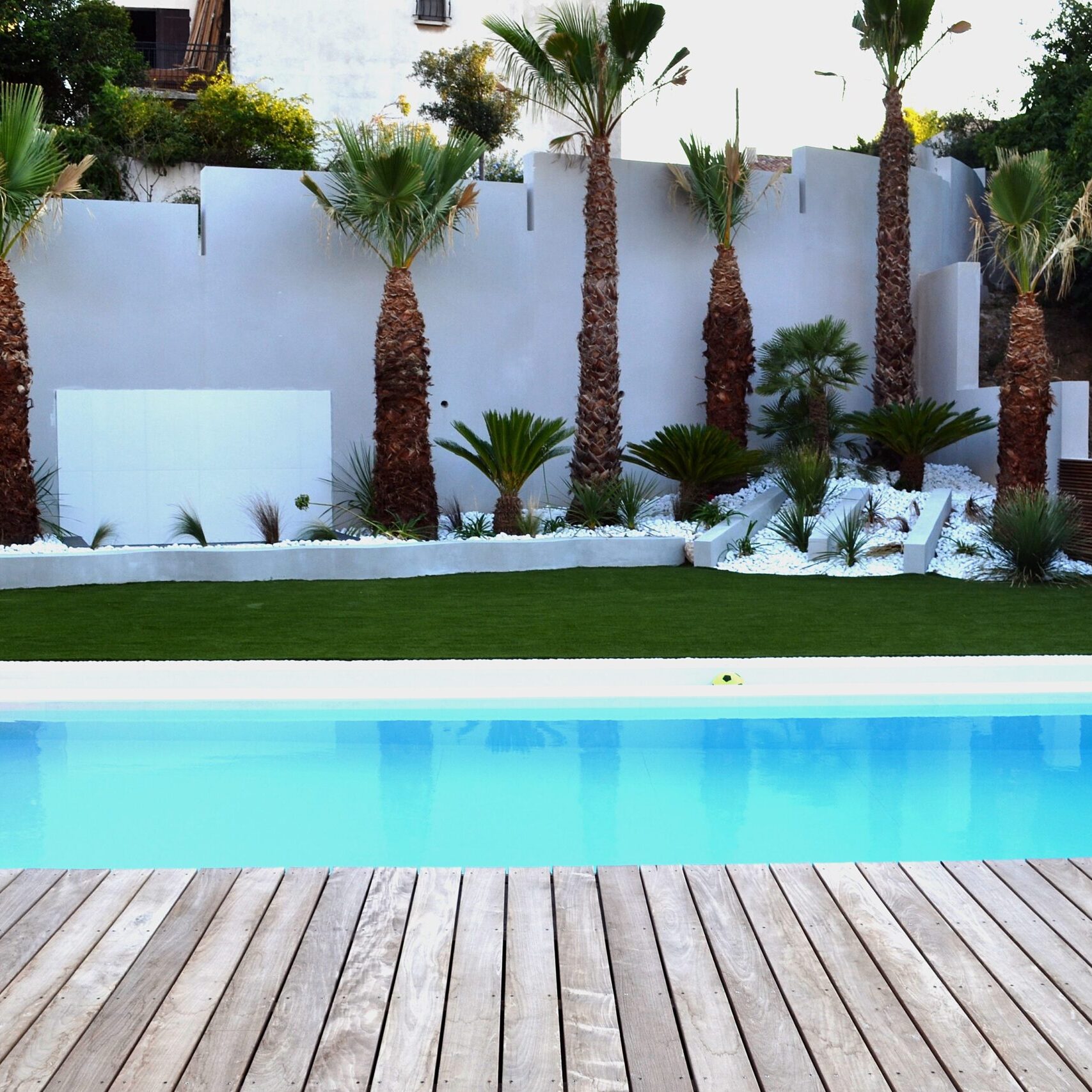 Une zone de gazon synthétique, devant la piscine et une zone de gravillons roulés le long du muret « serpent ».