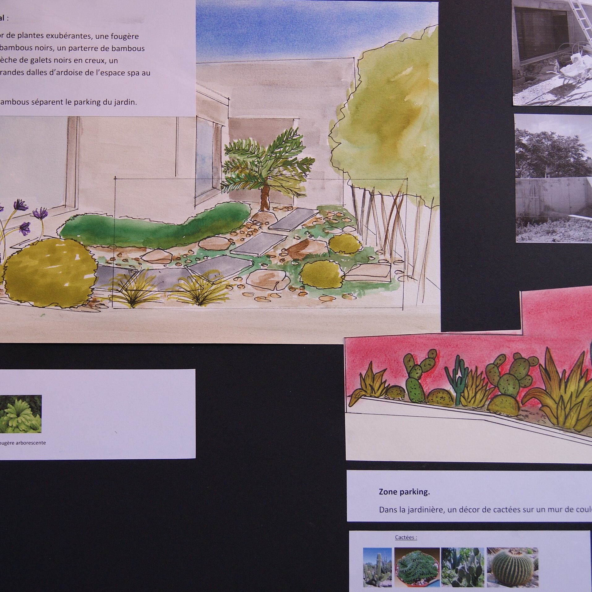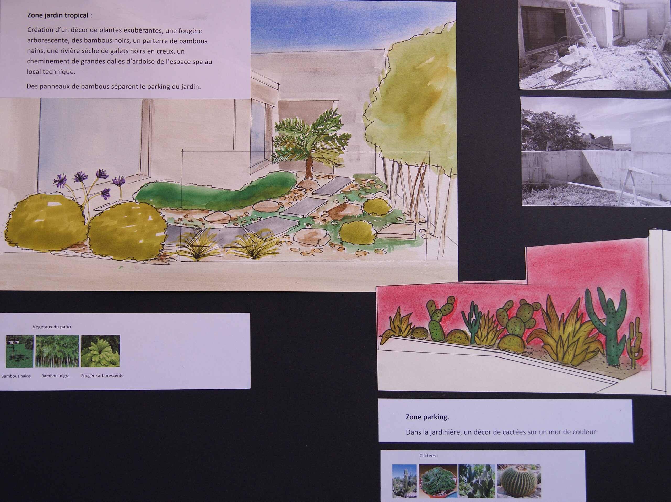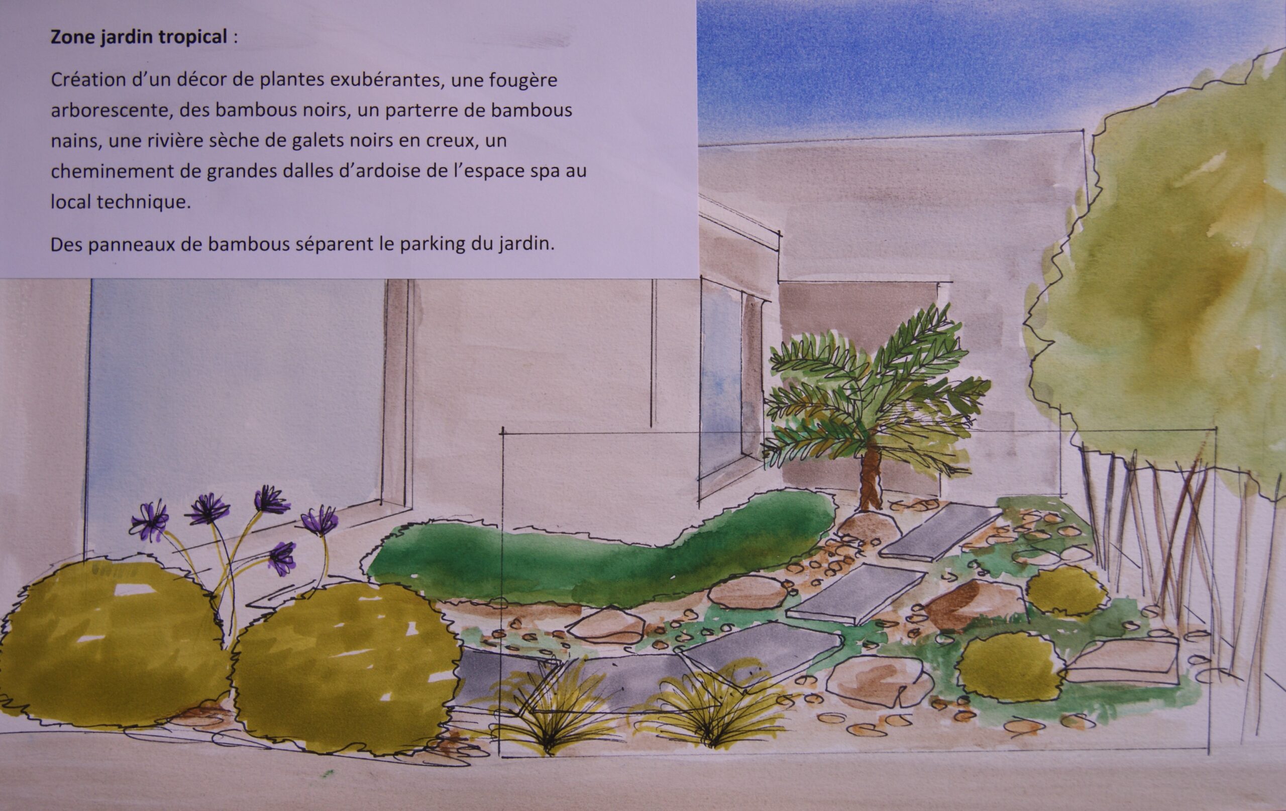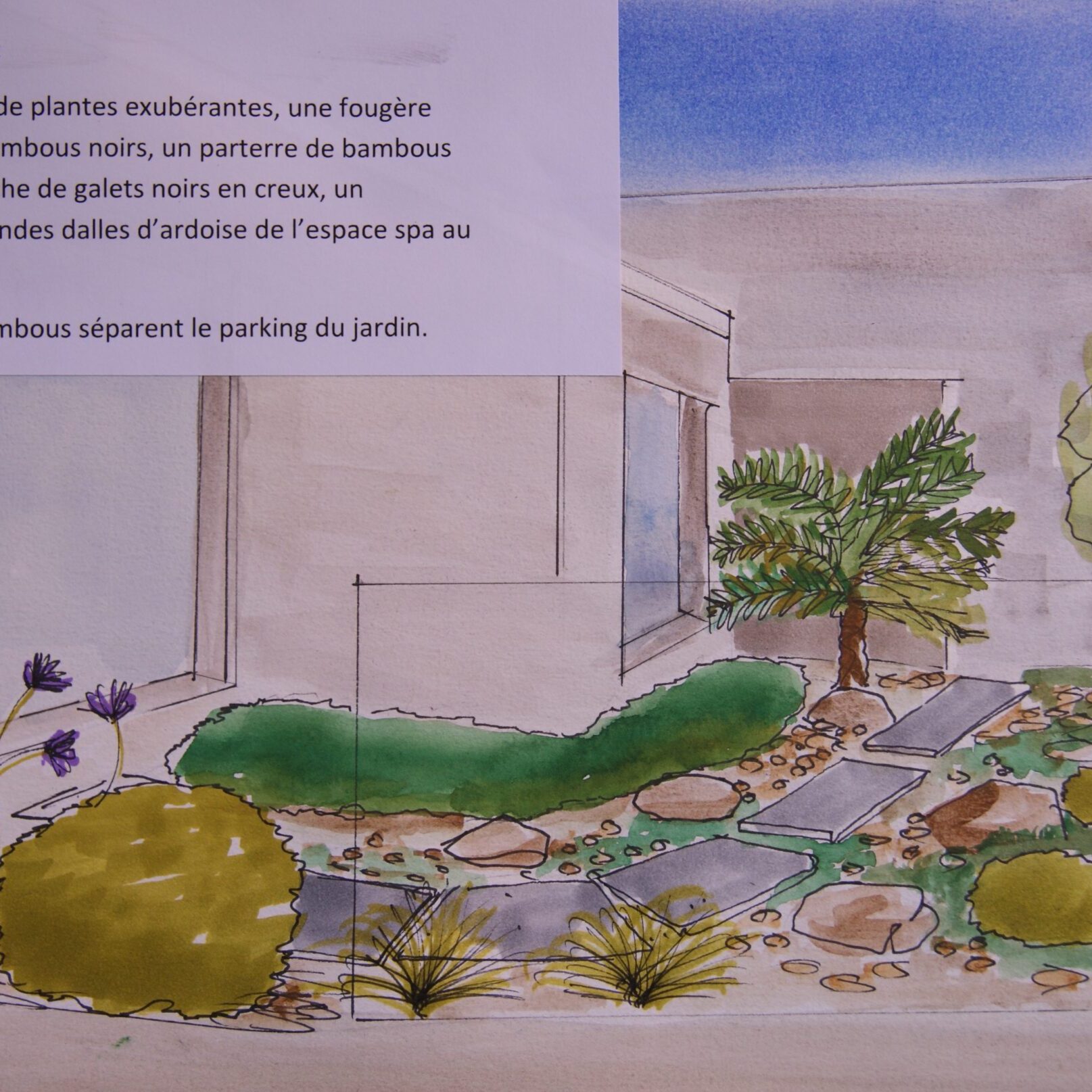 Création d’un décor de plantes exubérantes, une fougère arborescente, des bambous noirs, un parterre de bambous nains, une rivière sèche de galets noirs en creux, un cheminement de grandes dalles d’ardoise de l’espace spa au local technique.
