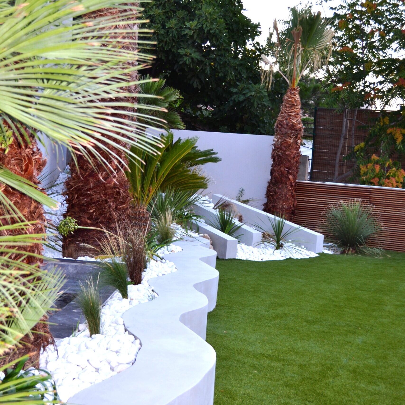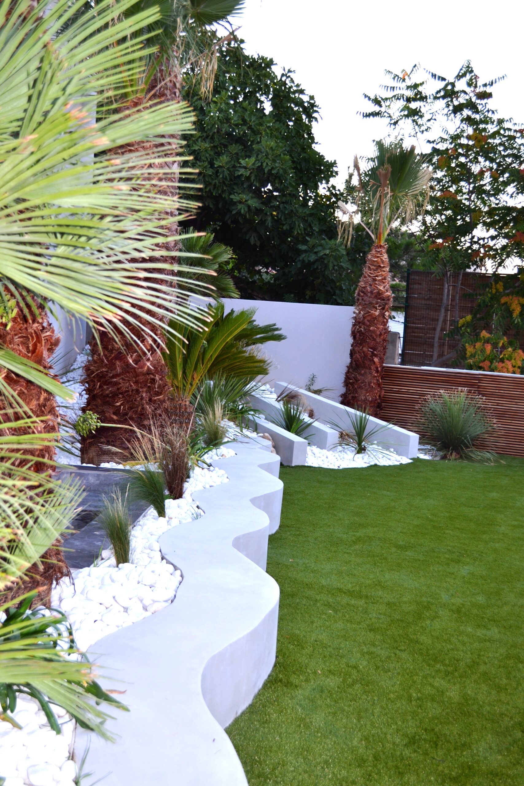 Un muret « serpent » blanc permettant de s’assoir, avec des palmiers de grandes dimensions, habillant le mur de soutènement de plus de 5 mètres.