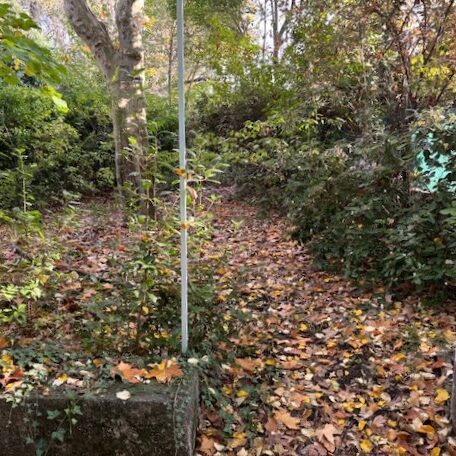 Le chemin du portillon, les lignes de palis d’ardoise couleur anthracite prolongées par des pas japonais en pierres calcaire du lot, au sol, des gravillons de rivière