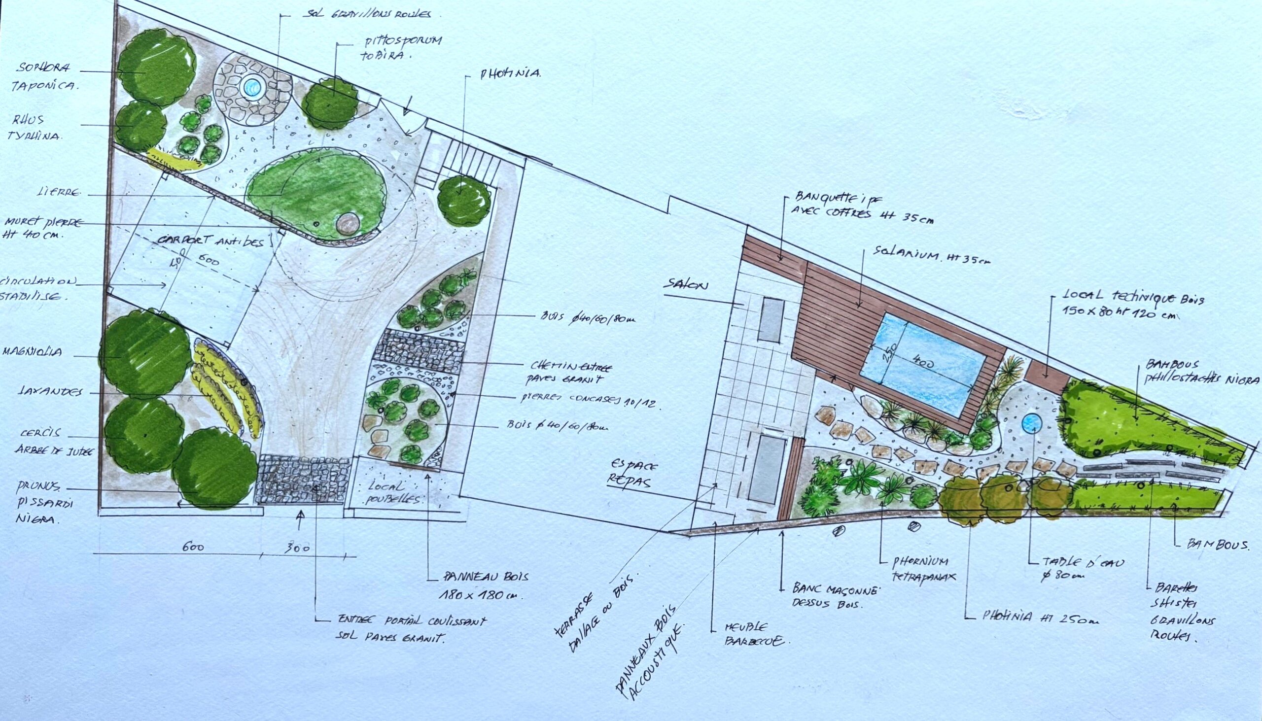 Le décor végétal en limite de la rue, des Bambous noirs très graphiques, un cercle avec au centre, une table d’eau, derrière le local technique de la piscine.