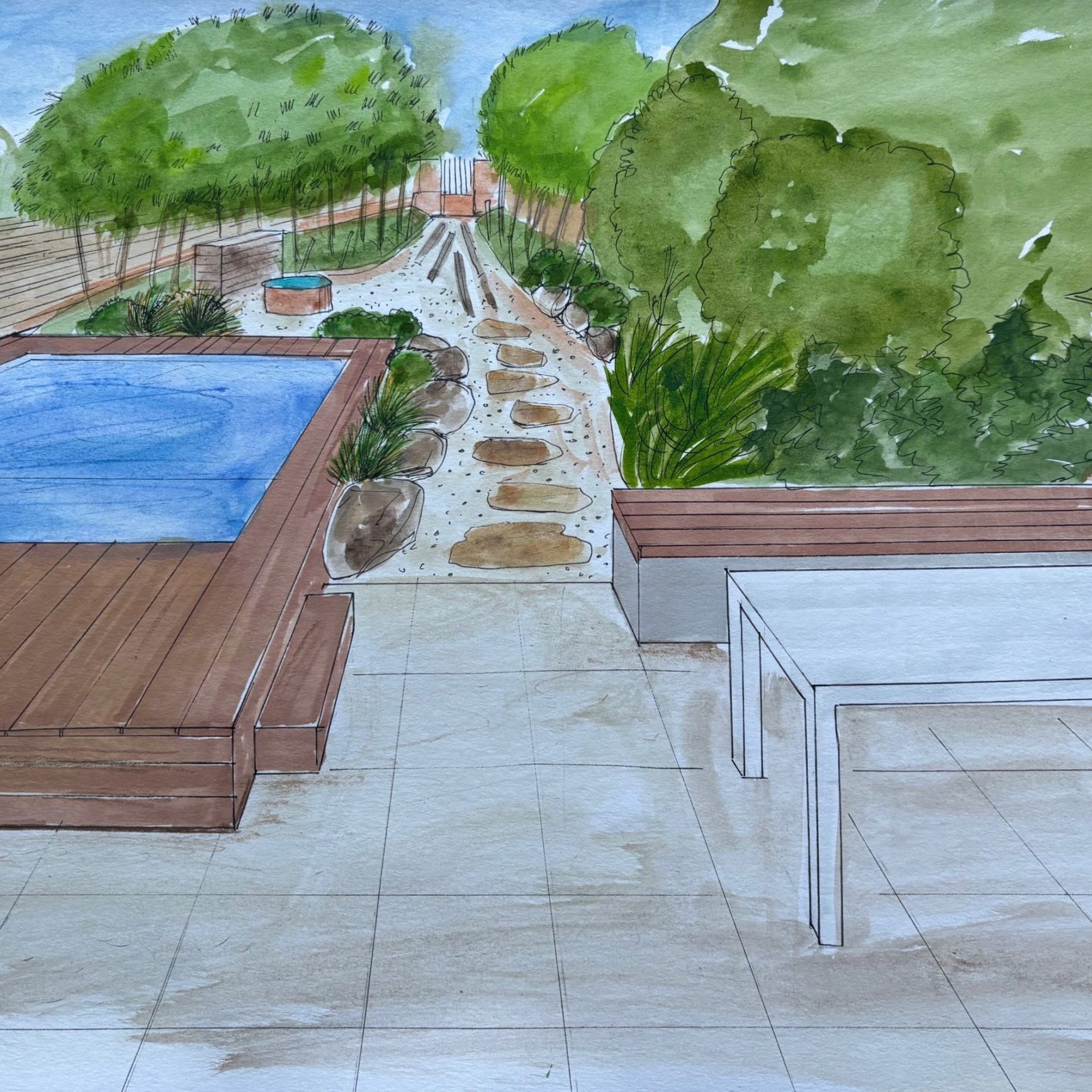 Un jardin intime inspiré par le principe des jardins japonais, en jouant sur les volumes (piscine, massifs), les différents matériaux, (pierres, gravillons, bois, acier Corten), la végétation pour suggérer dans un espace réduit, un décor naturel.