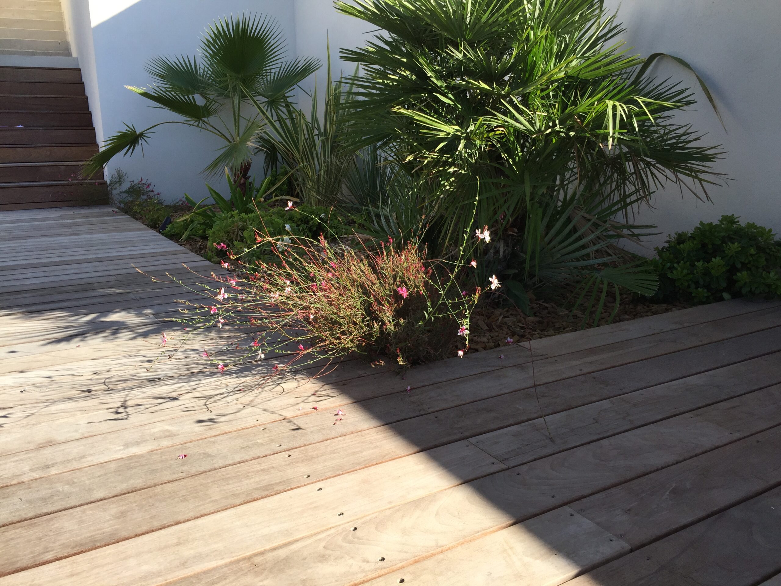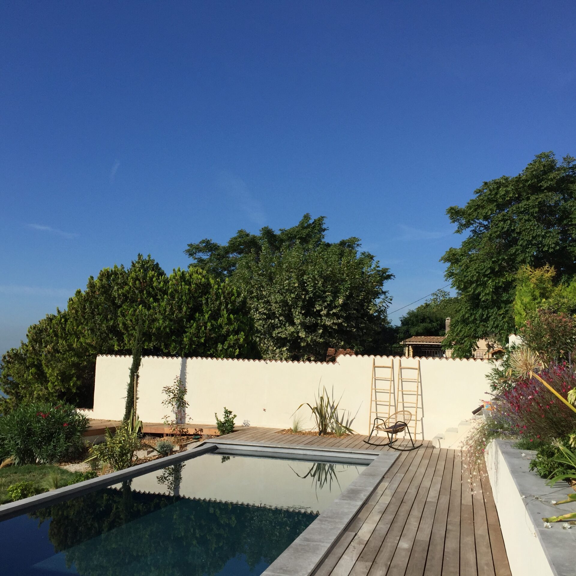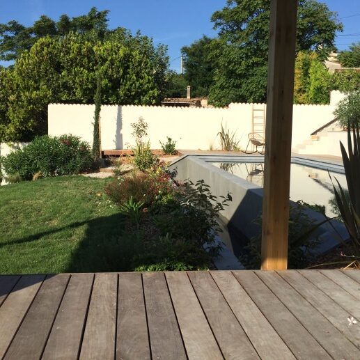 Pour terminer, Le choix des matières ; béton, bois participe au caractère contemporain de ce jardin.