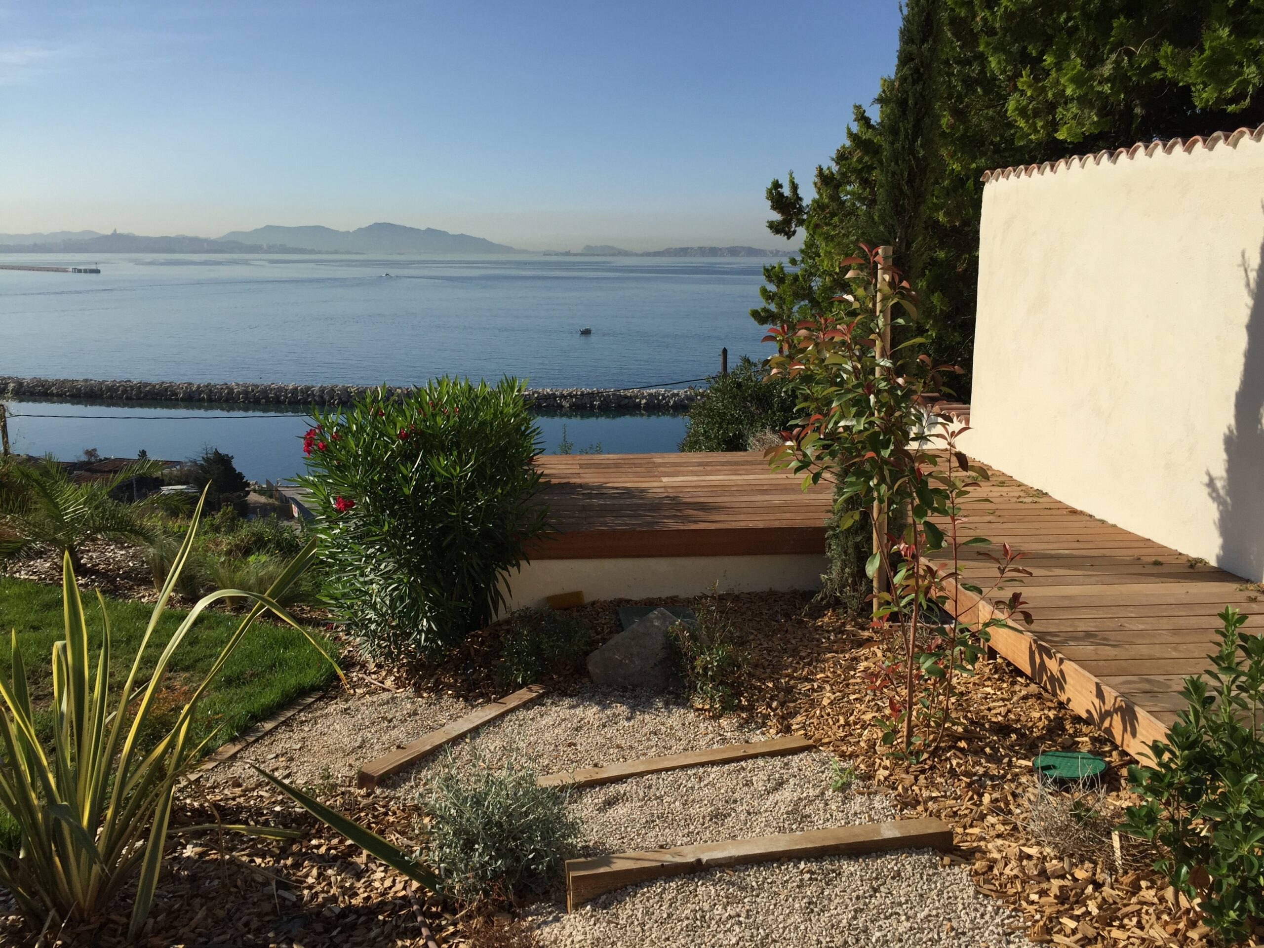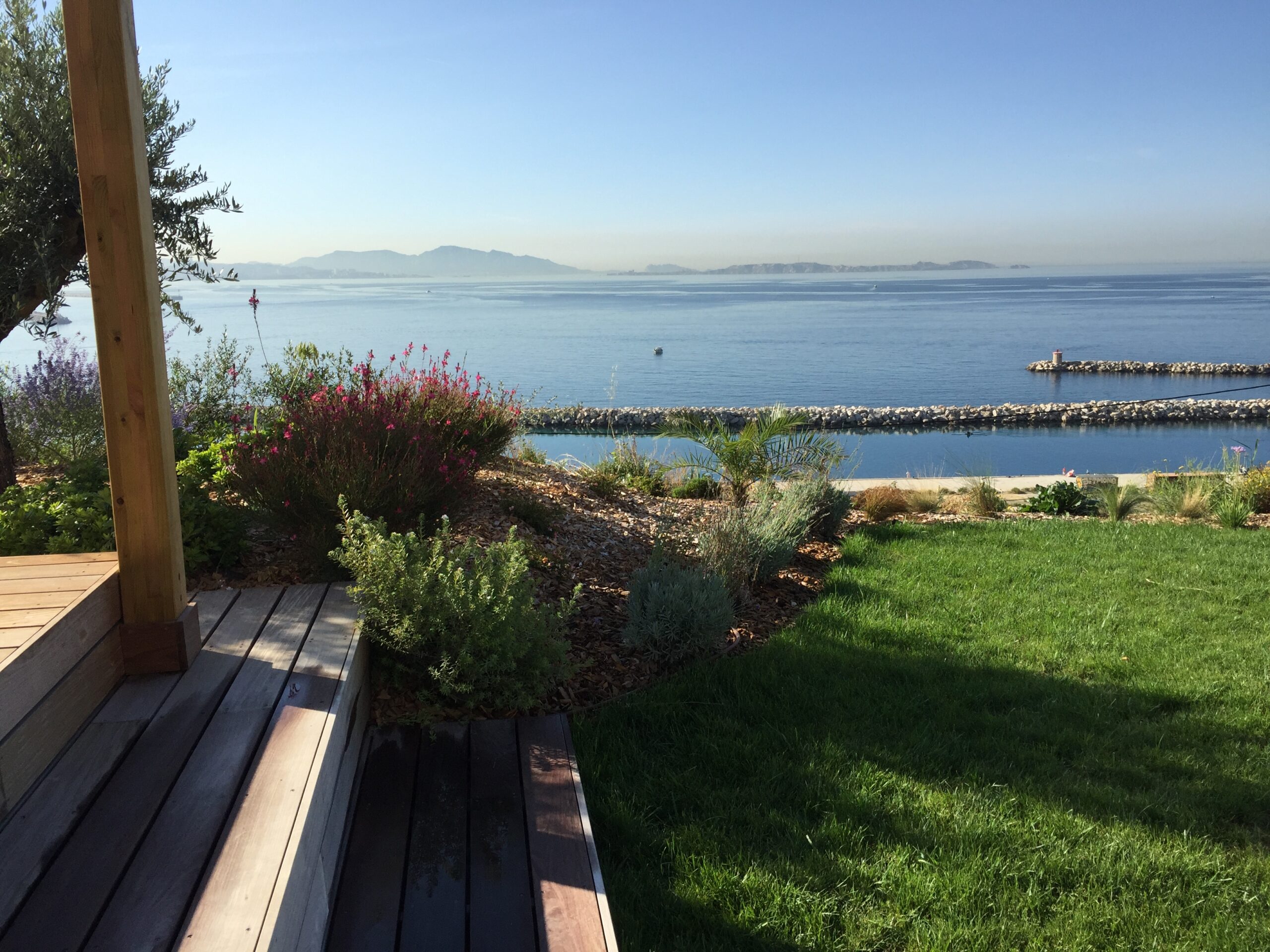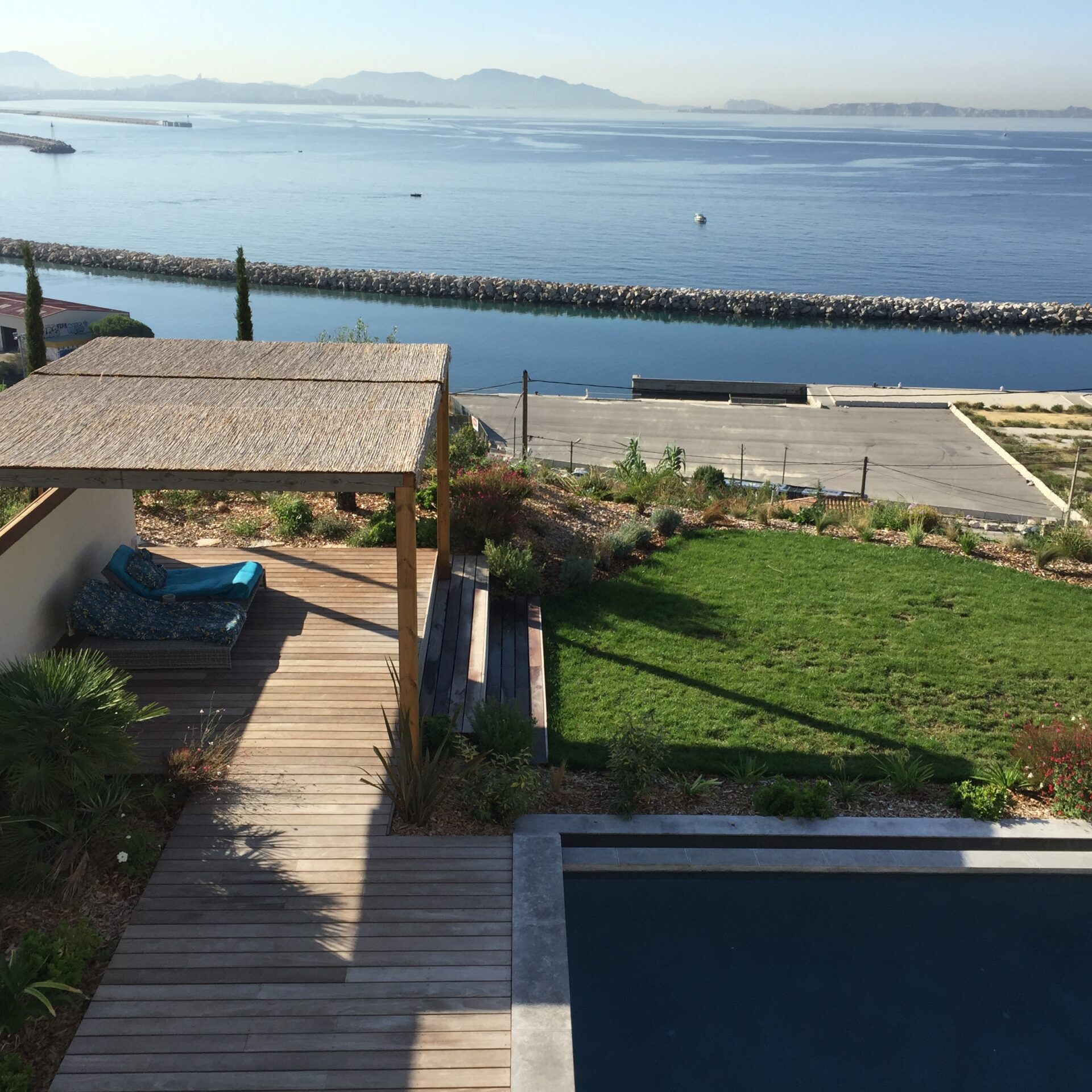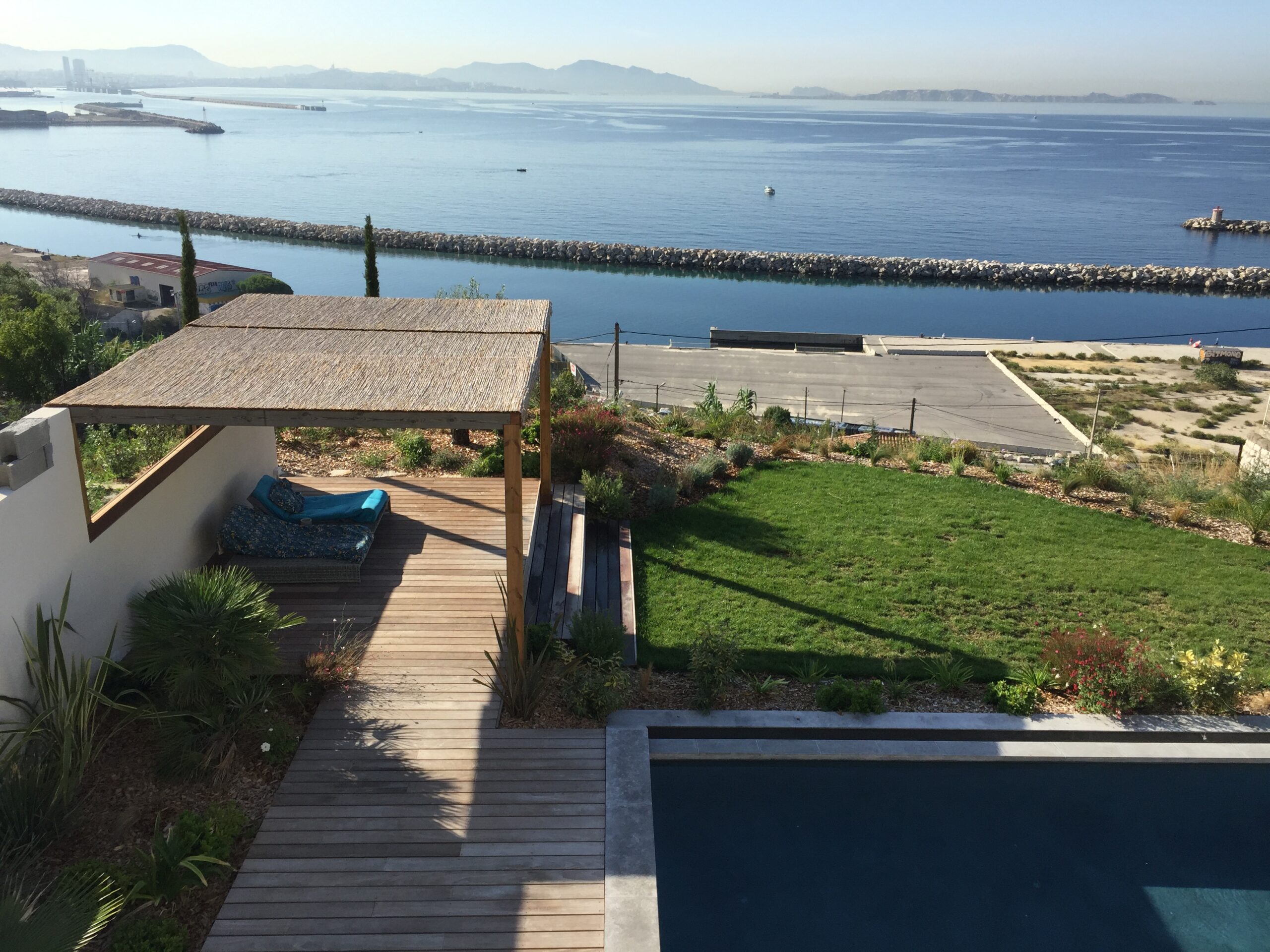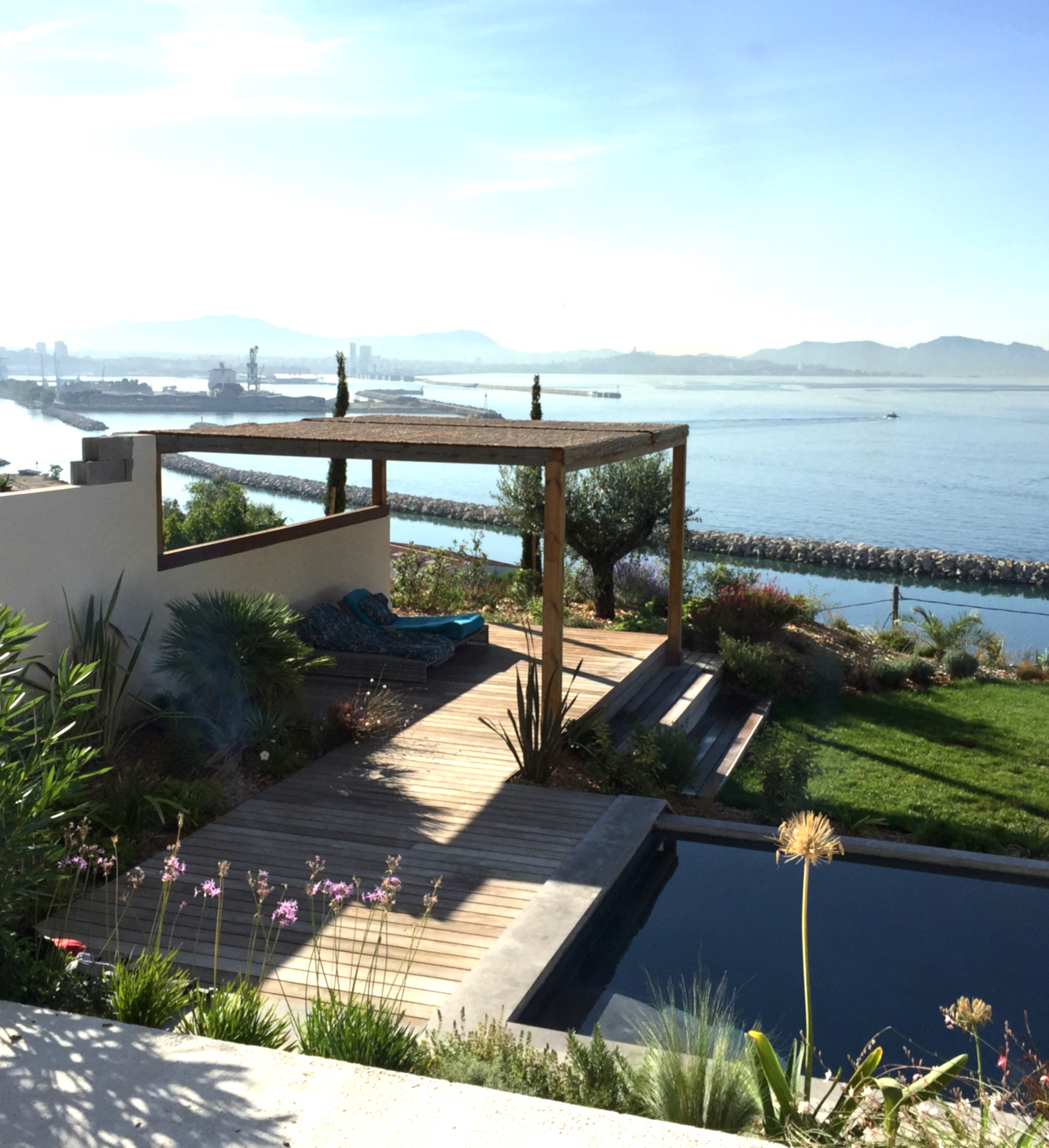 la terrasse en bois exotique et sa pergola, une avancée sur le paysage, un salon orienté vers la côte bleue.