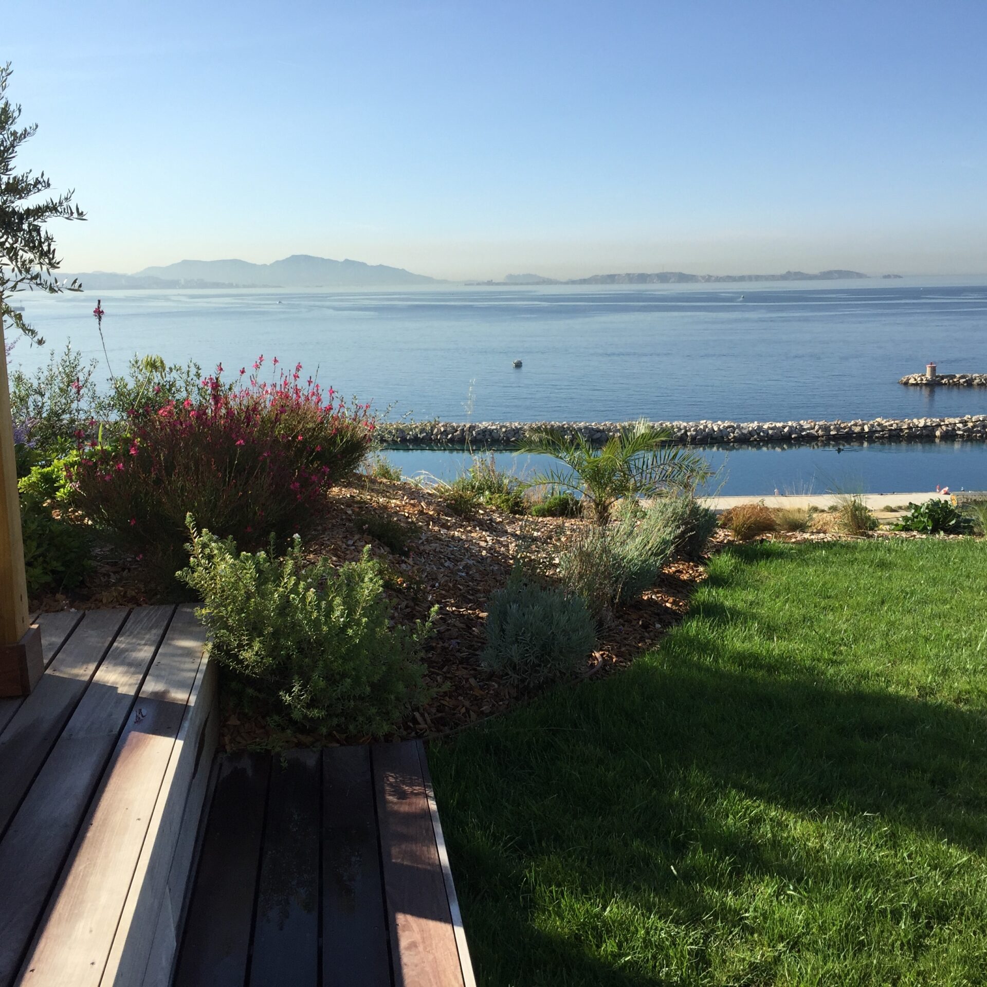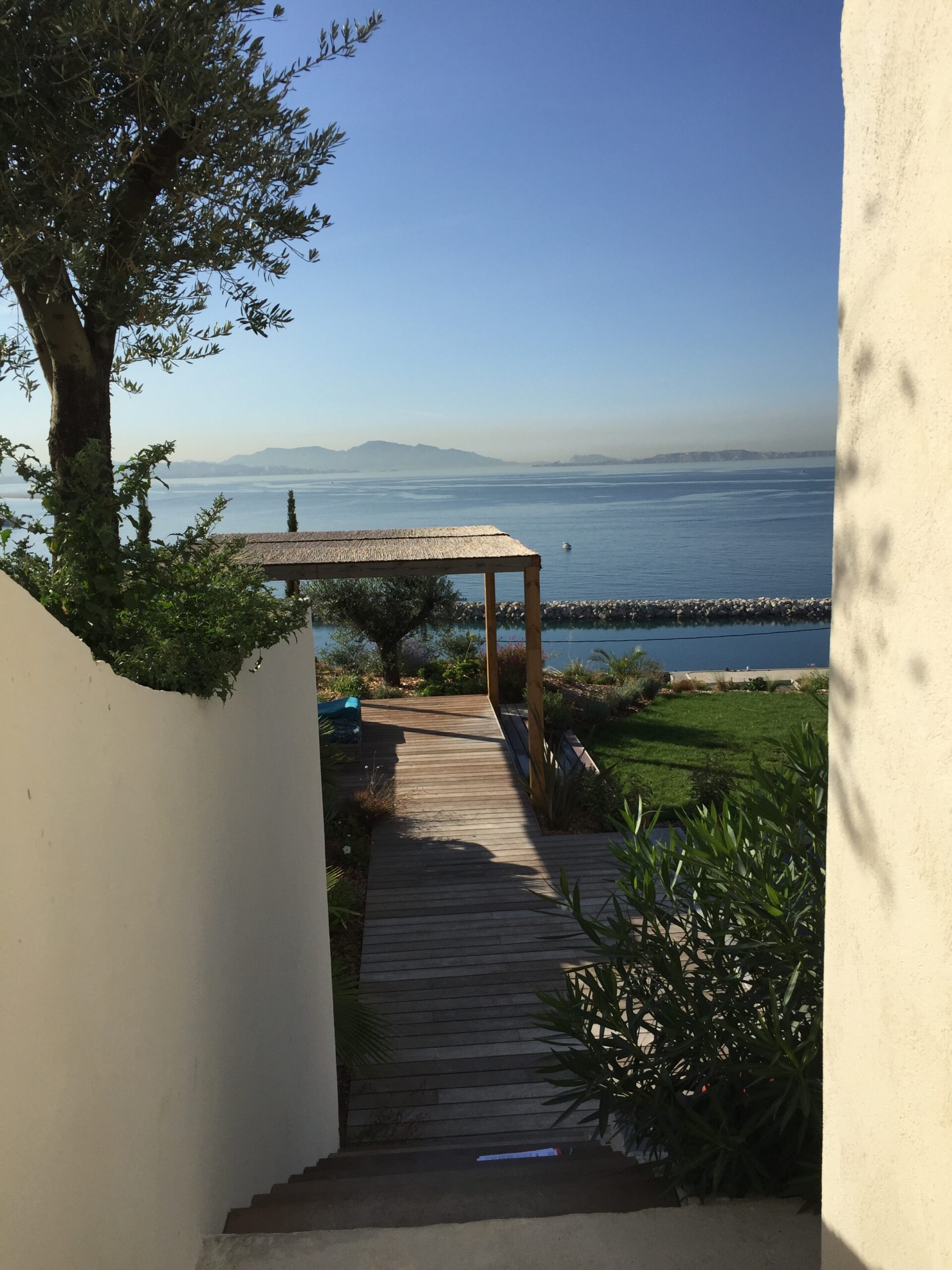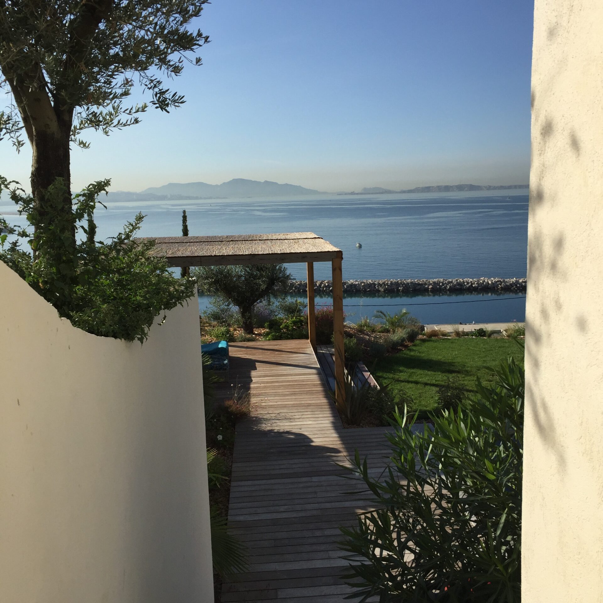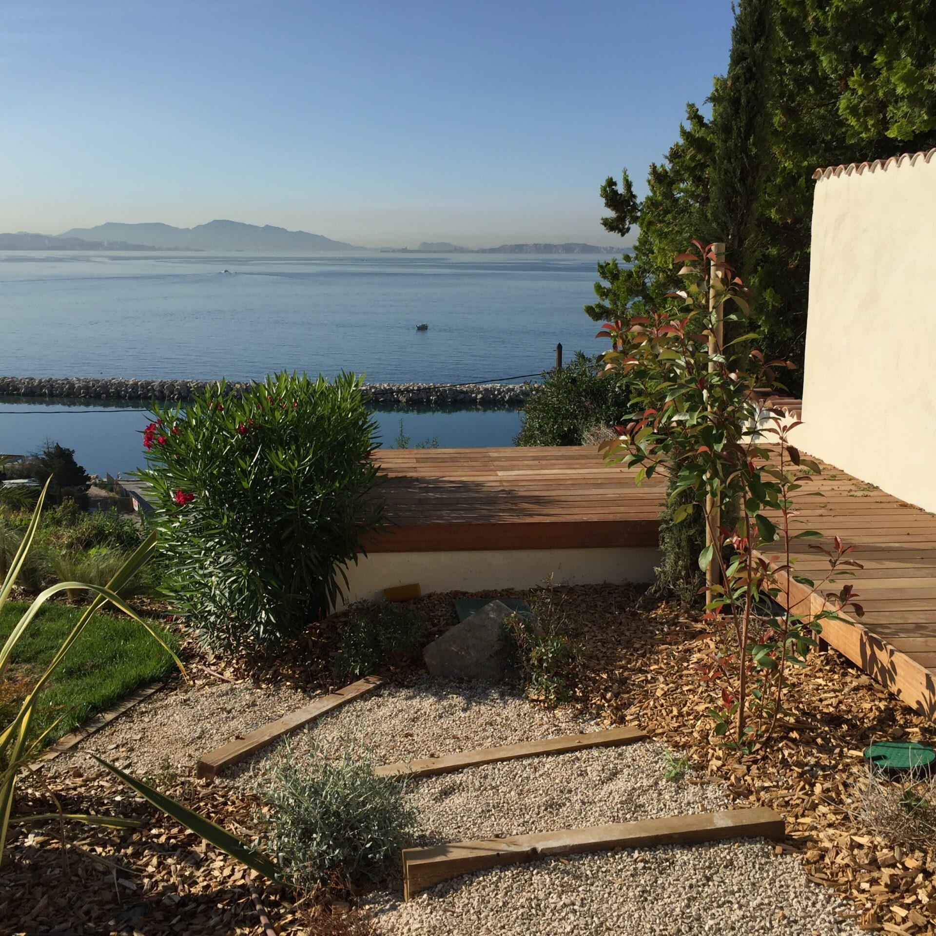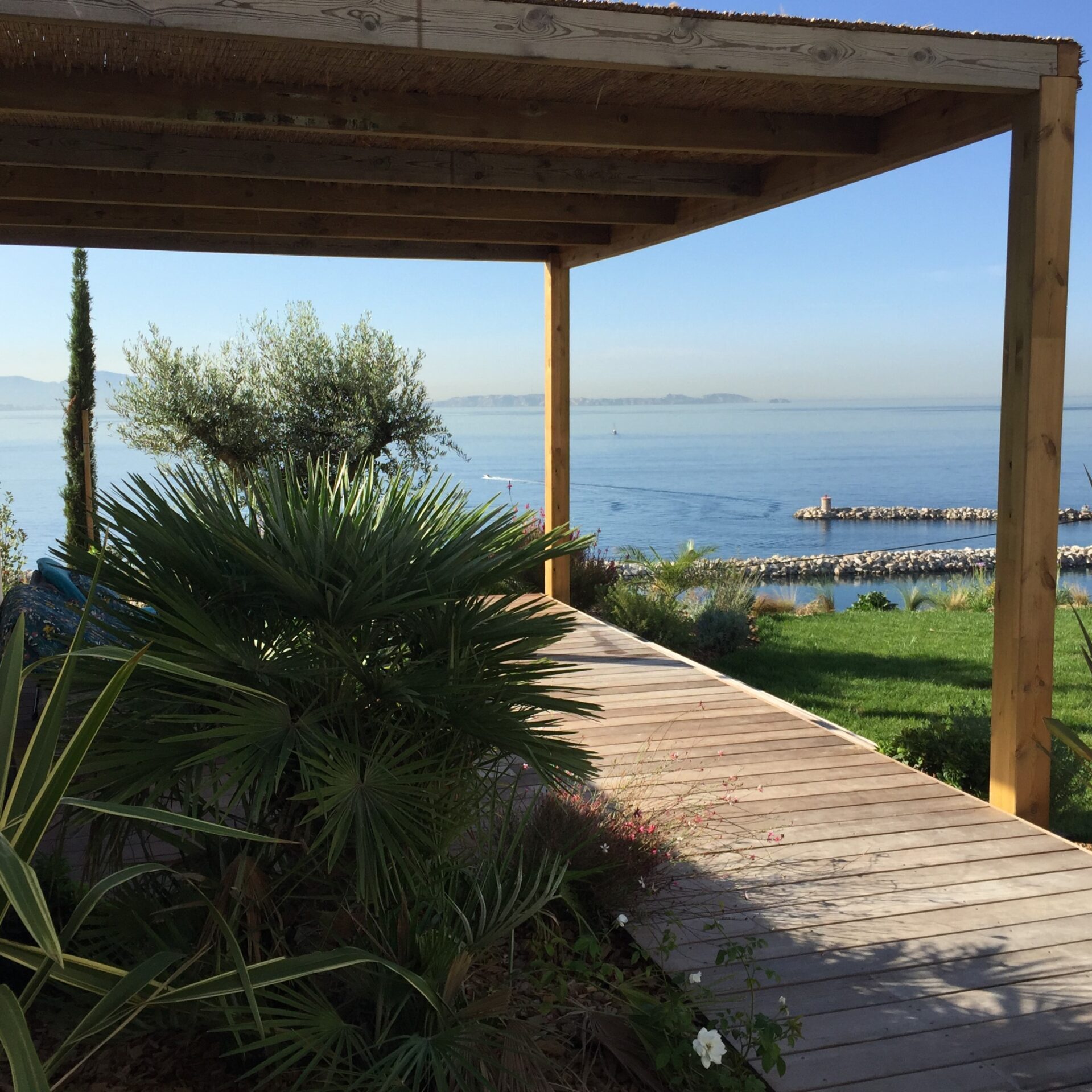 la terrasse en bois exotique et sa pergola, une avancée sur le paysage, un salon orienté vers la côte bleue.
