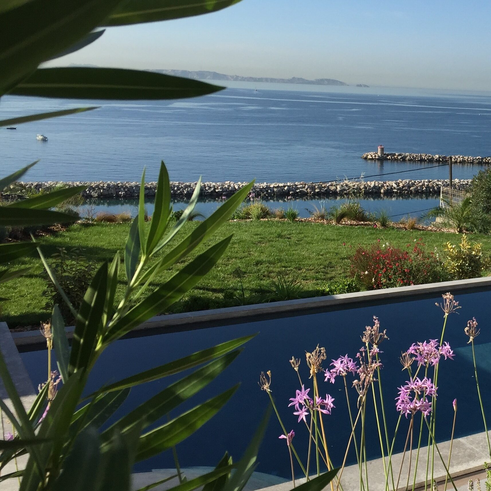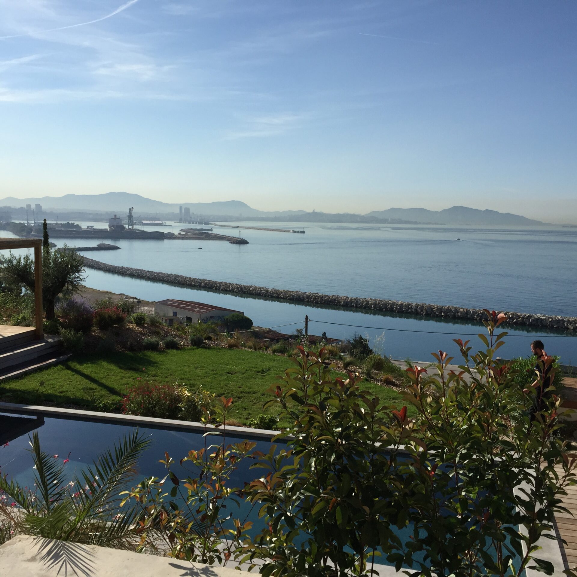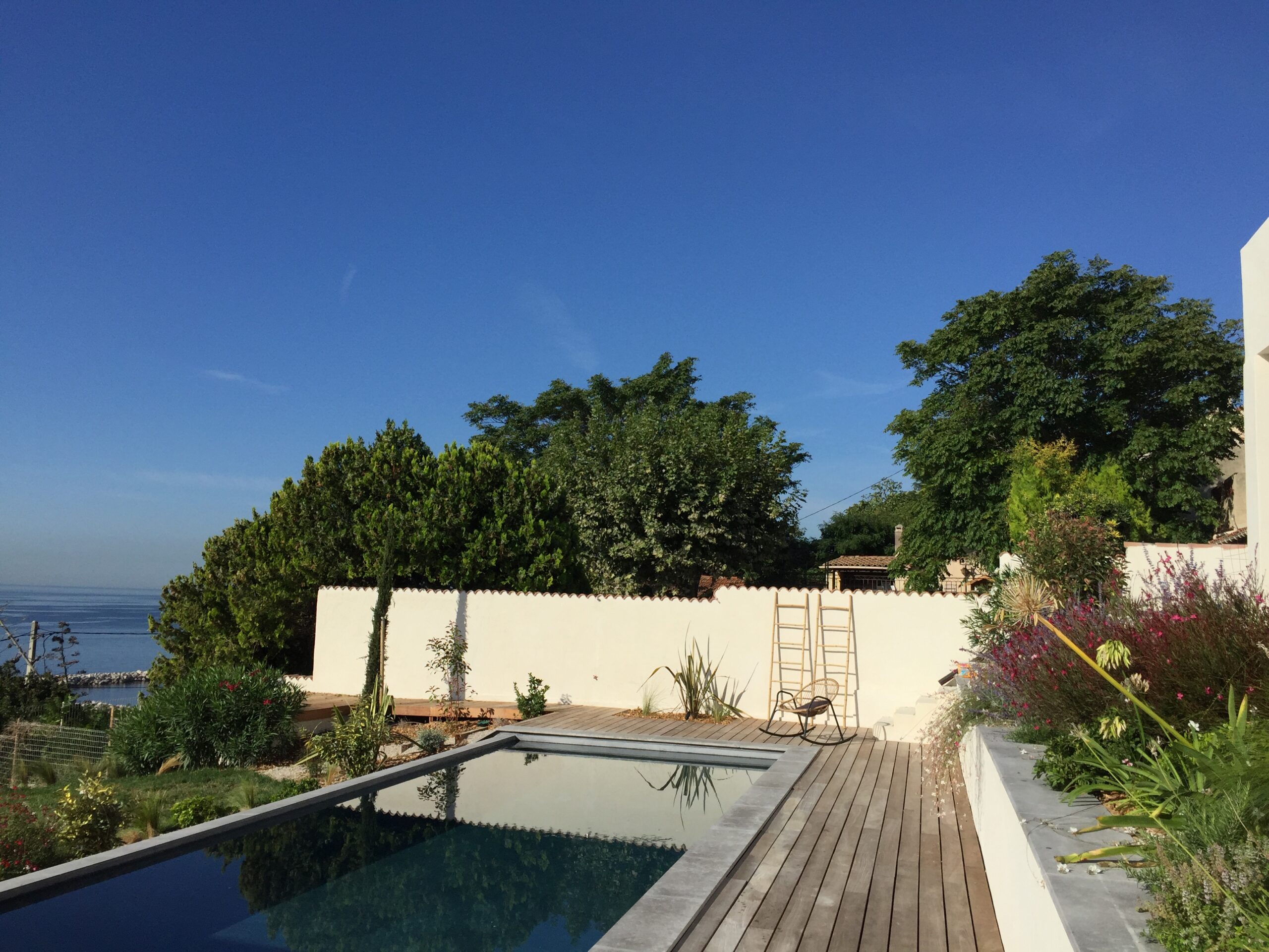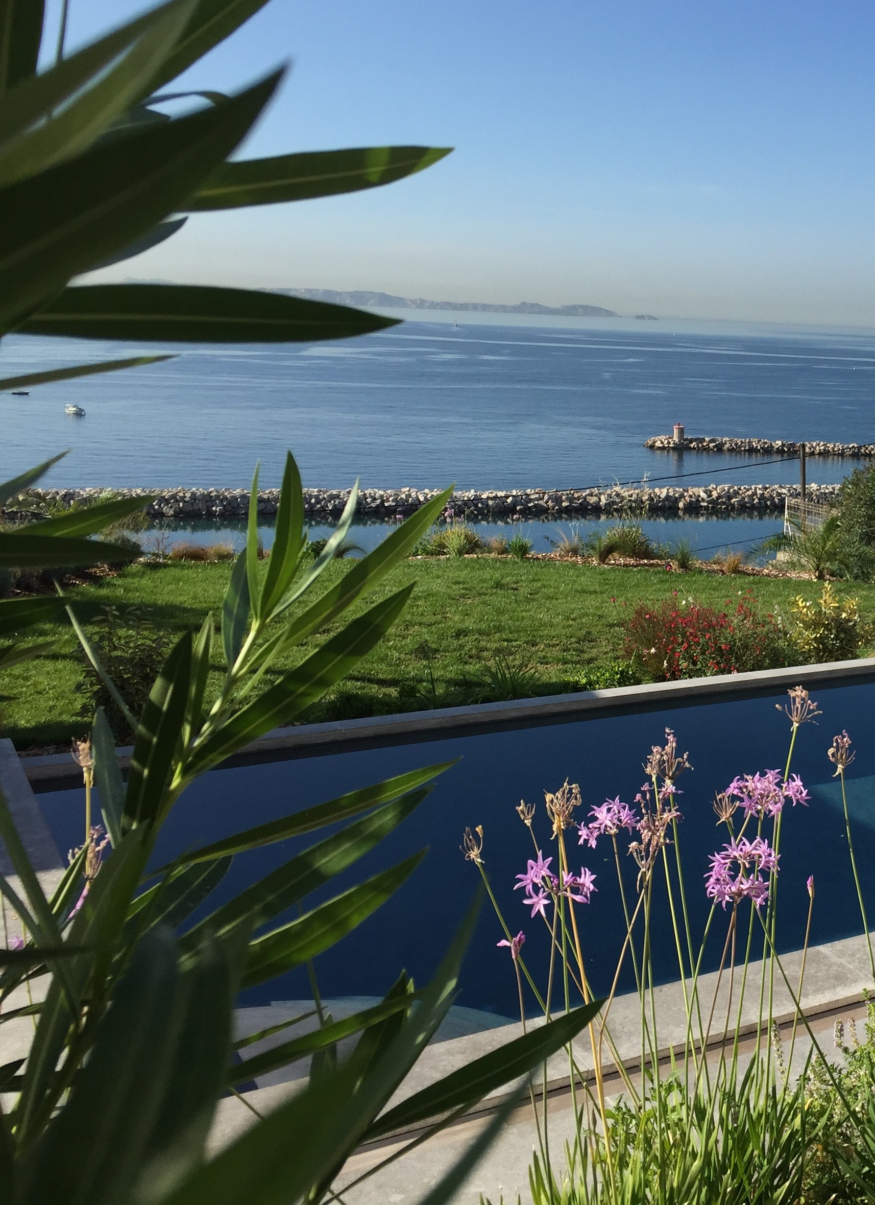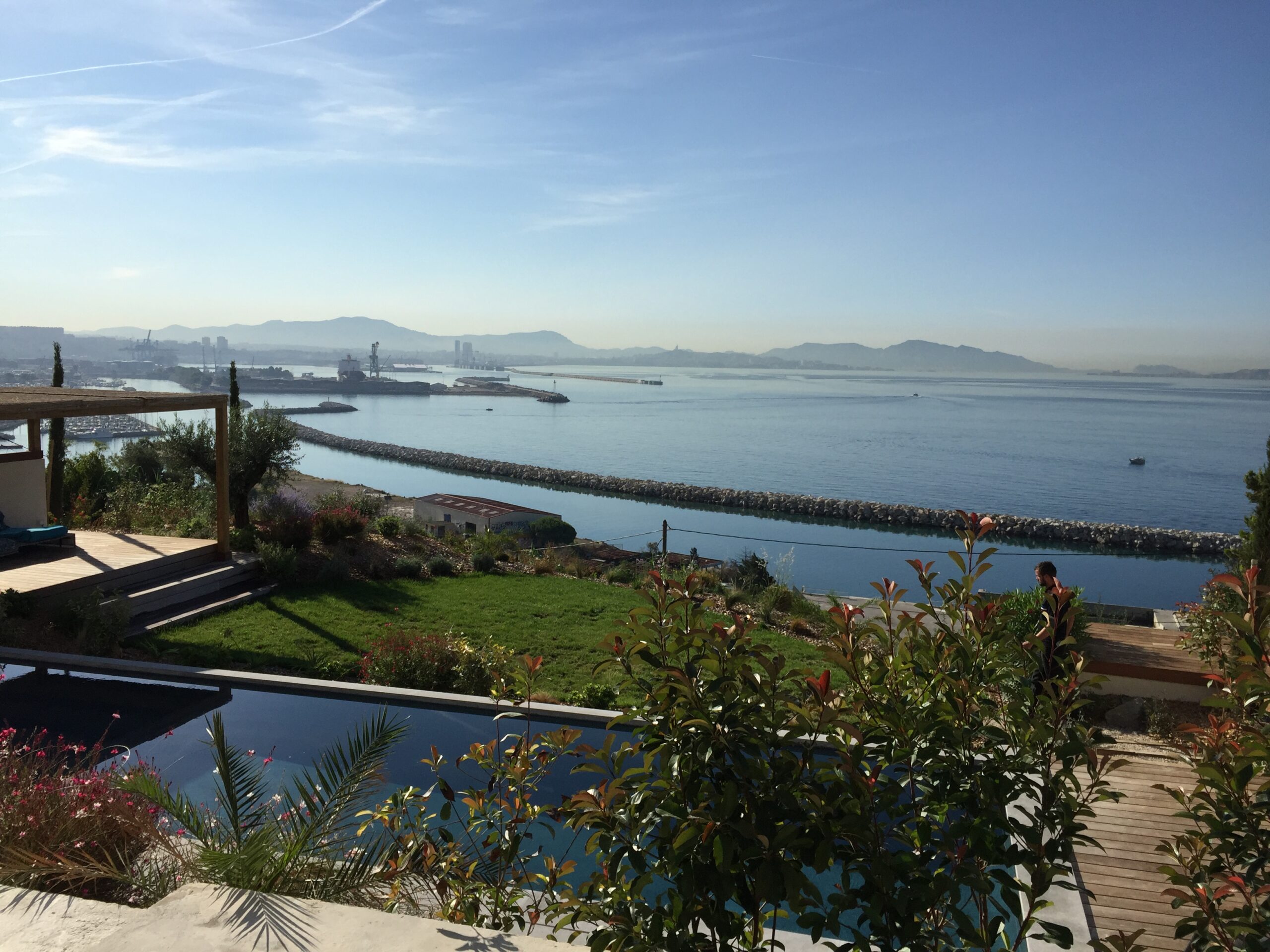 la terrasse solarium de la piscine, une vue panoramique sur la rade de Marseille, Les cyprès en limite du terrain orientent le regard vers la mer tout en protégeant des vues des maisons voisines.