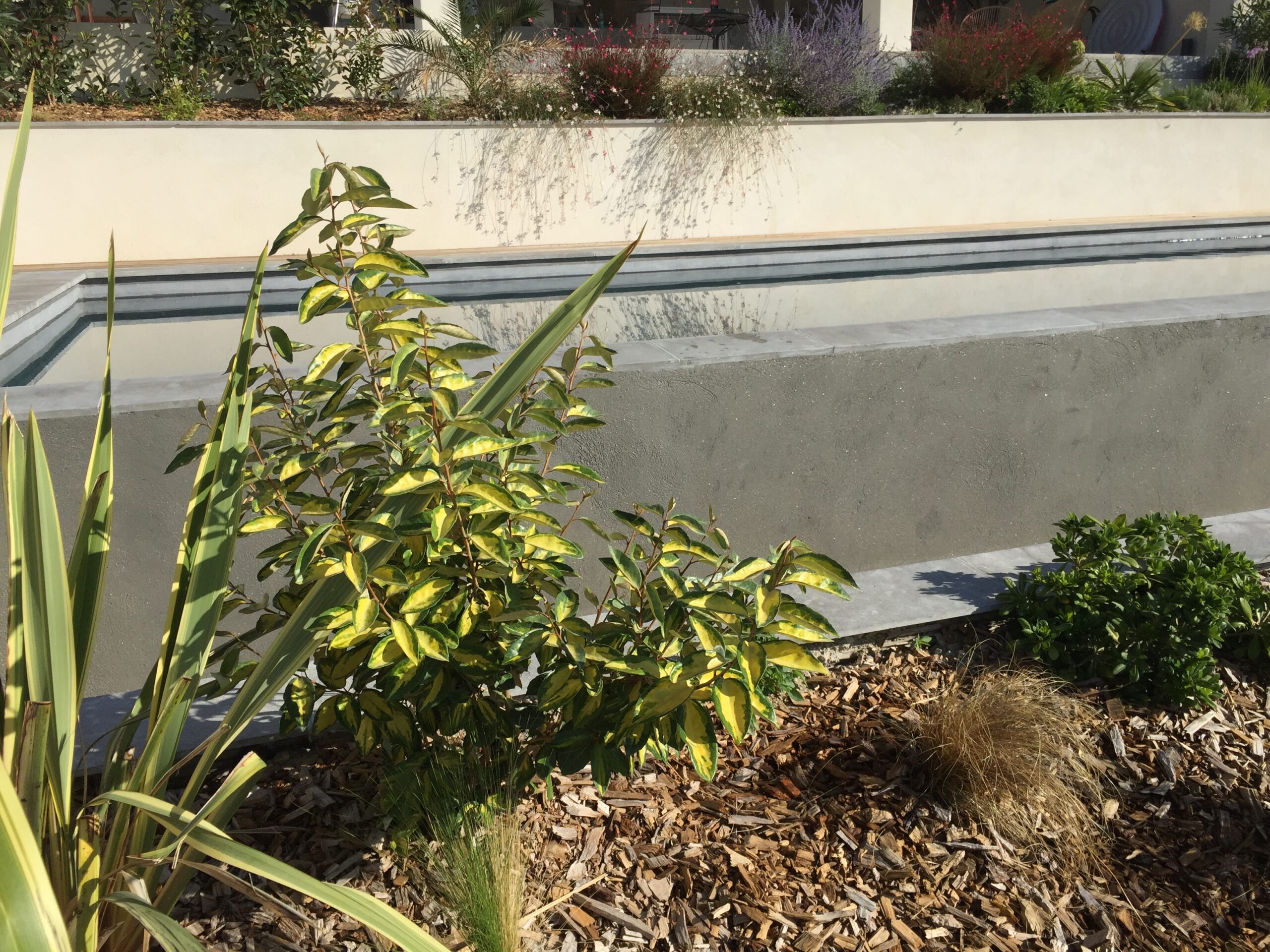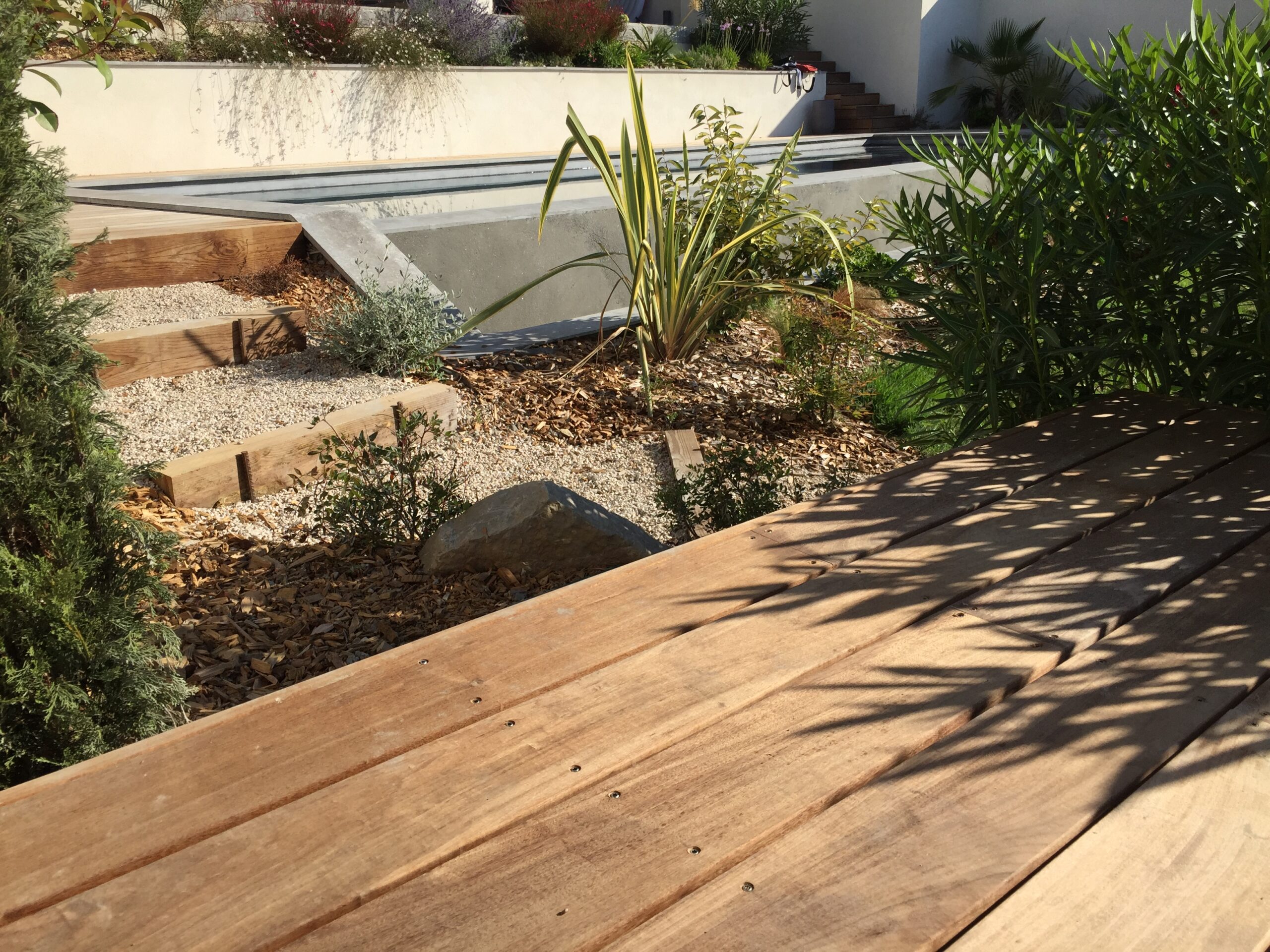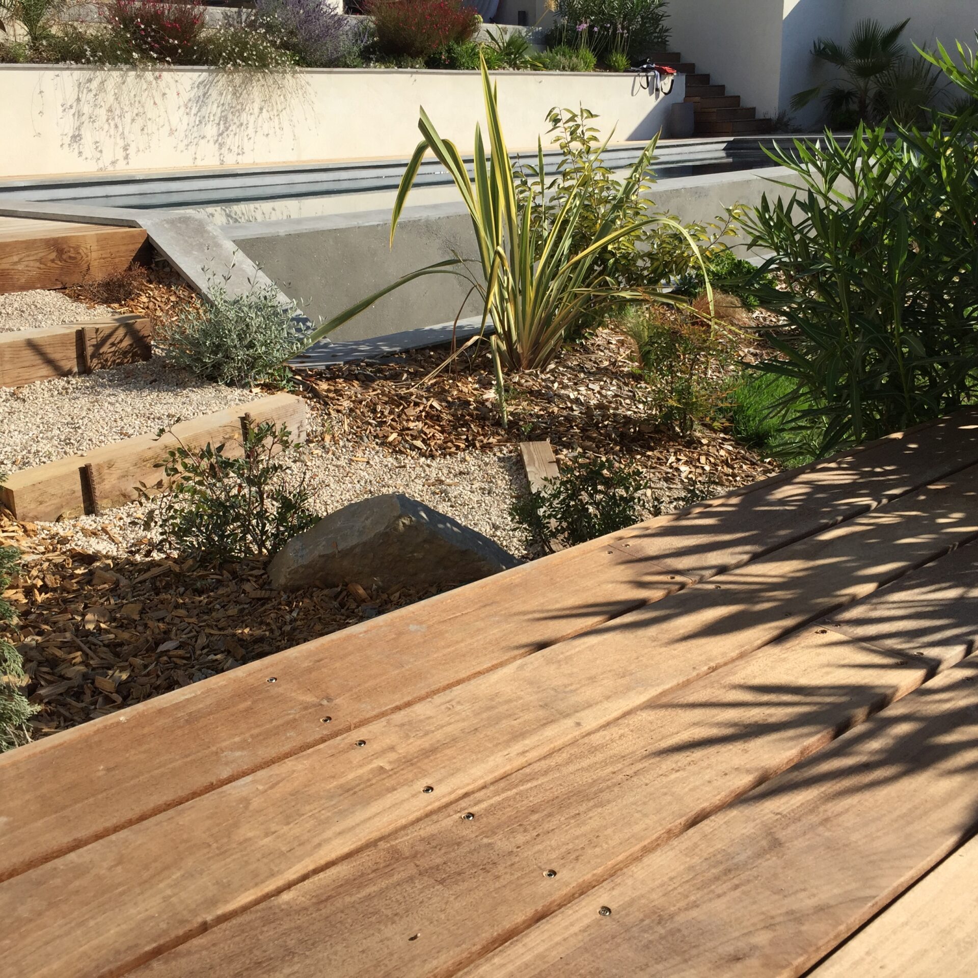 Un jardin sec devant la piscine avec les Dasyliriums, les yuccas, les palmiers, les arbustes aromatiques, un décor minéral.