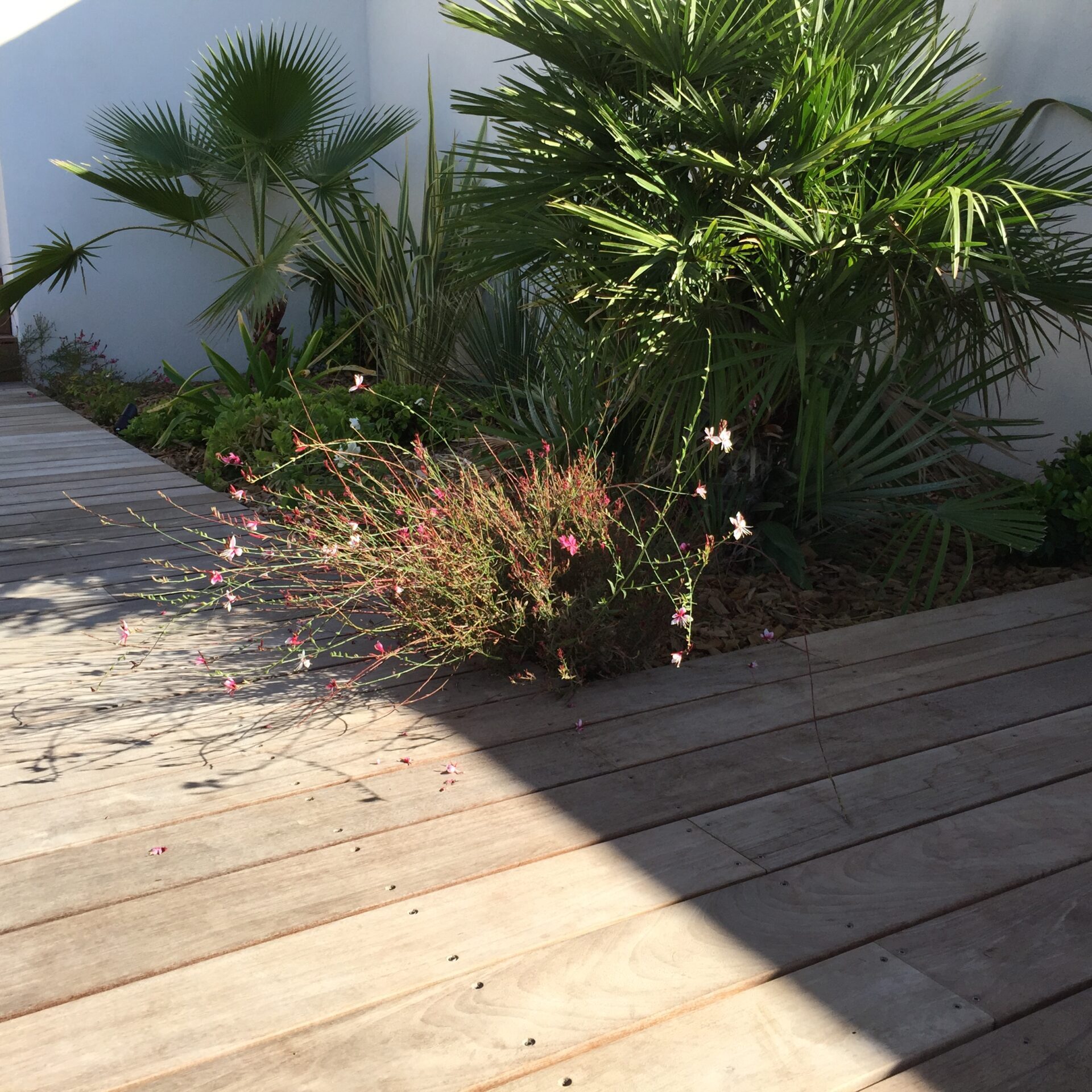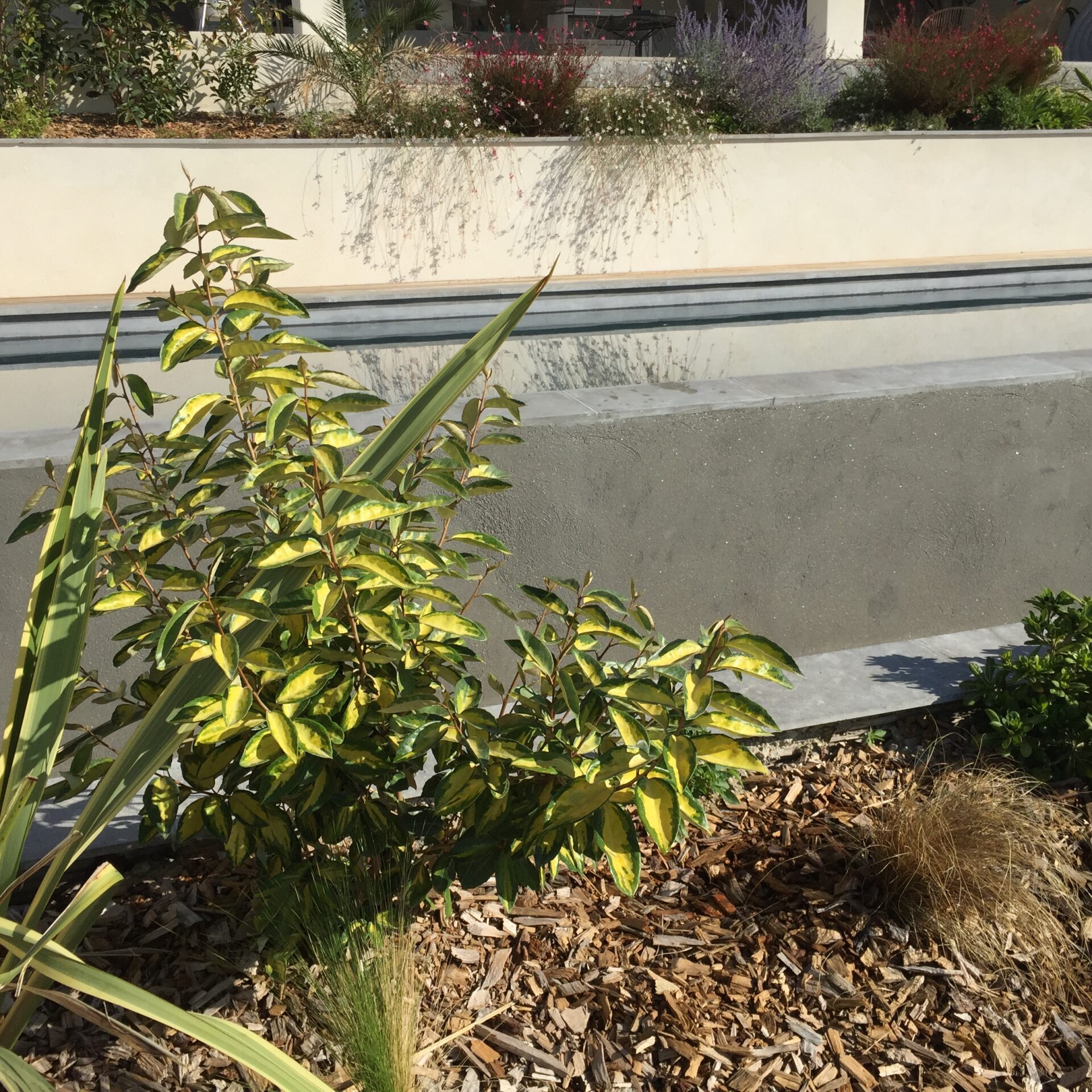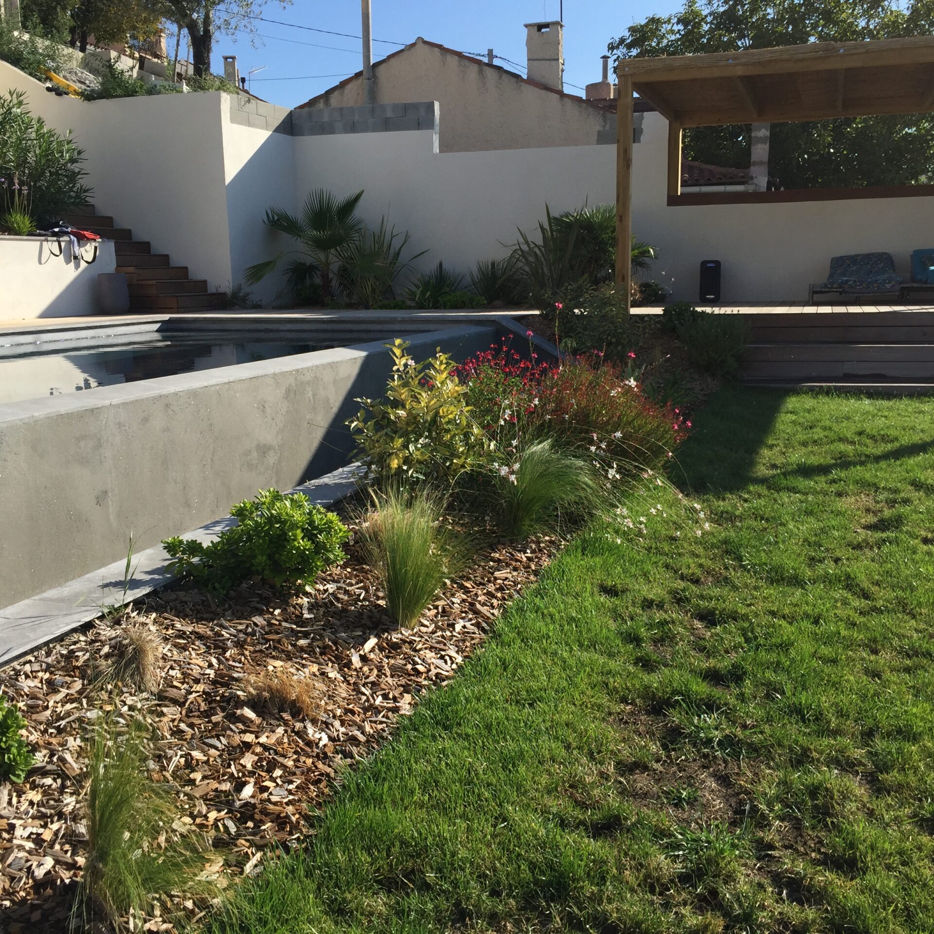 Un jardin sec devant la piscine avec les Dasyliriums, les yuccas, les palmiers, les arbustes aromatiques, un décor minéral.