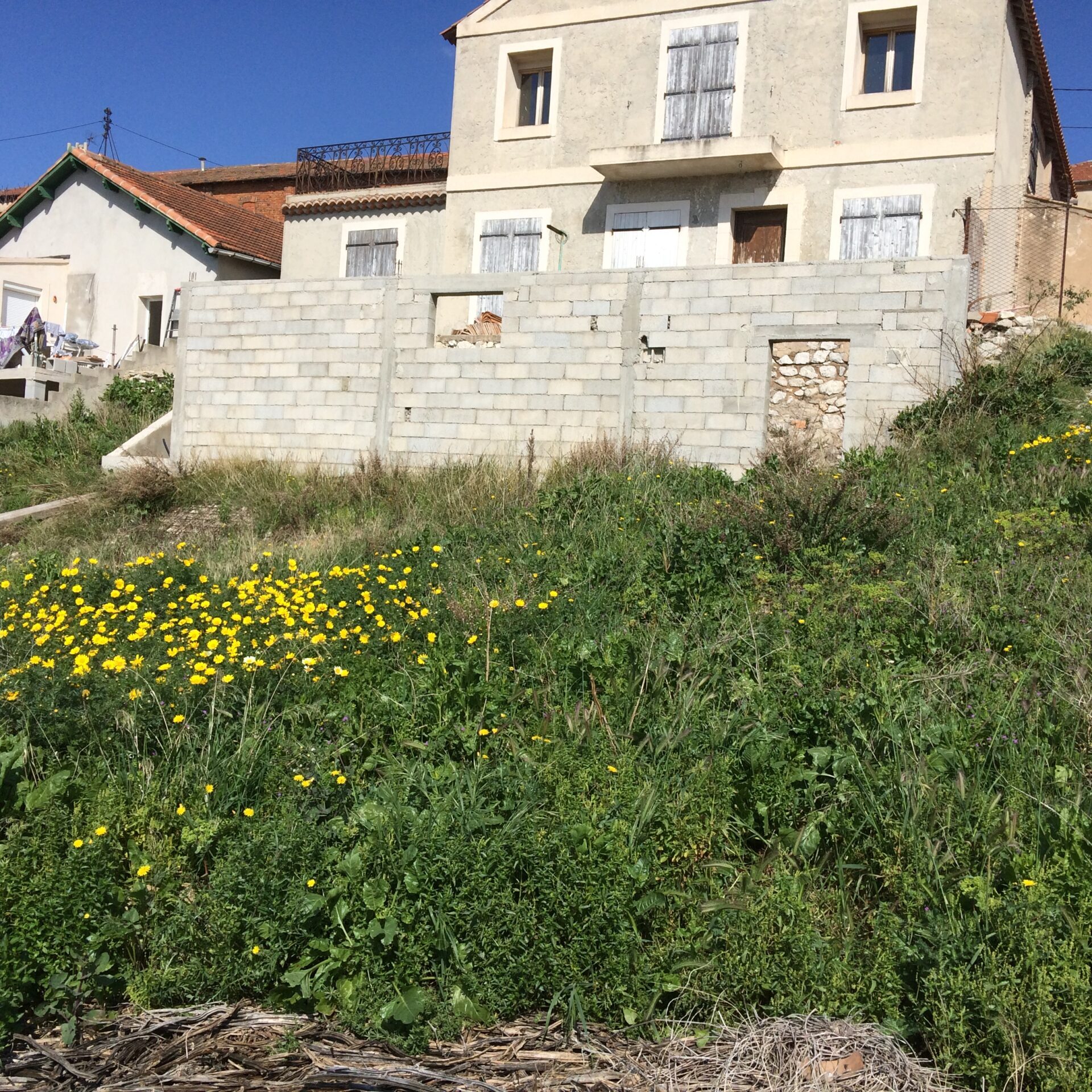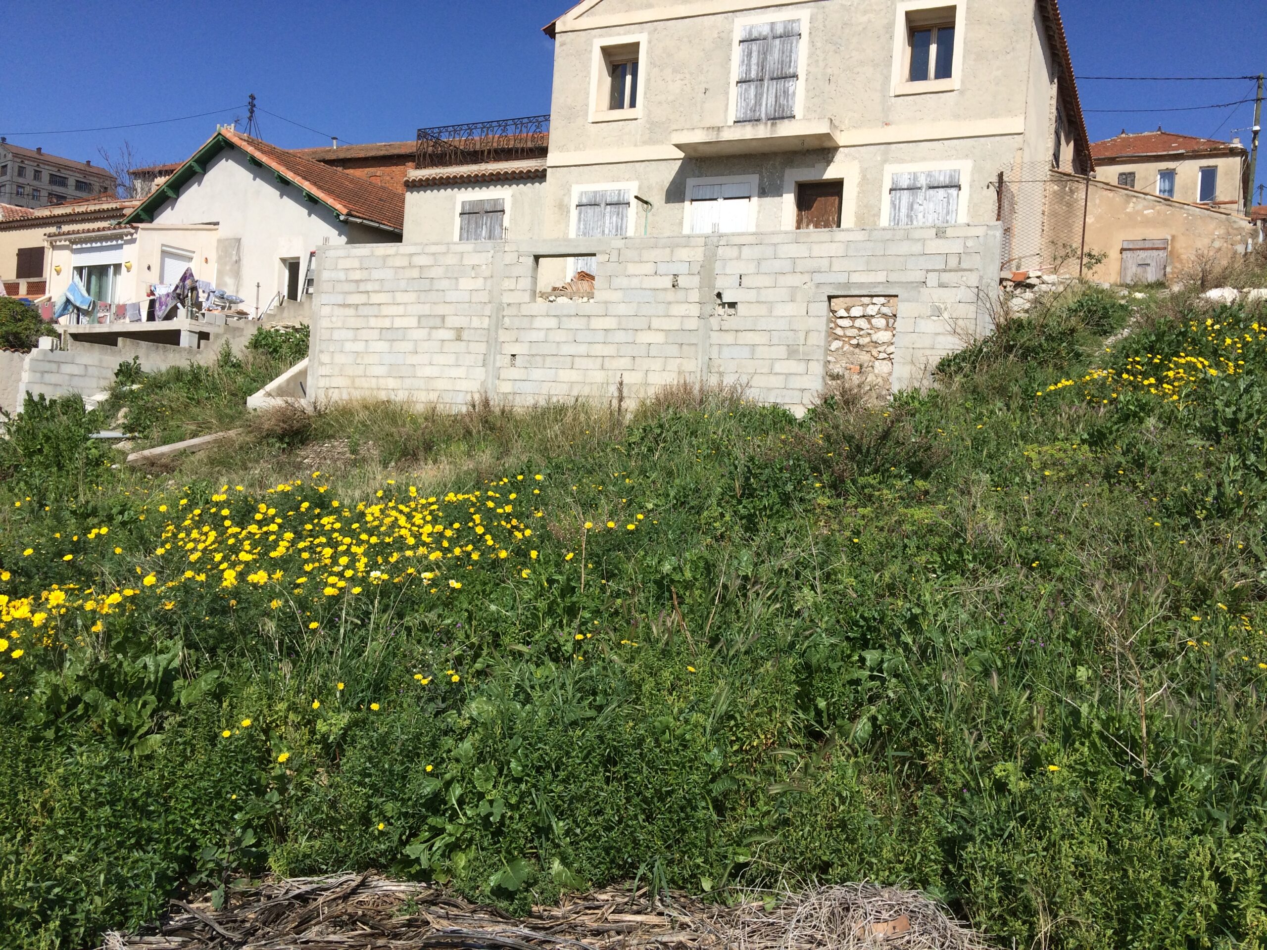 Une maison à l’Estaque, jadis une aumônerie, bénéficiant d’une vue panoramique sur la rade de Marseille, de Notre dame de la Garde à la cote bleue, sur un terrain en forte pente.