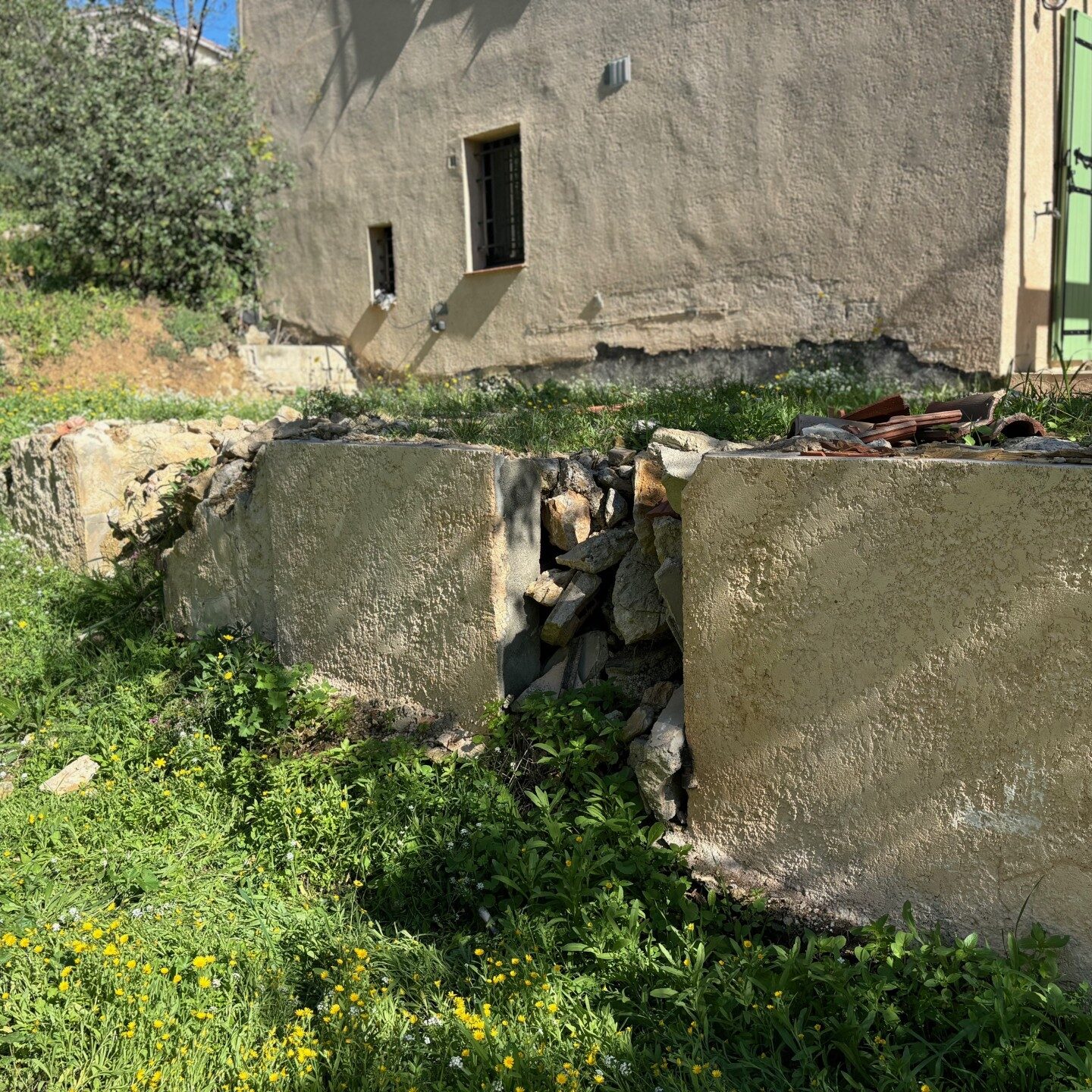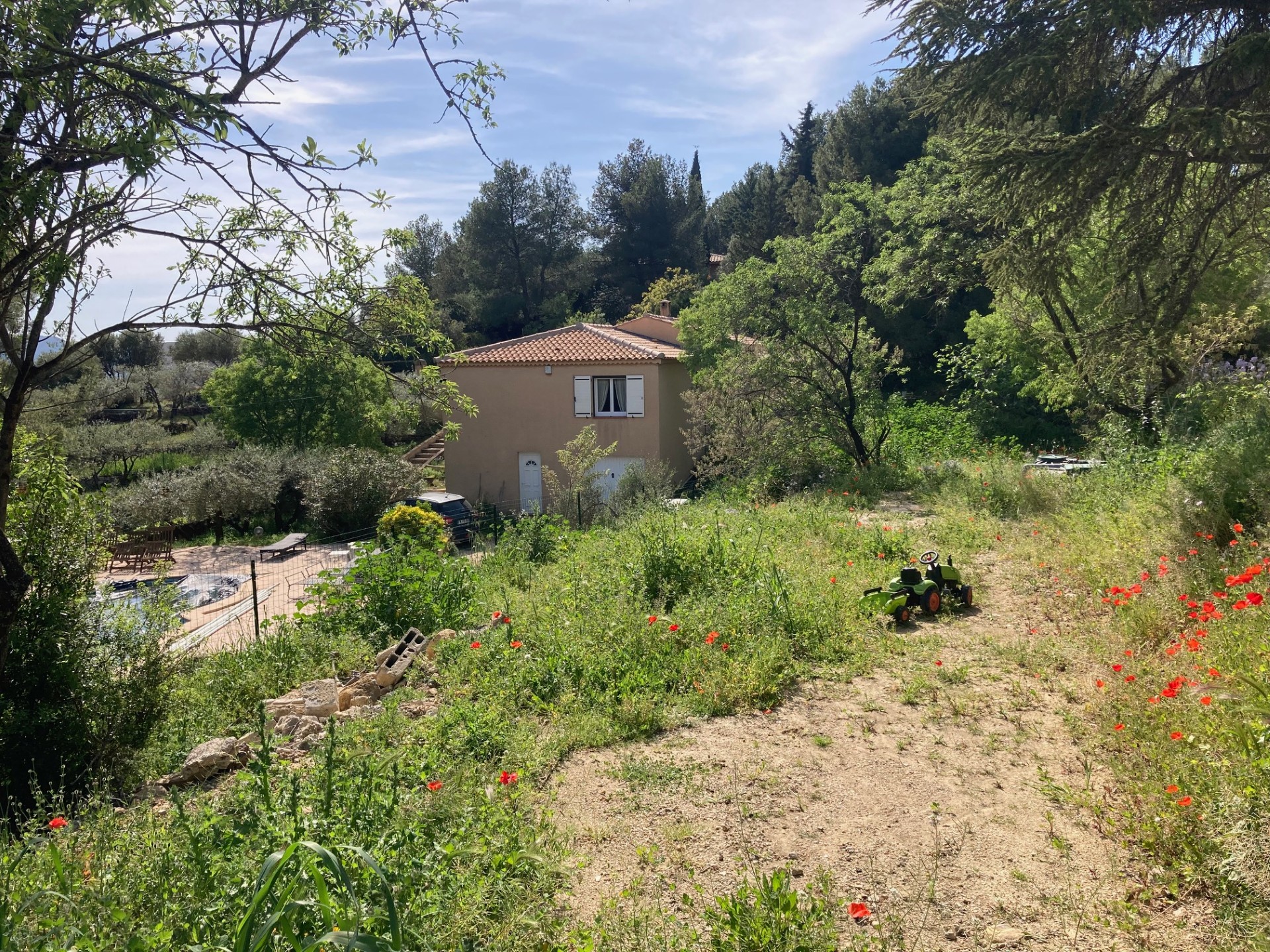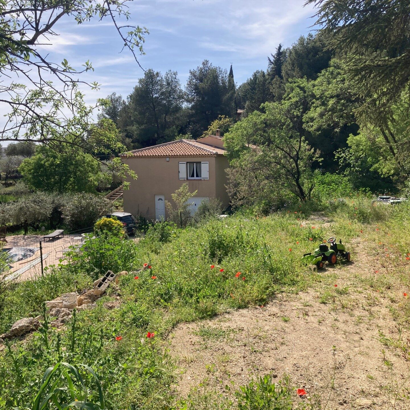 Un terrain en colline articulé autour de 3 restanques, la restanque nord, la restanque de la maison, la restanque sud avec une vue sur le lointain, un vis-à-vis très important sur la parcelle du dessous, une contrainte qui avait poussé les propriétaires à implanter la piscine à l’ouest sans vues.