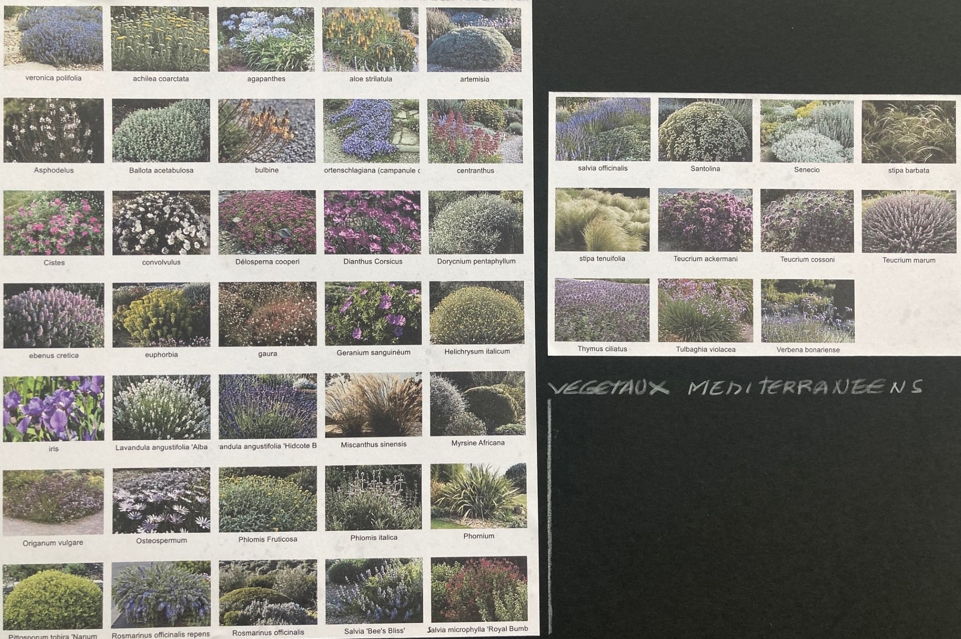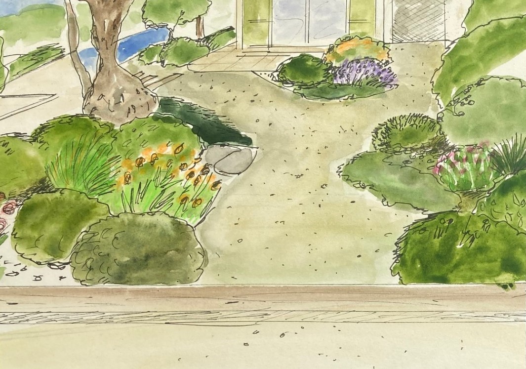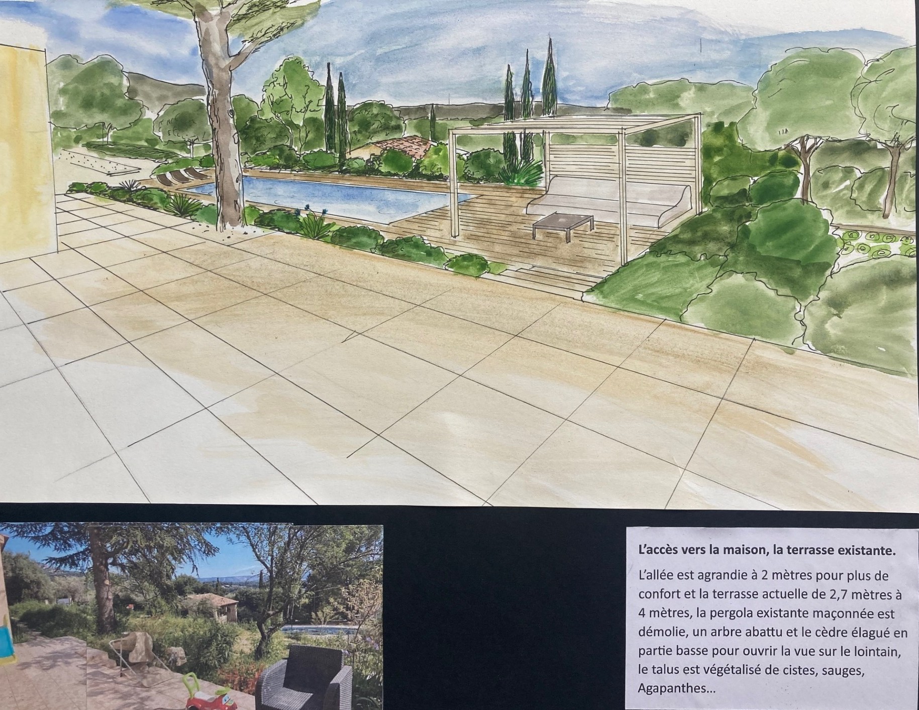 L’allée existante est agrandie à 2 mètres, un arbre est abattu, le cèdre élagué pour dégager la vue sur le lointain, le talus est végétalisé de cistes, sauges, agapanthes…