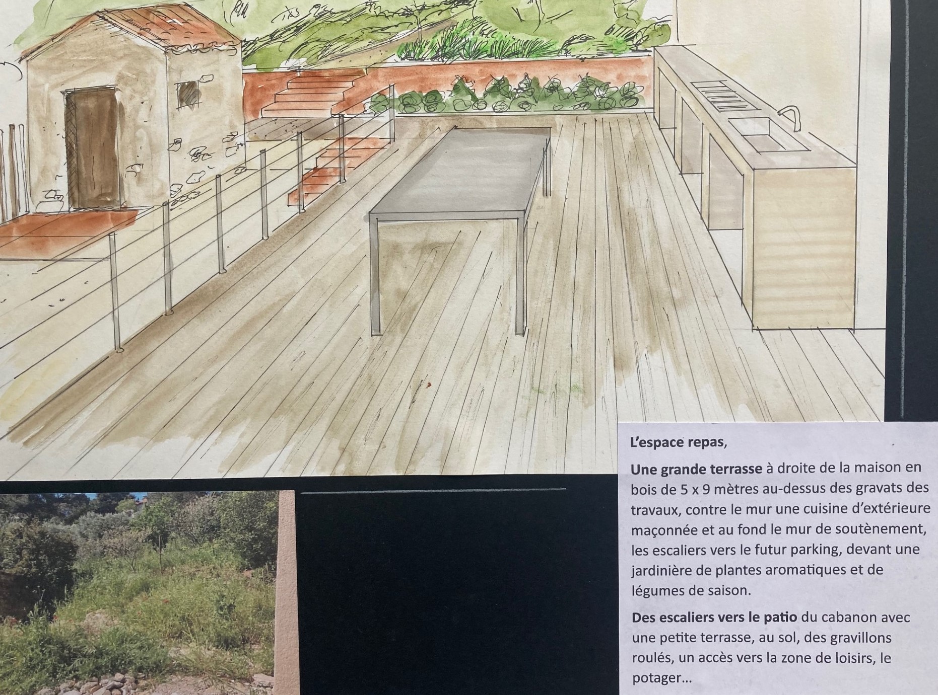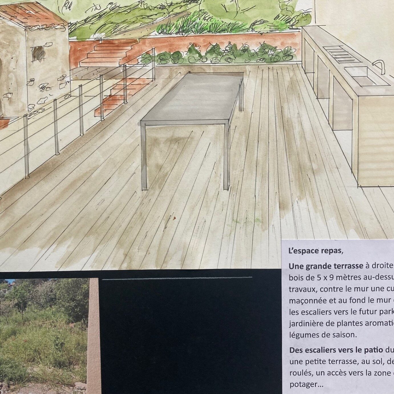 L’espace repas, la cuisine extérieure, une grande terrasse en bois de 45 m2 au-dessus des gravats de la rénovation, une cuisine extérieure contre le mur de la façade.